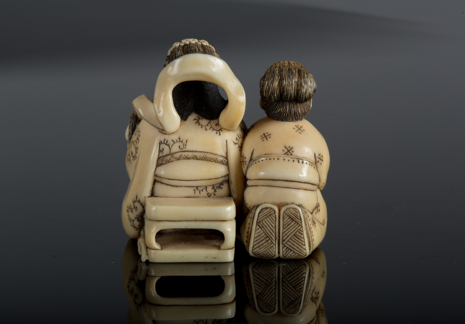 Arte Giapponese Netsuke in avorio raffigurante due dame di cui una con...