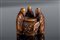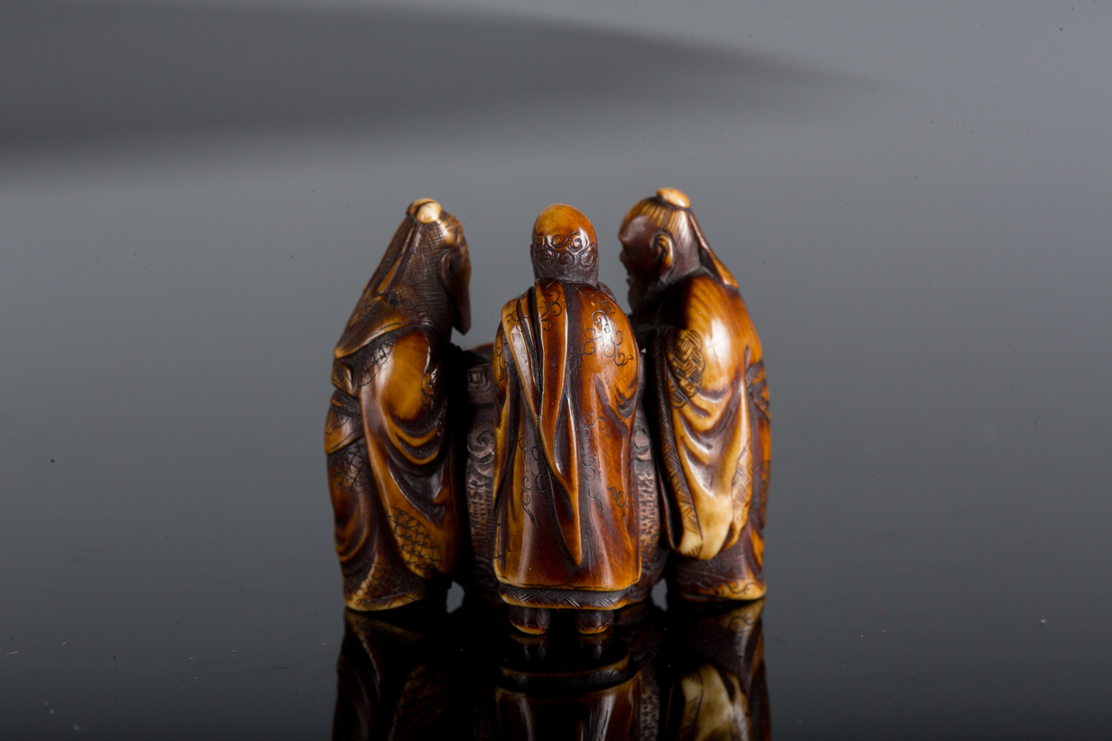Arte Giapponese Netsuke in avorio raffigurante tre personaggi intorno ad un...