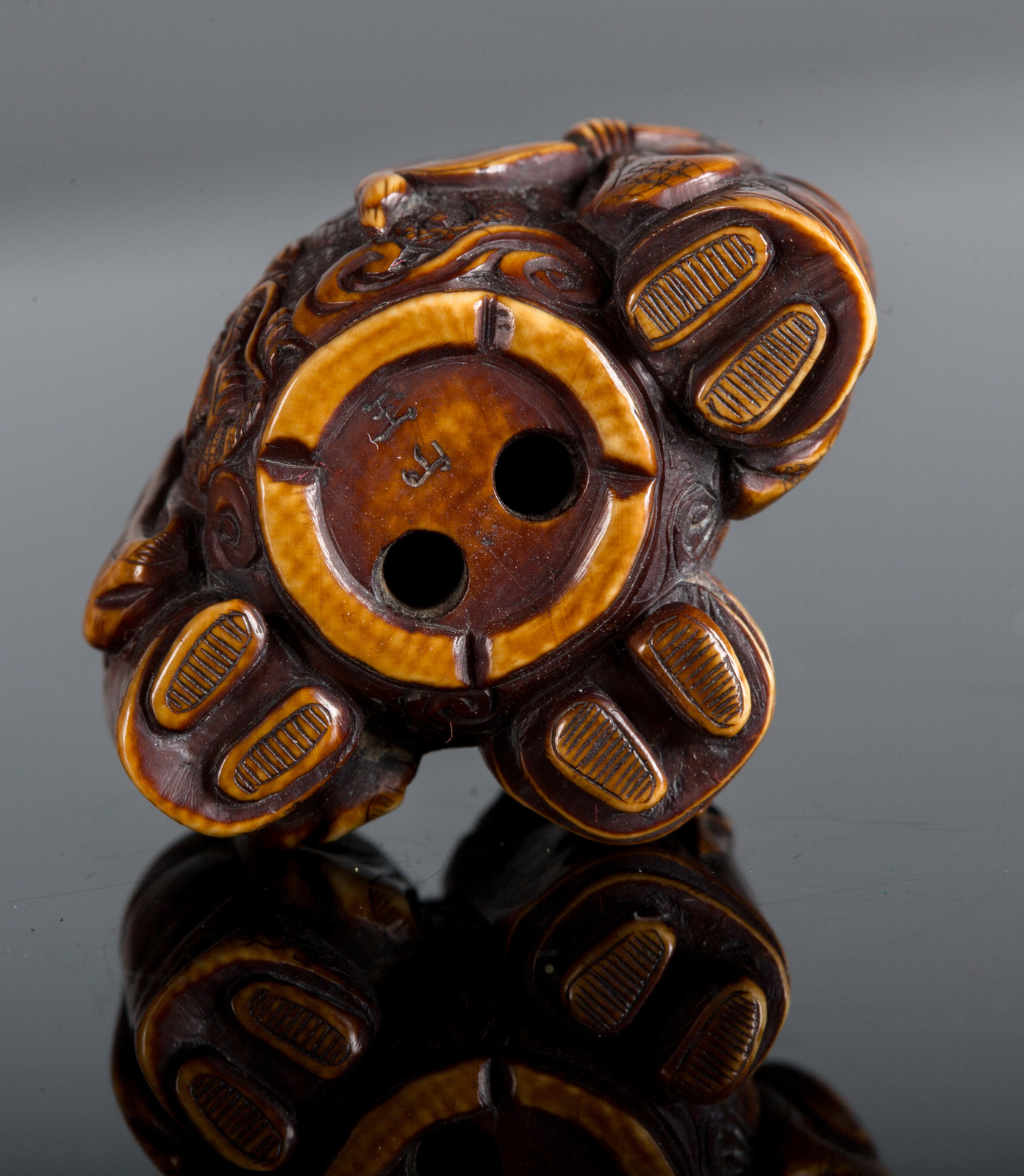 Arte Giapponese Netsuke in avorio raffigurante tre personaggi intorno ad un tronco: Firmato Masa Yana sulla base