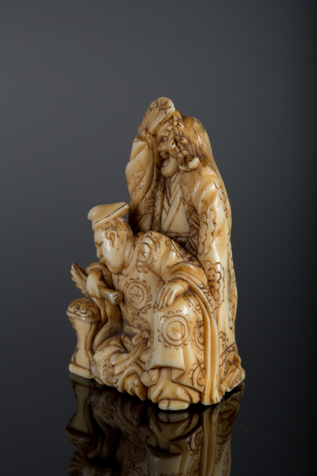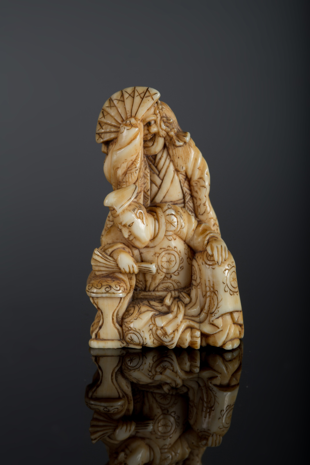 Arte Giapponese Netsuke in avorio raffigurante un Samurai dietro un uomo seduto firmato da Masa Mori Giappone, XIX secolo . -. Cm 4,50.