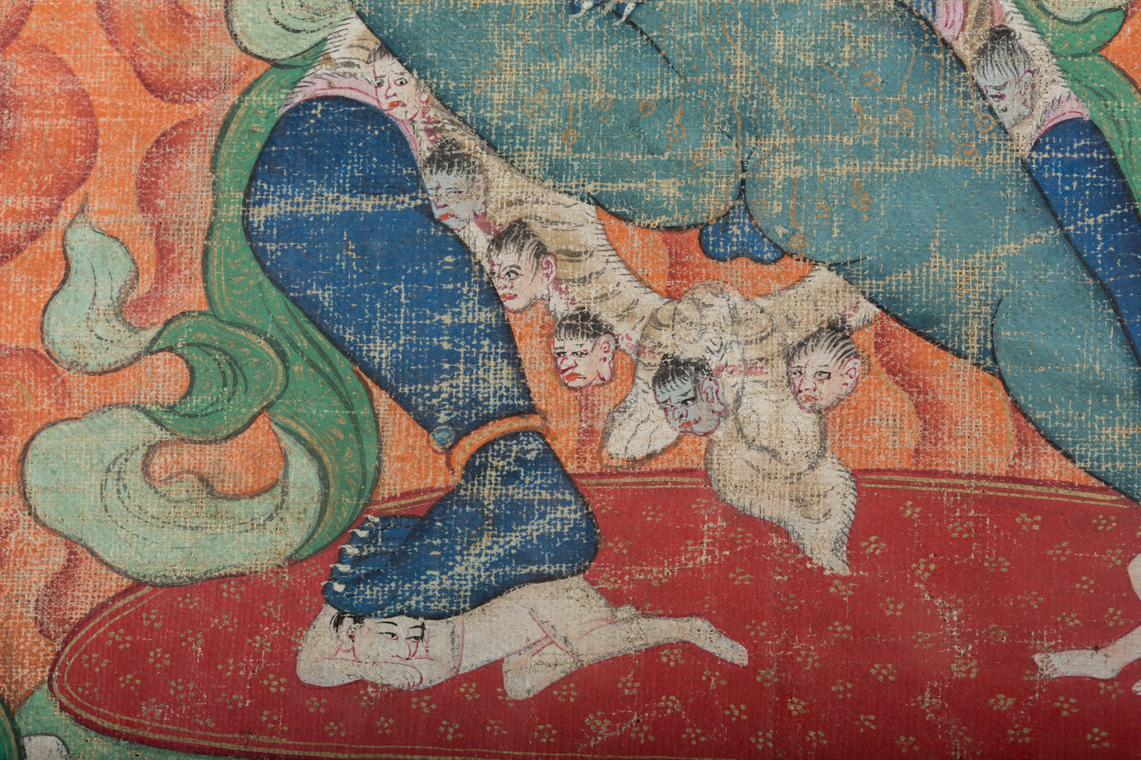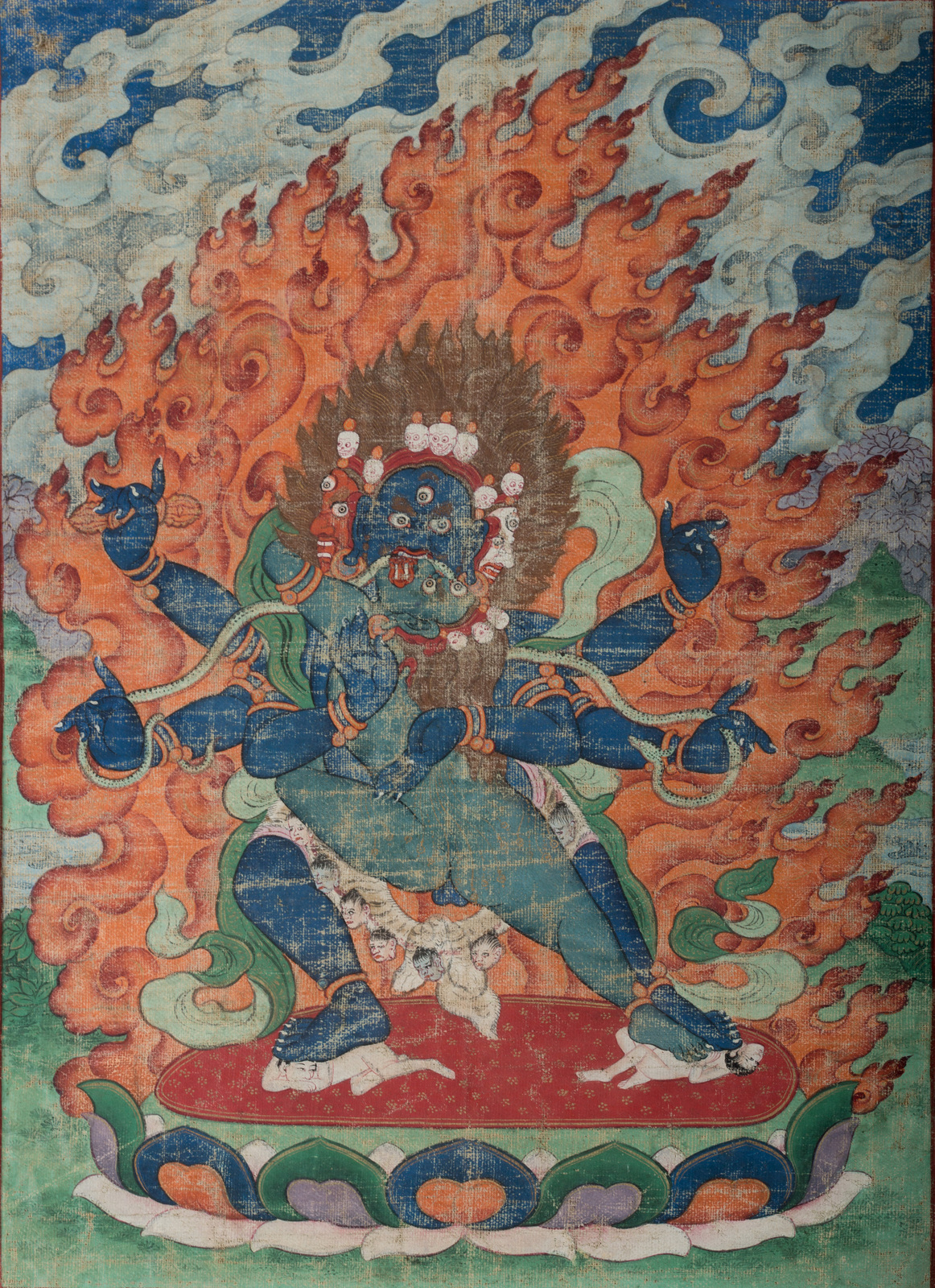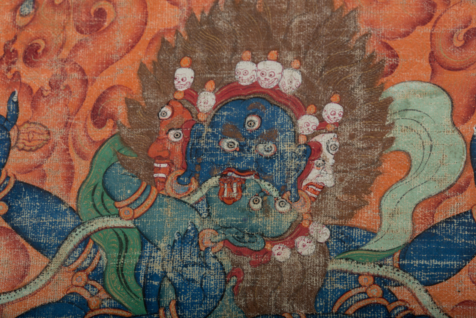 Tibet, XVIII - XIX secolo . -. Cm 28,00 x 39,50. Thangka raffigurante una particolare forma tantrica irata del Bodhisattva Vajrapāṇi, che qui prende il nome di Mahācakra (Ḥkhor-lo-chen-po). Inserito in volute di fiamme e fumi, é dotato di tre volti (blu, rosso e bianco) ciascuno dei quali ha in fronte un terzo occhio. E' caratterizzato inoltre da un serpente che tiene con la sua bocca principale, e che si avvinghia a due delle sei braccia. Porta con se un Vajra e stringe al petto una compagna legata in yab-yum, anch'essa dalla pelle blu, la quale generalmente dovrebbe innalzare una kapāla.