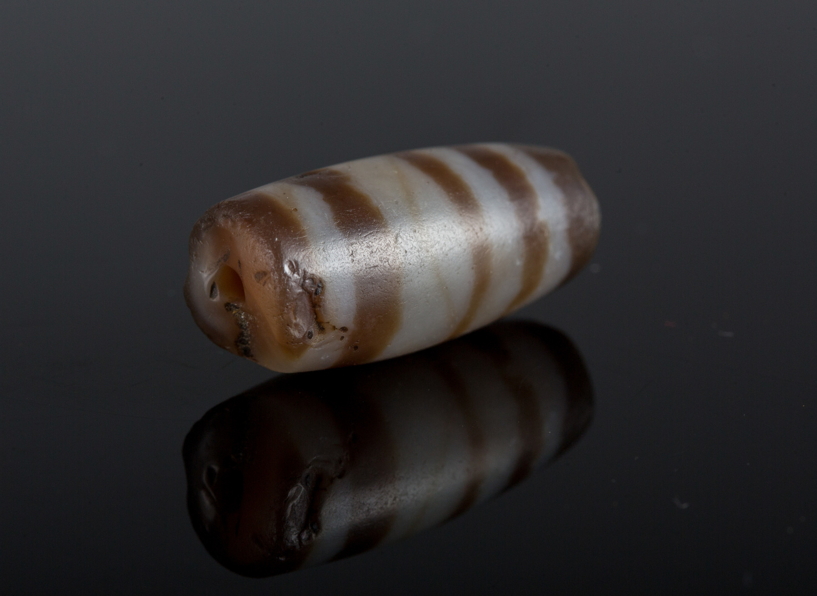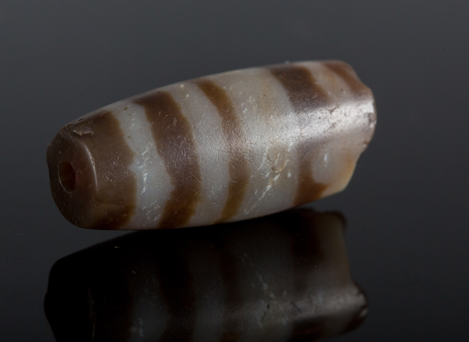 Arte Himalayana Chung-dzi di scavo in pietra bruna Tibet. -. Cm 2,50. Realizzata in agata marrone con patinatura generata dal tempo e recante quattro bande.