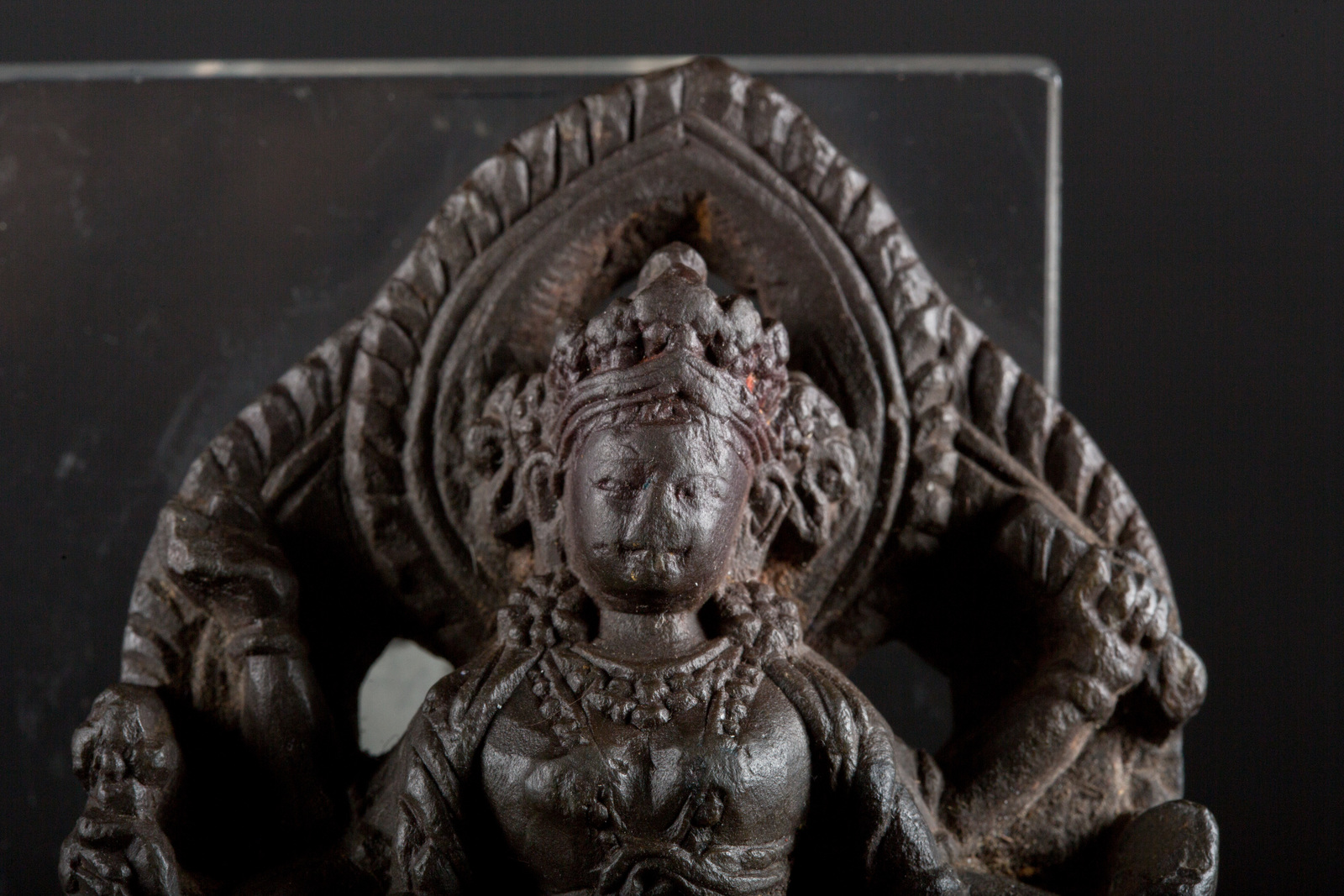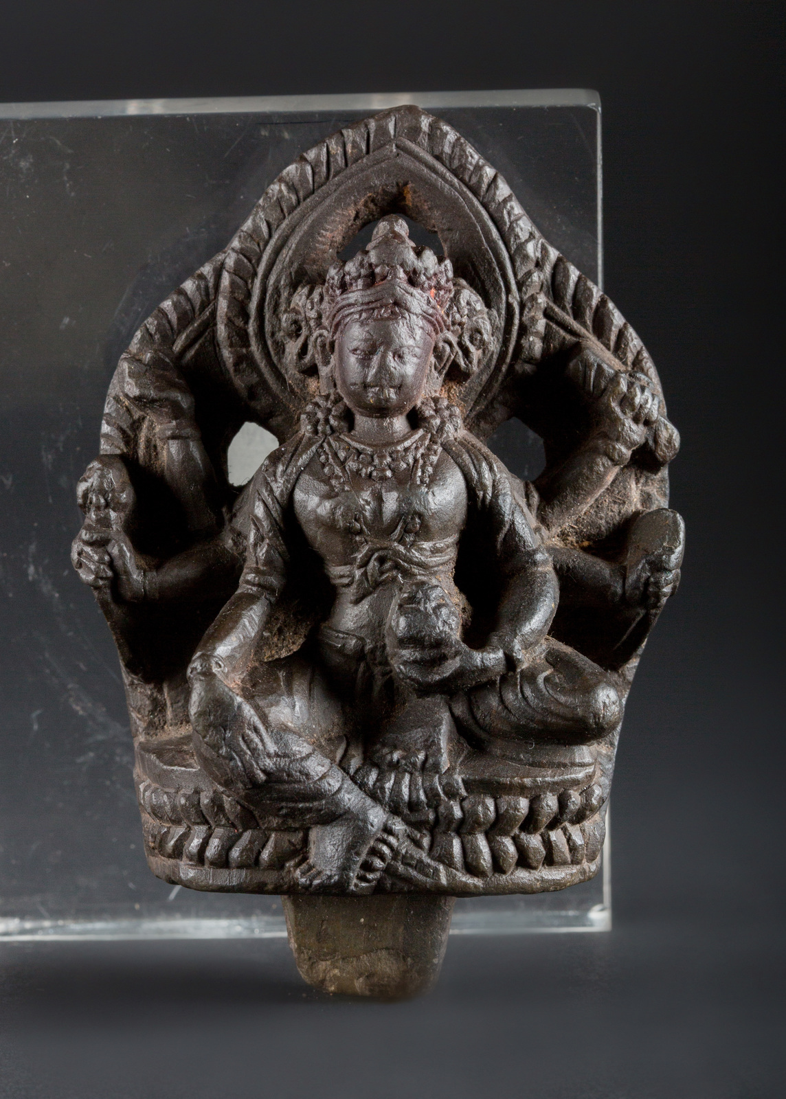 Nepal, XVI secolo . -. Cm 7,00 x 11,00. Piccola scultura raffigurante la dea femminile Vasudhara qui ritratta seduta in lilasana su un doppio fiore di loto. La figura è abbellita da gioielli e corona ed è dotata di sei braccia, alcune delle quali reggono attributi tra cui: un libro, un laccio, una kalasa ed un germoglio.