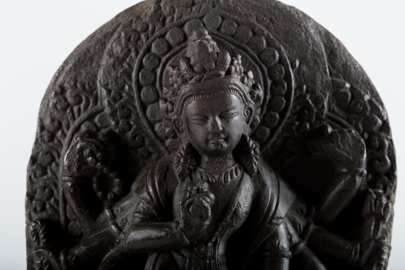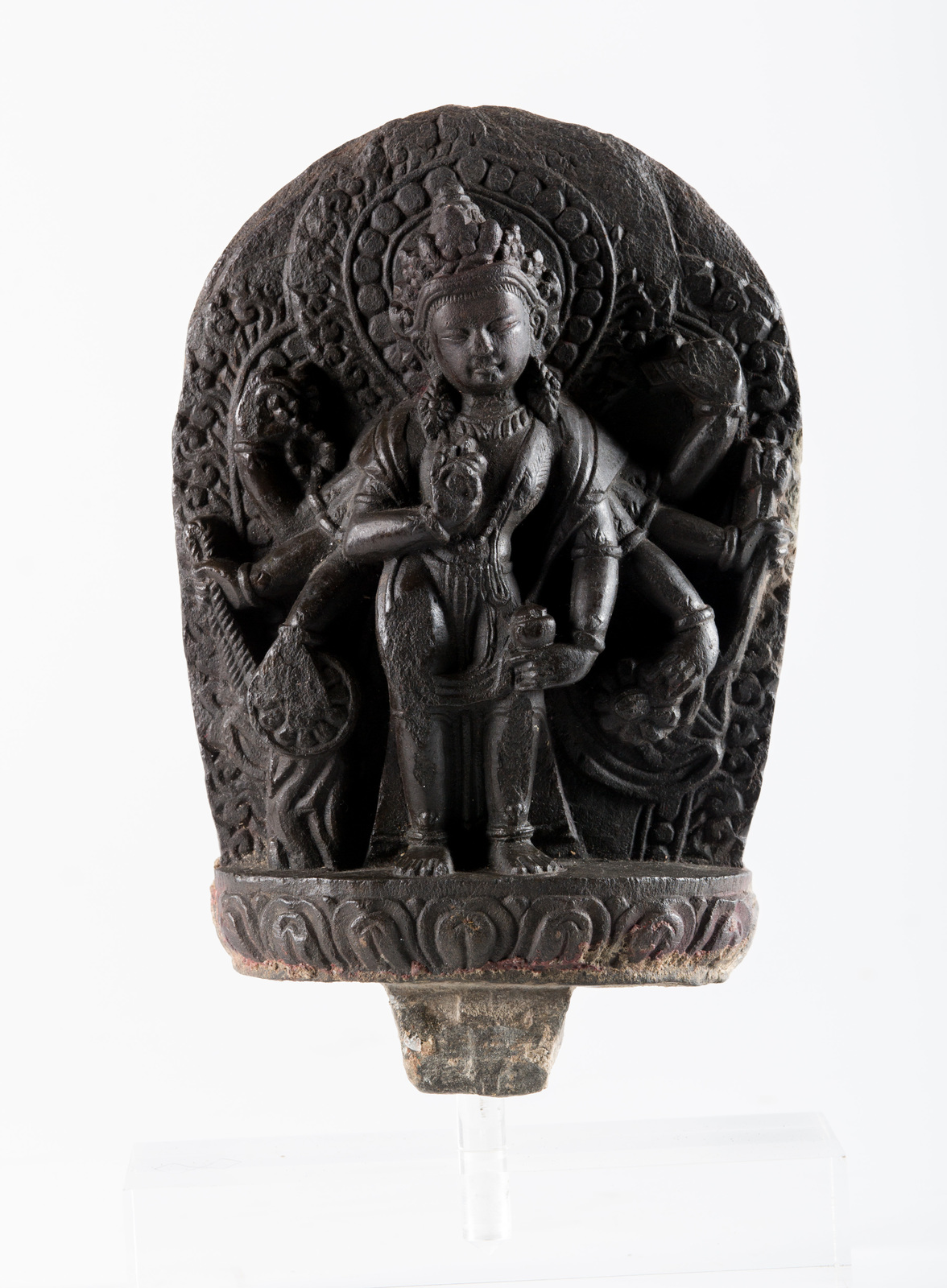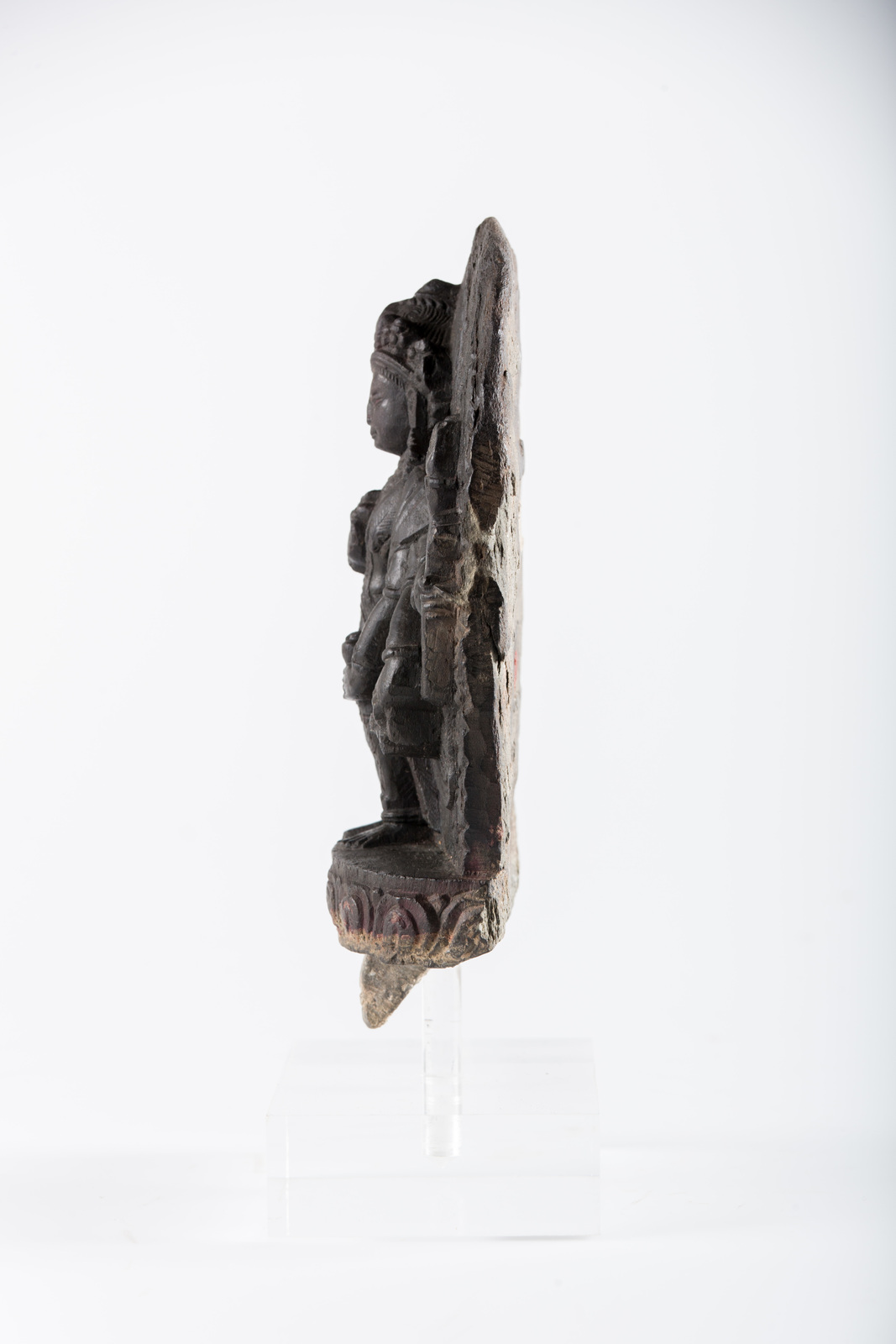 Nepal, XVI secolo . -. . Piccola stele da tempio ritraente, in forma stante, Amoghapasa su una base a loto singolo, con concrezioni di pigmento rosso, e circondato da una doppia aureola finemente incisa. La figura è abbellita da una corona a cinque punte, gioielli ed un dothi che fascia il corpo; è inoltre dotata di otto braccia reggenti altrettanti attributi, tra i quali sono distinguibili il tridente, il rosario, il laccio, la ruota del dharma ed un loto.