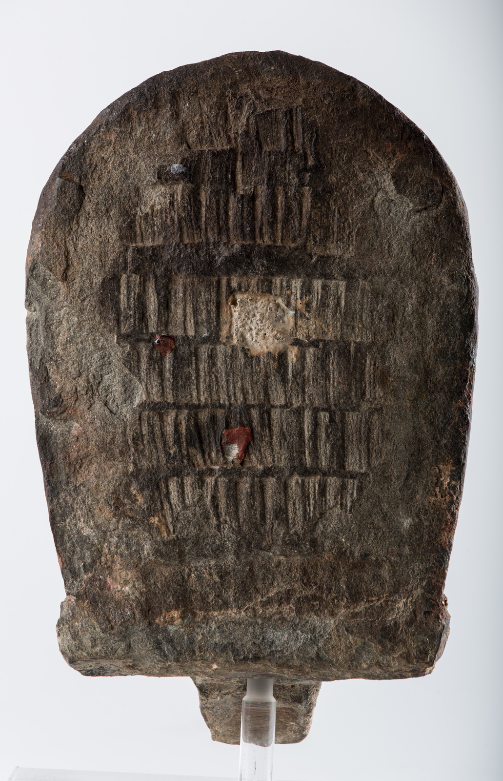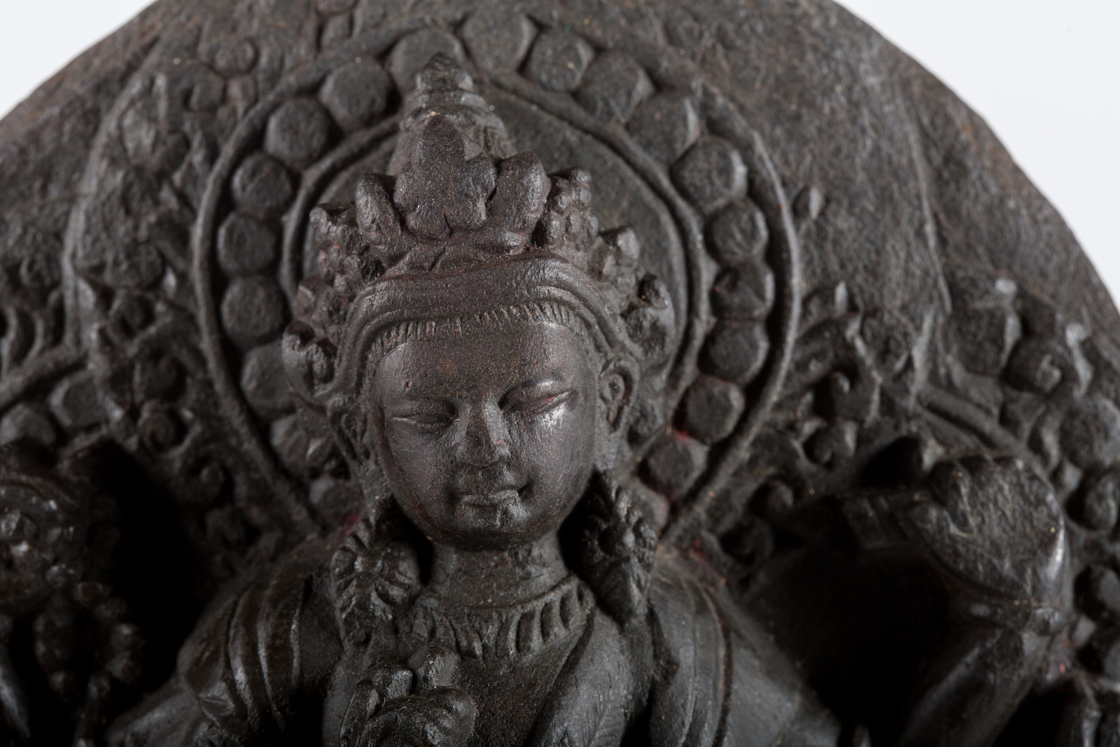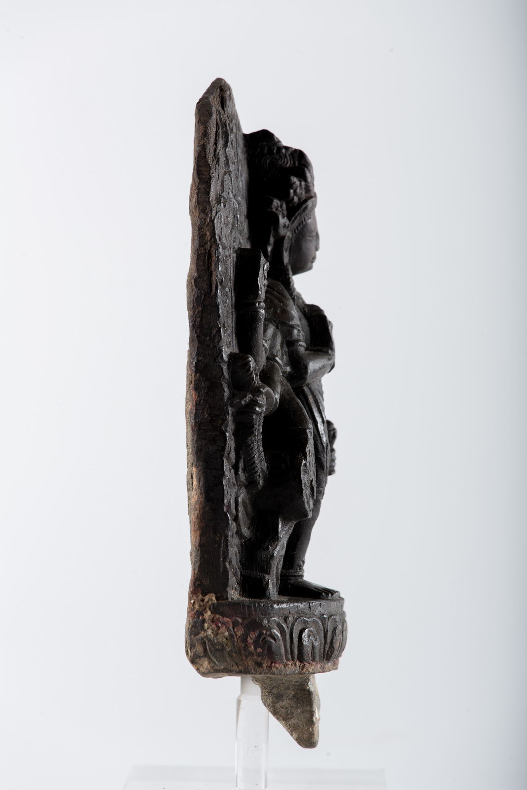 Nepal, XVI secolo . -. . Piccola stele da tempio ritraente, in forma stante, Amoghapasa su una base a loto singolo, con concrezioni di pigmento rosso, e circondato da una doppia aureola finemente incisa. La figura è abbellita da una corona a cinque punte, gioielli ed un dothi che fascia il corpo; è inoltre dotata di otto braccia reggenti altrettanti attributi, tra i quali sono distinguibili il tridente, il rosario, il laccio, la ruota del dharma ed un loto.