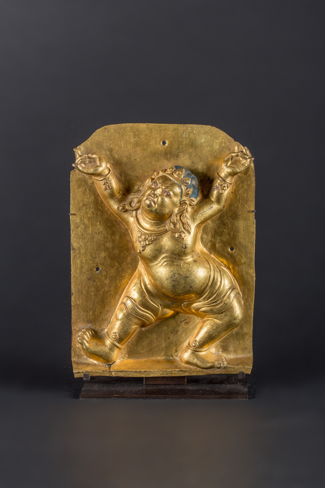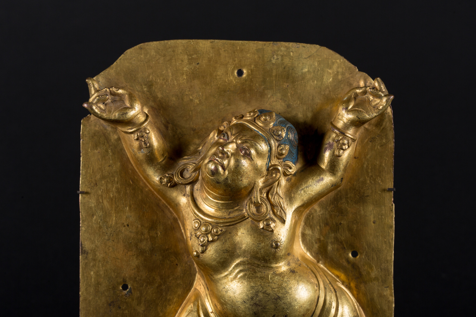 Tibet, 16th - 17th century . . Cm 19,00 x 26,00. Notable rectangular plaque, embossed with semi-wrathful figure dancing. The corpulent figure is depicted with a five pointed crown, earrings and jewels, and presents polychrome traces on the hair and the eyes. In the background holes are visible, leading to presume that the item must have been part of a larger decorative complex. The absence of attributes makes a definitive identification impossible.