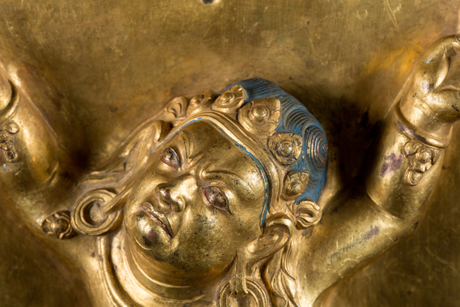 Arte Himalayana An embossed gilt copper plaque with semi-wrathful figure