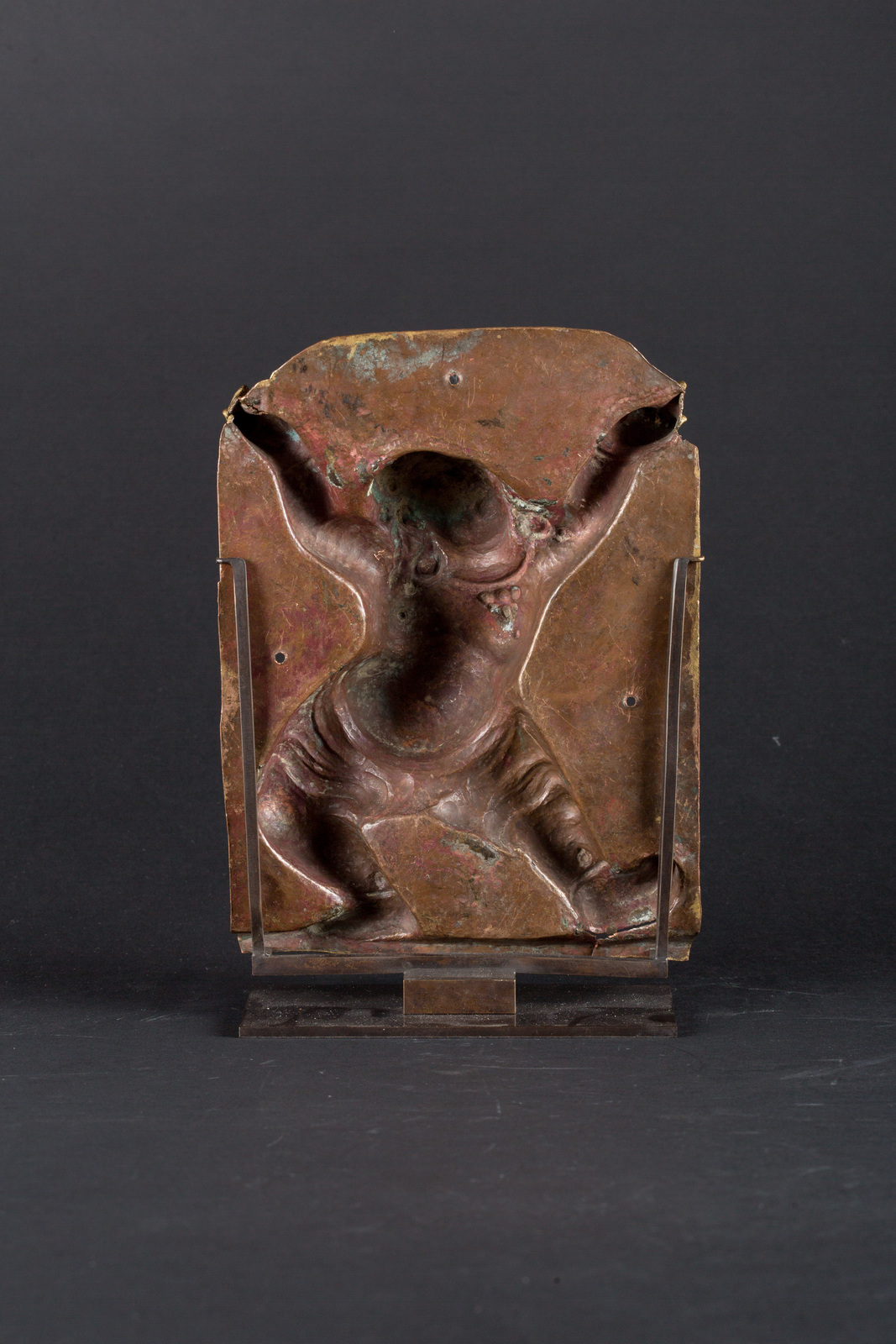Tibet, XVI - XVIII secolo . -. Cm 19,00 x 26,00. Importante placca di forma rettangolare, sbalzata con figura semi-irata danzante. Il personaggio corpulento è ritratto con una corona a cinque punte, orecchini, gioielli e presenta tracce policrome sull'acconciatura e sugli occhi. Sono presenti inoltre sullo sfondo dei fori che fanno presumere che l'oggetto appartenesse ad un complesso decorativo più ampio. L'assenza di attributi ne impedisce un'identificazione certa.