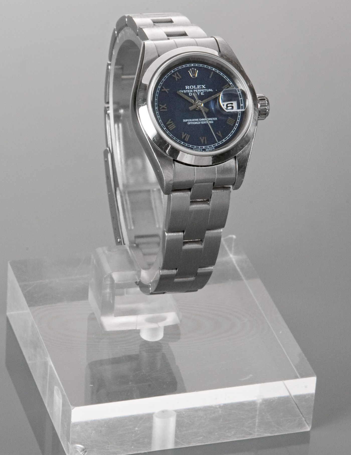ROLEX Oyster Perpetual Date, misura Lady, ref. 69160 del 1999 Diam. 26 Cassa oyster in tre corpi con corona e fondo a vite, bracciale oyster; quadrante di colore blu con numeri romani applicati e minuteria a binario serigrafata Movimento automatico