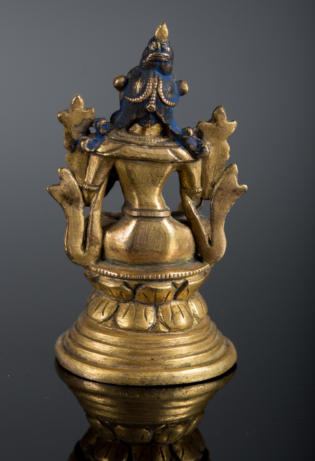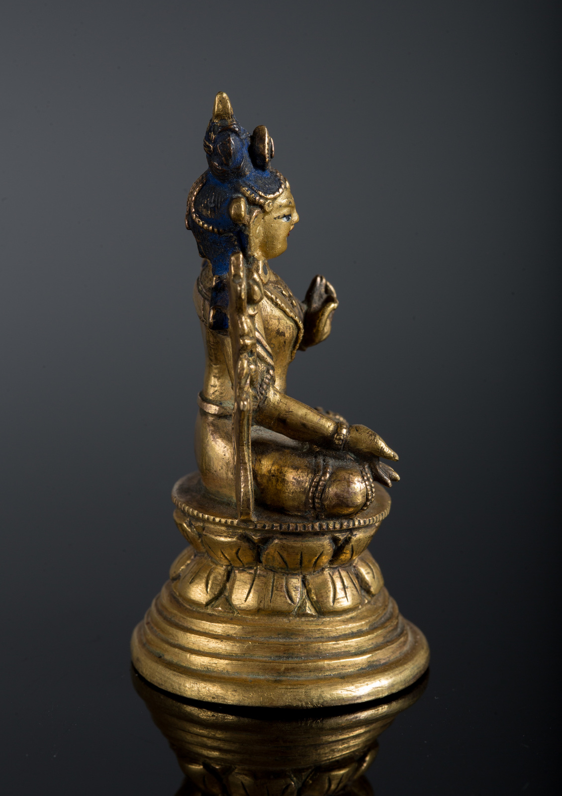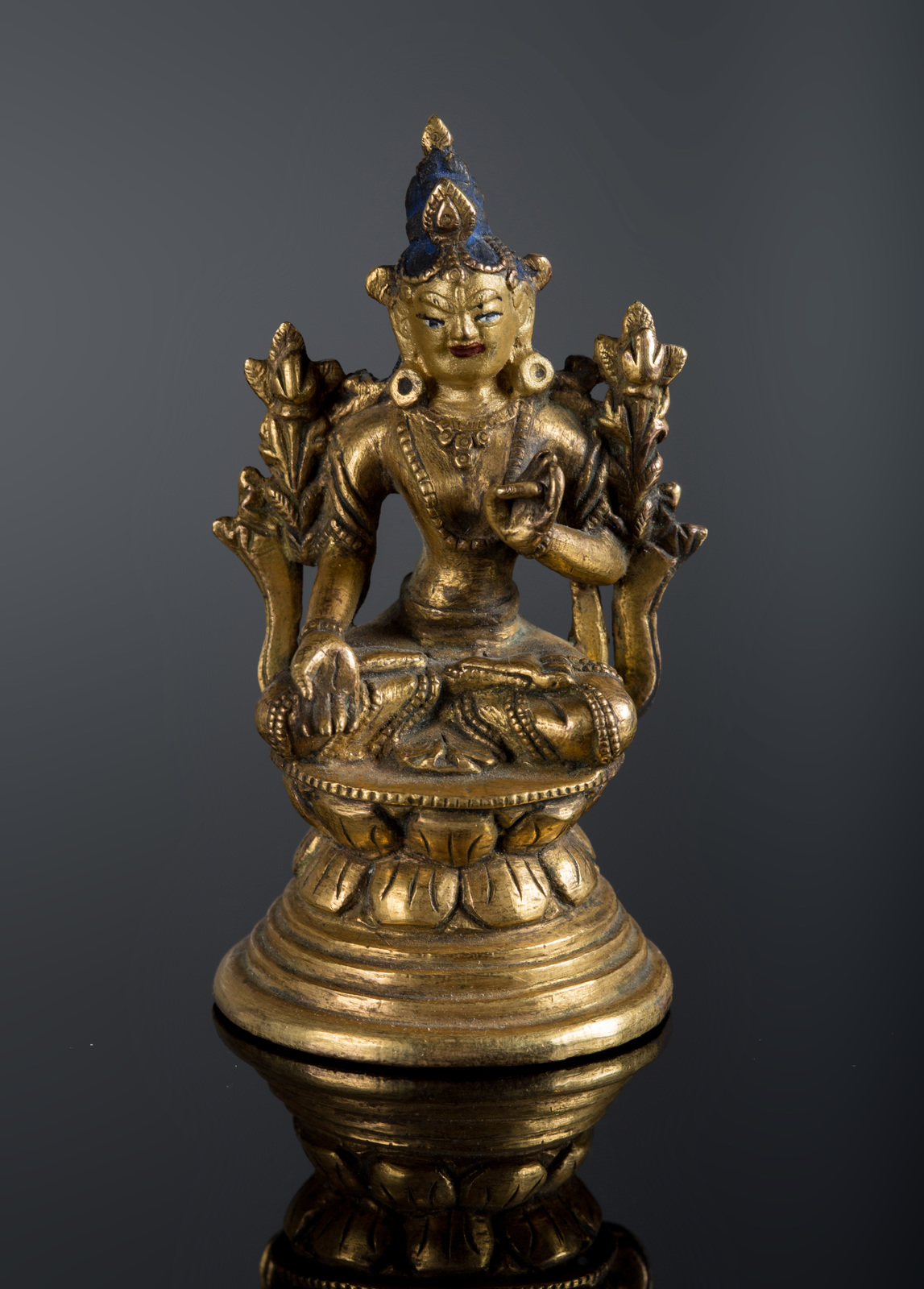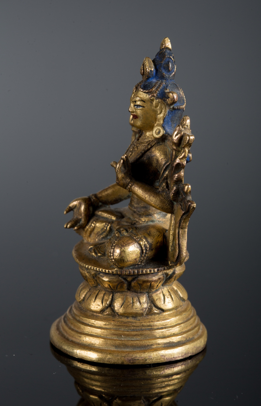 Cino-Tibet, XVI secolo . -. Cm 7,00. Fusione in bronzo dorato raffigurante Tara Bianca seduta in padmasana su una base a doppio fiore di loto. La mano destra in varadamudra e la sinistra in vitarkamudra. La figura è caratterizzata da cinque occhi secondari posizionati sulle piante dei piedi, sui palmi delle mani e sulla fronte. Sulle spalle dei tralci arborei che terminano con fiori di loto. Sono presenti sul volto pigmenti policromi posteriori.