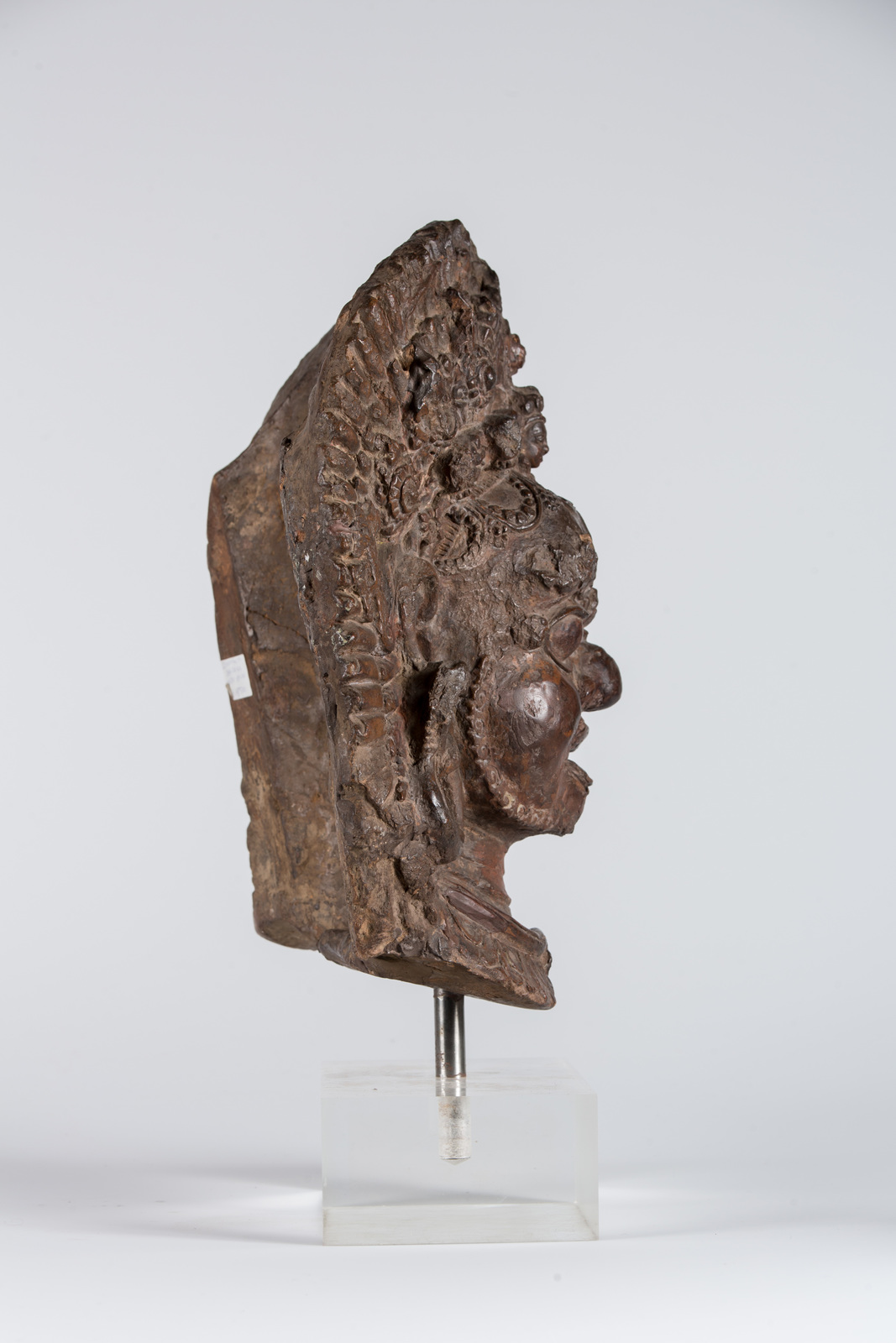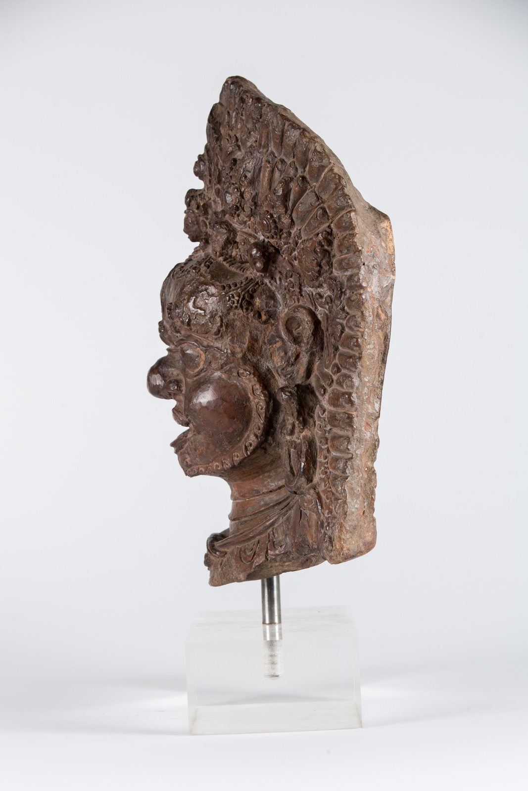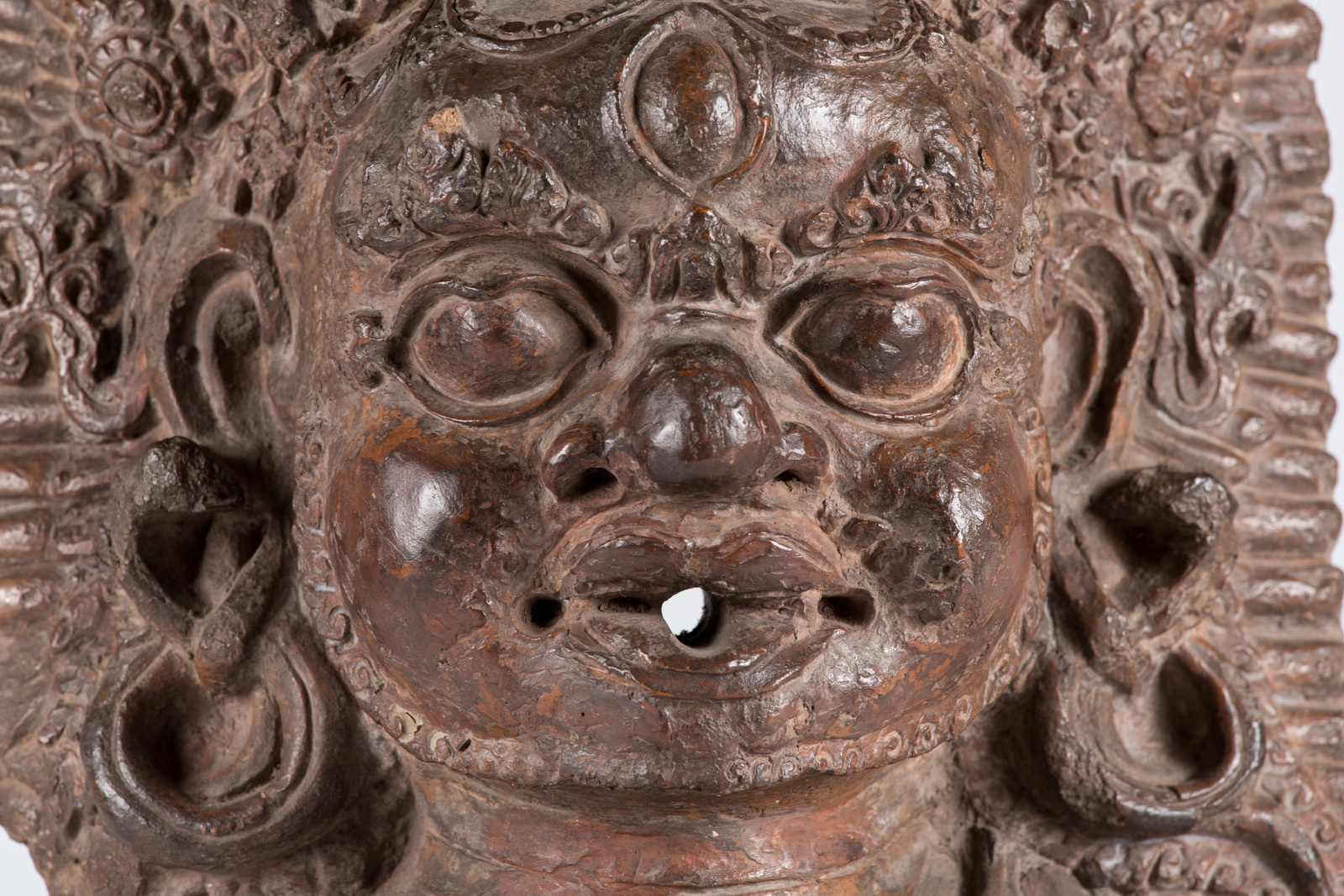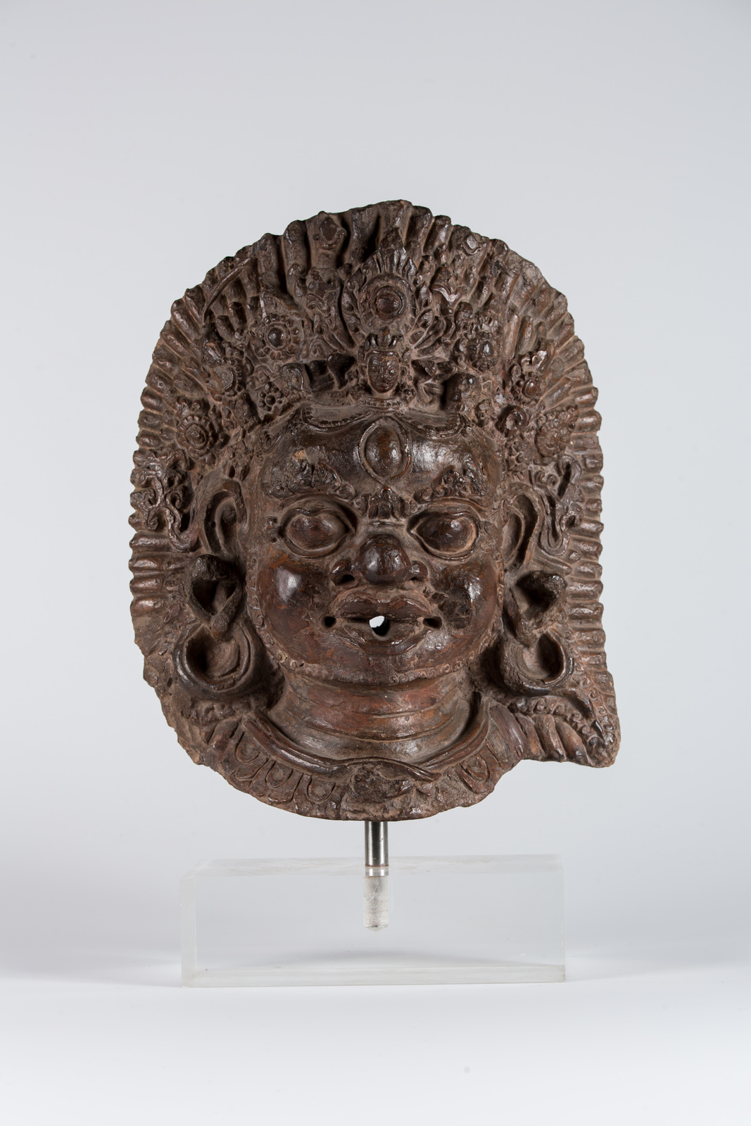 Nepal, 17th - 18th century . . Cm 26,50 x 37,00. Sculpture depicting the wrathful dharmapala Bhairava, here with big bulging eyes and flaming eyebrows. The figure has a snake coiled around the neck, a third eye on the forehead and is ornate with a big five pointed crown, from the back of which the bristly hair flow. At the center of the diadem is the small head of the transcendent bodhisattva Manjusri.
