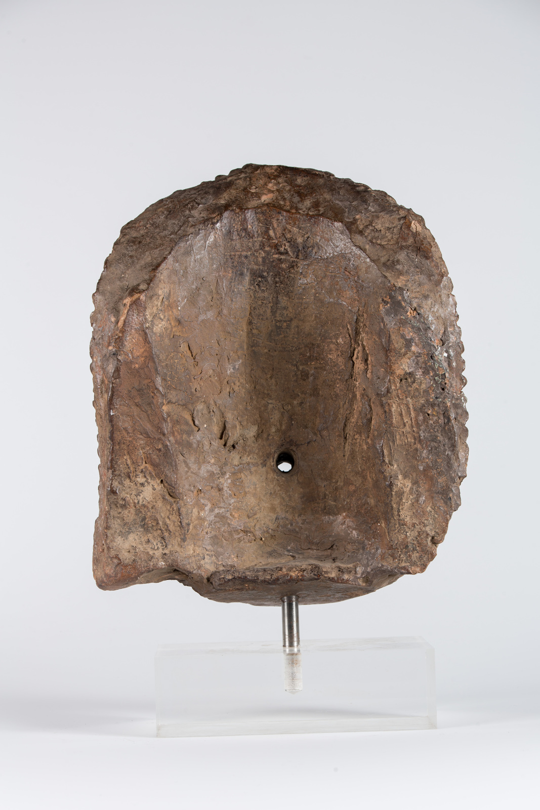 Nepal, XVII - XVIII secolo . -. Cm 26,50 x 37,00. Scultura ritraente il dharmapala dall'aspetto irato Bhairava qui ritratto con enormi occhi strabuzzanti, circondati da sopracciglia fiammeggianti. Il personaggio mostra un serpente annodato intorno al collo, un terzo occhio sulla fronte ed è abbellito da una grande corona a cinque punte dal cui retro emergono i suoi capelli ispidi. Al centro del diadema si nota una piccola testa del bodhisattva trascendente Manjusri.