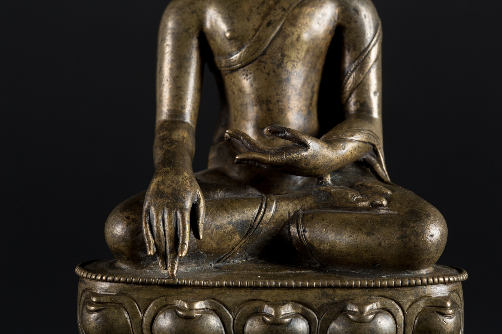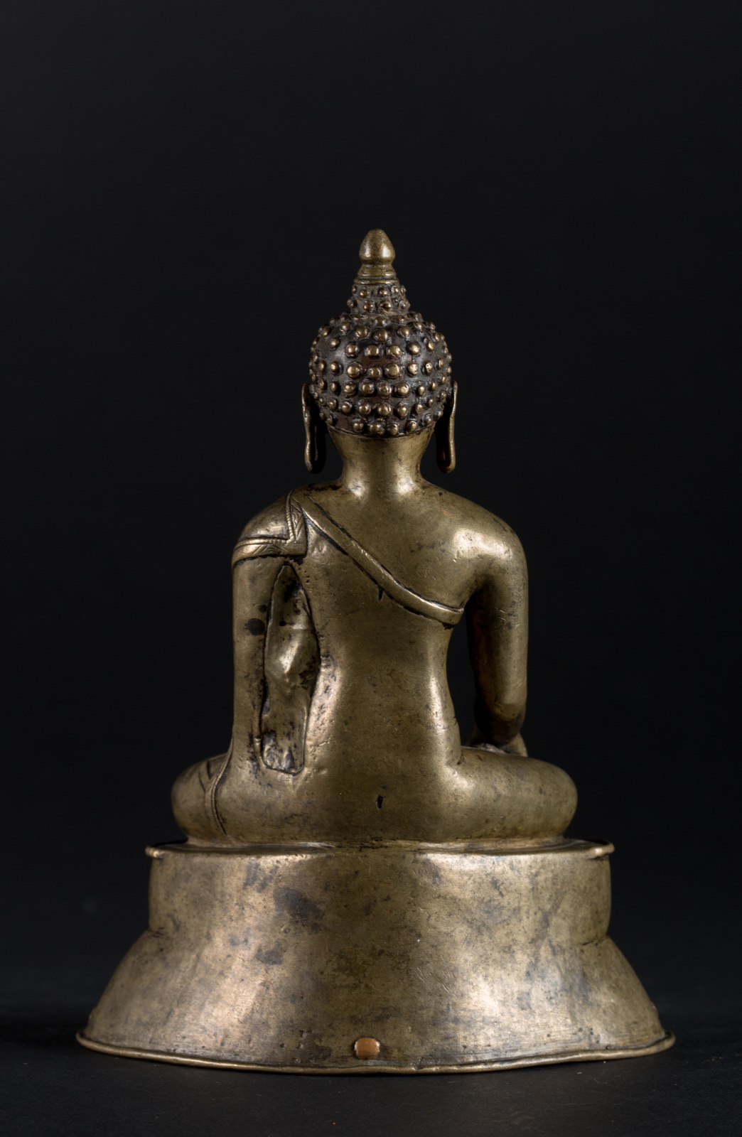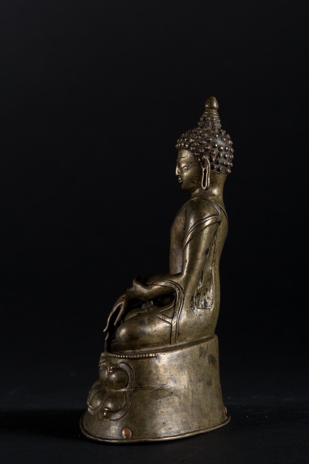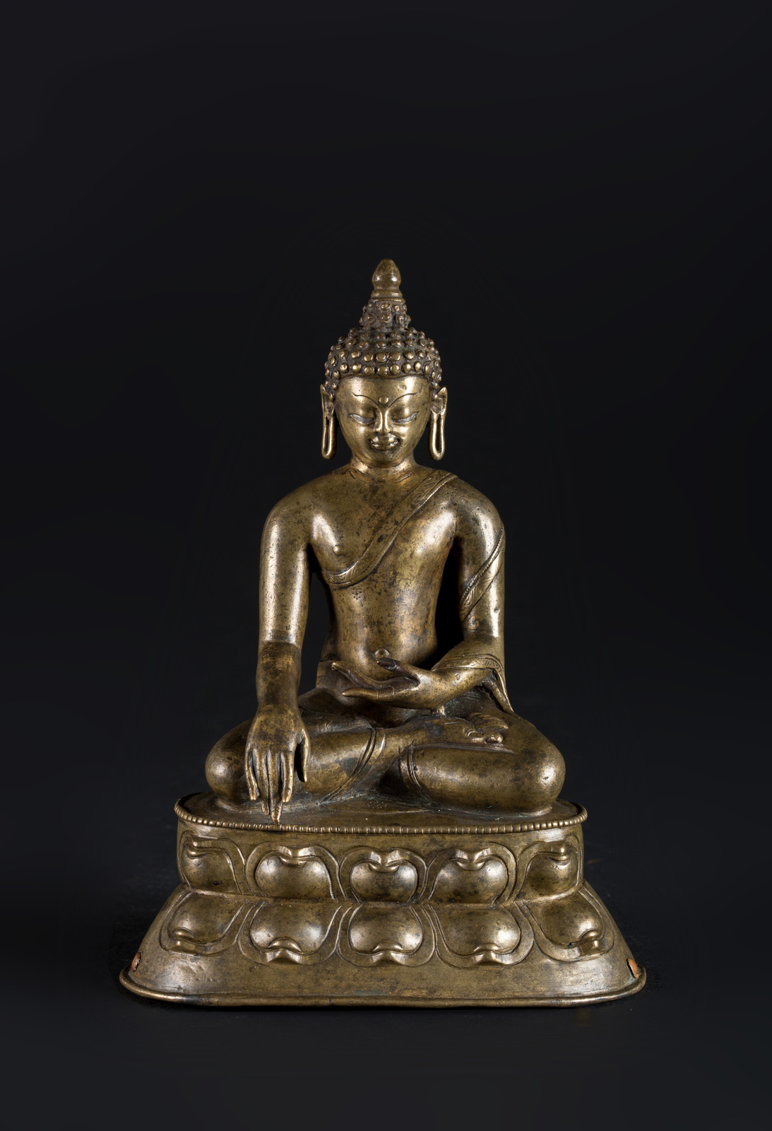 Arte Himalayana Scultura in rame con intarsi in argento raffigurante Buddha Sakyamuni Tibet, XVI secolo . -. Cm 13,00 x 17,50. Il personaggio, dal volto ieratico, è seduto in padmasana su una base a doppio fiore di loto. La mano destra in bhumisparsamudra, la sinistra è adagiata in grembo in avakasamudra, il gesto di rilassamento. La figura indossa una veste monacale ed è abbellita da occhi in argento La base è aperta.