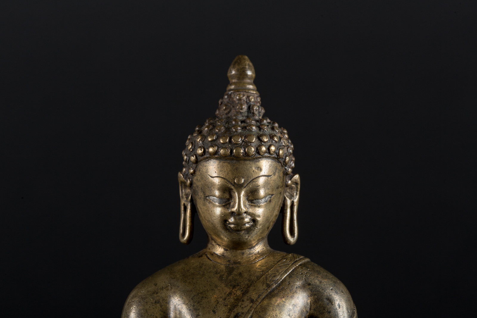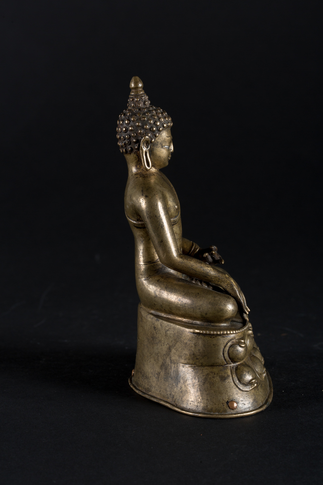 Arte Himalayana A copper alloy with silver inlay Buddha figure Tibet, 16th century . . Cm 13,00 x 17,50.