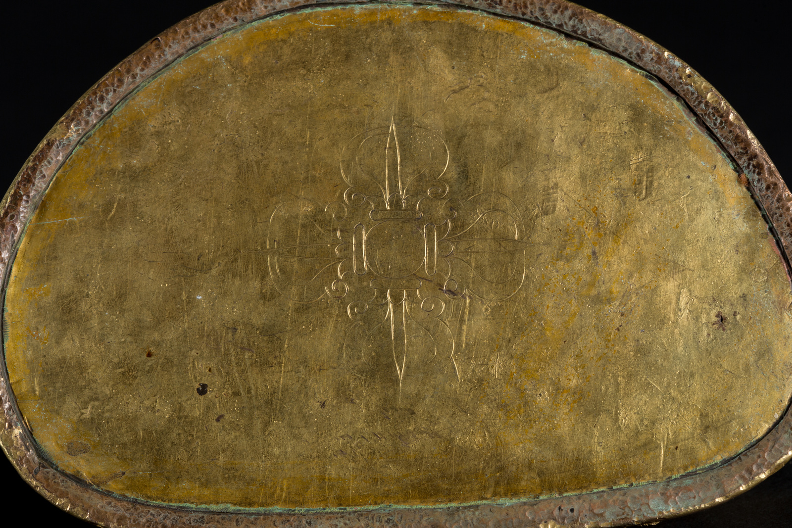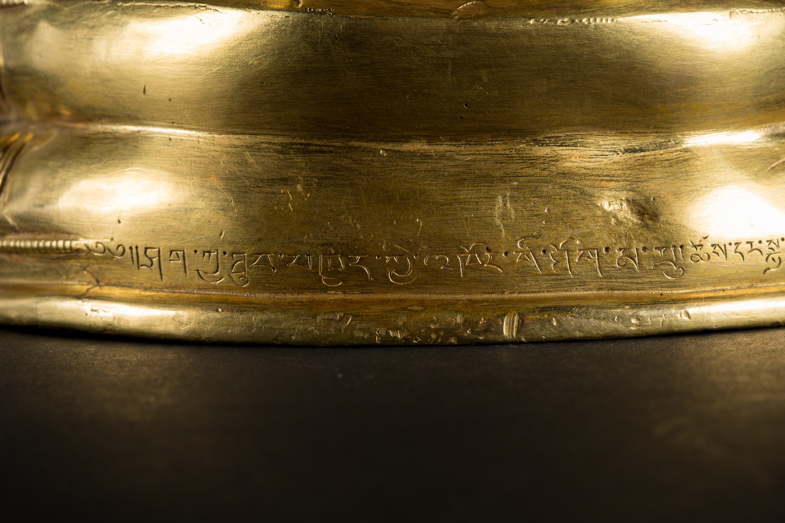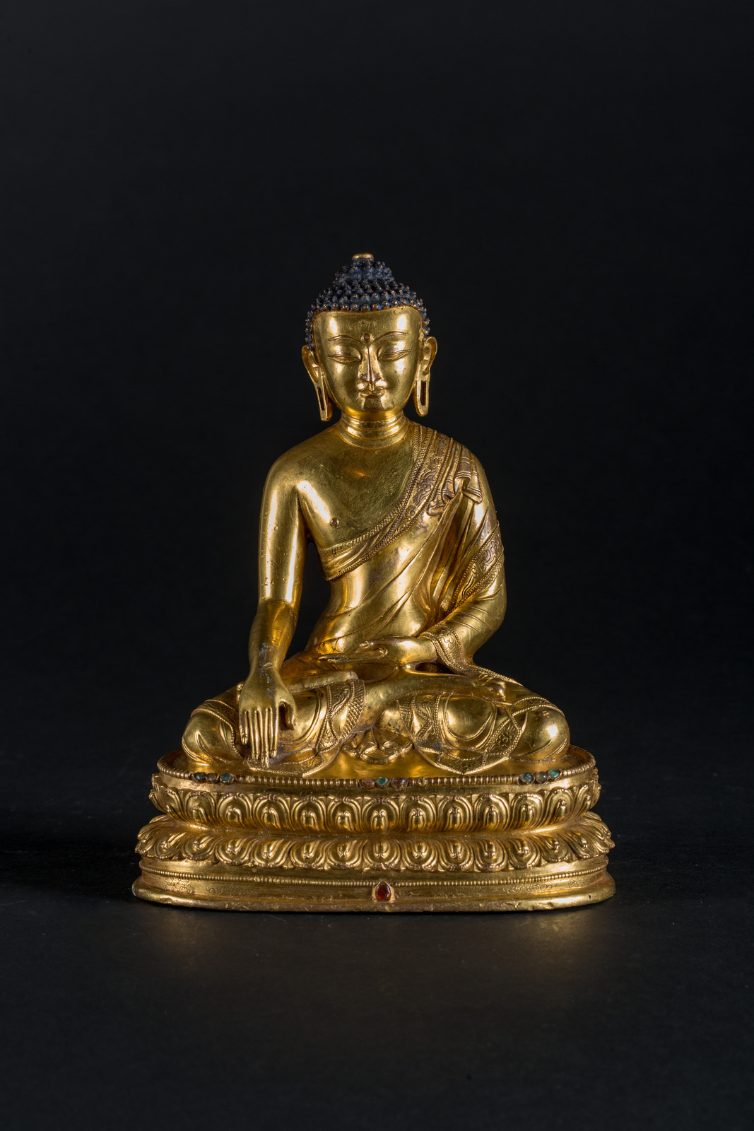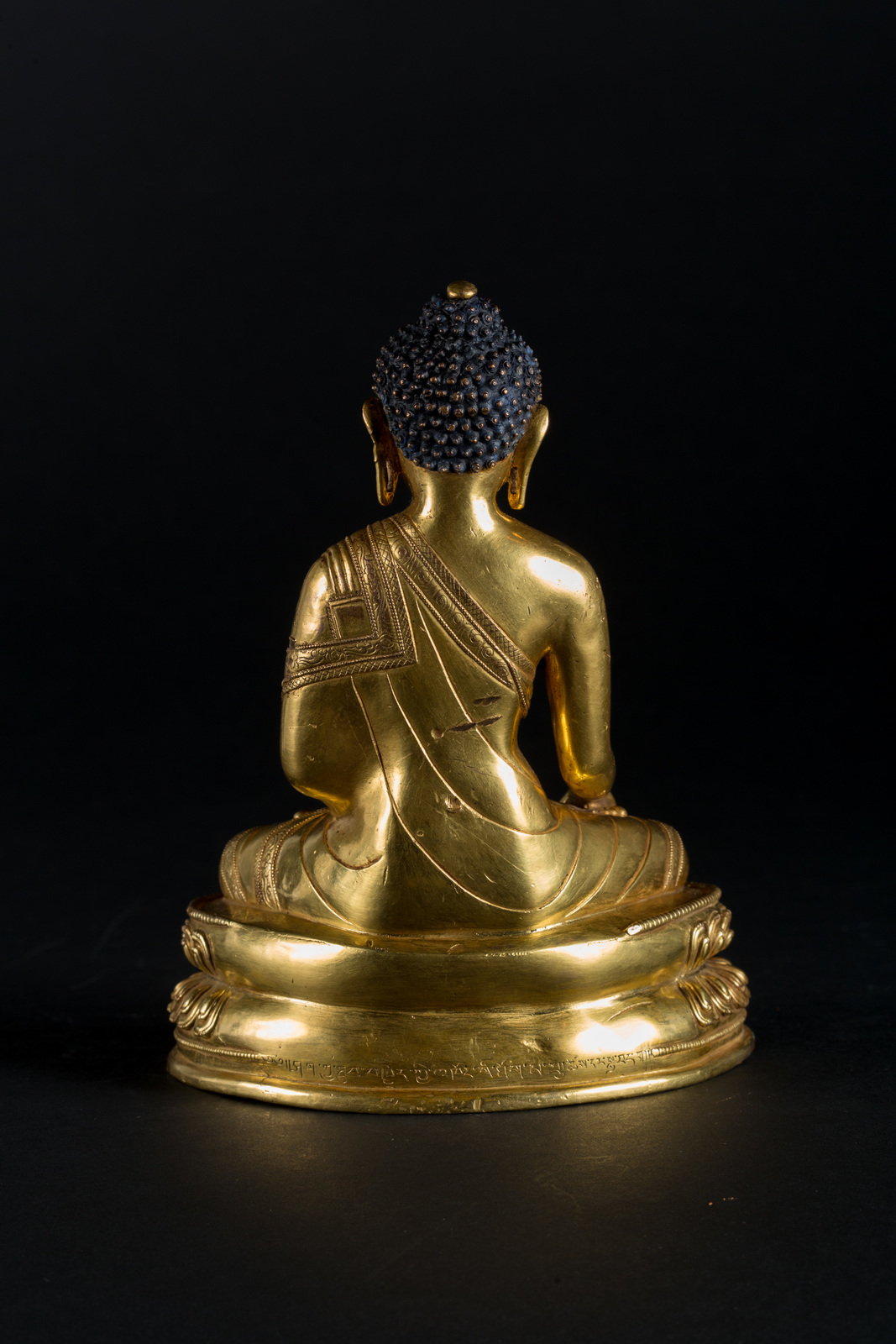 Tibet, 15th - 16th century . . Cm 15,00 x 20,00. Noticeable sculpture depicting the Gautama Buddha, in his canonical manifestation. The figure, with a hieratic expression and finely made, is sitting in the padmasana position on a double lotus flower base, enriched by gems. The right hand performs the bhūmisparśa mudra, asking the earth to witness the truth of his word, while the left hand is resting in his lap in the avakasamudra, the gesture of relaxation. The figure wears a monastic robe, finely chiseled with phytomorphic decors on the edges. The base, still sealed, shows a double vajra, and at the back of the figure is a long inscription.