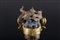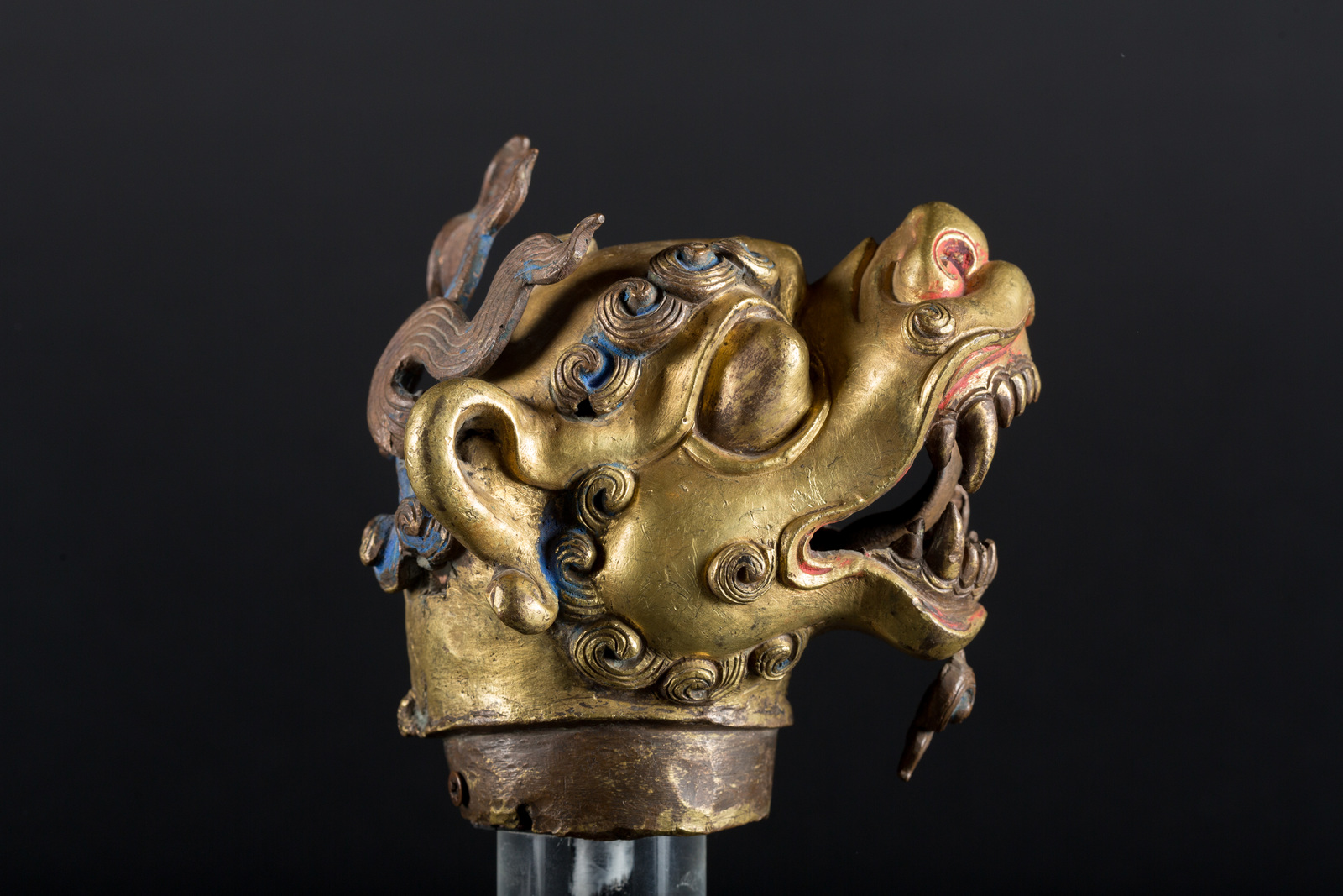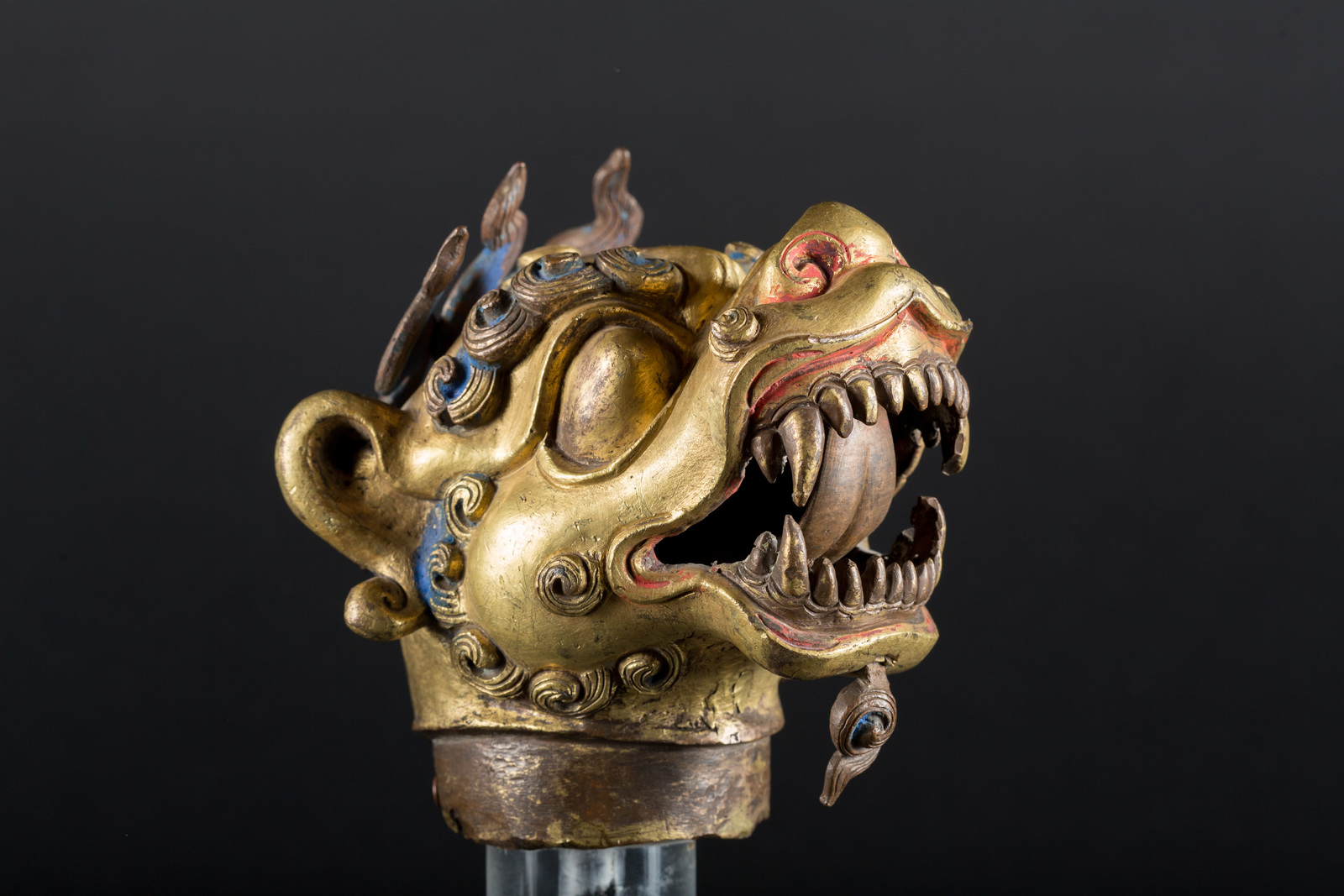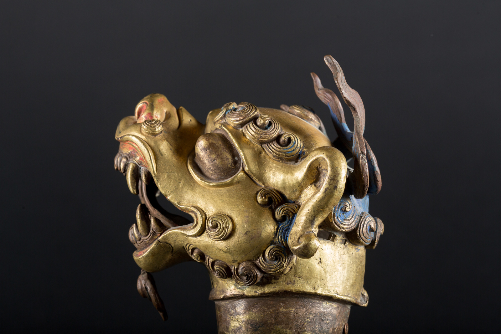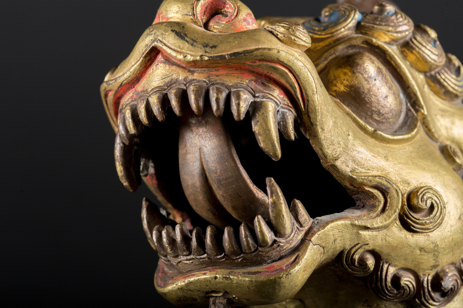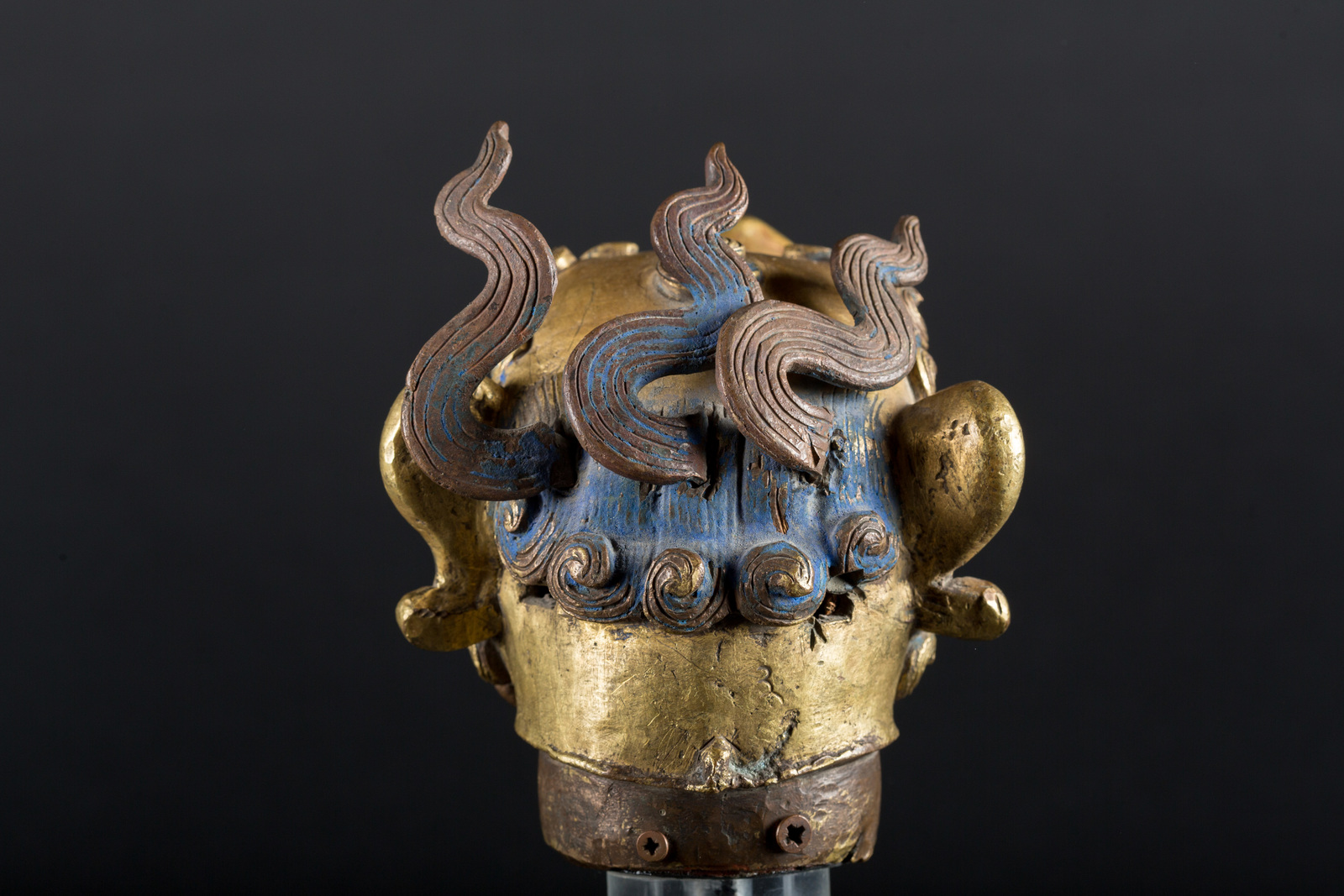 Tibet, 15th century . . Cm 11,00. Fine lion’s head in embossed bronze, gilded and with abundant polychromatic traces, especially on the maw and the mane. The beast’s original placement was likely in one of the stupa of the Densatil monastery, perhaps as a support for a throne. The Densatil monastery was one of the cornerstones of Tibetan art, and was built in the course of 160 years: in 1270 the first tashi gomang, and in 1430 the last stupa, were erected. Sadly the monastery was destroyed during the Chinese Cultural Revolution (1966-1978), making the attribution of the sculptures on the present day’s international market uncertain.