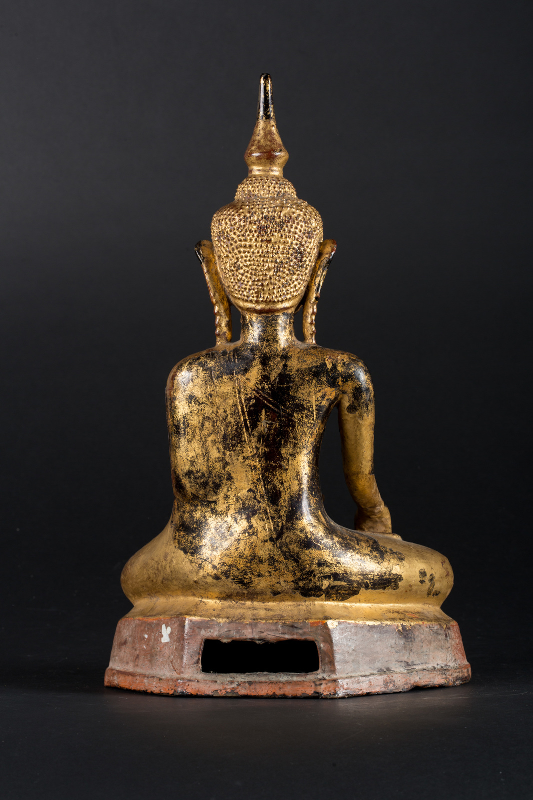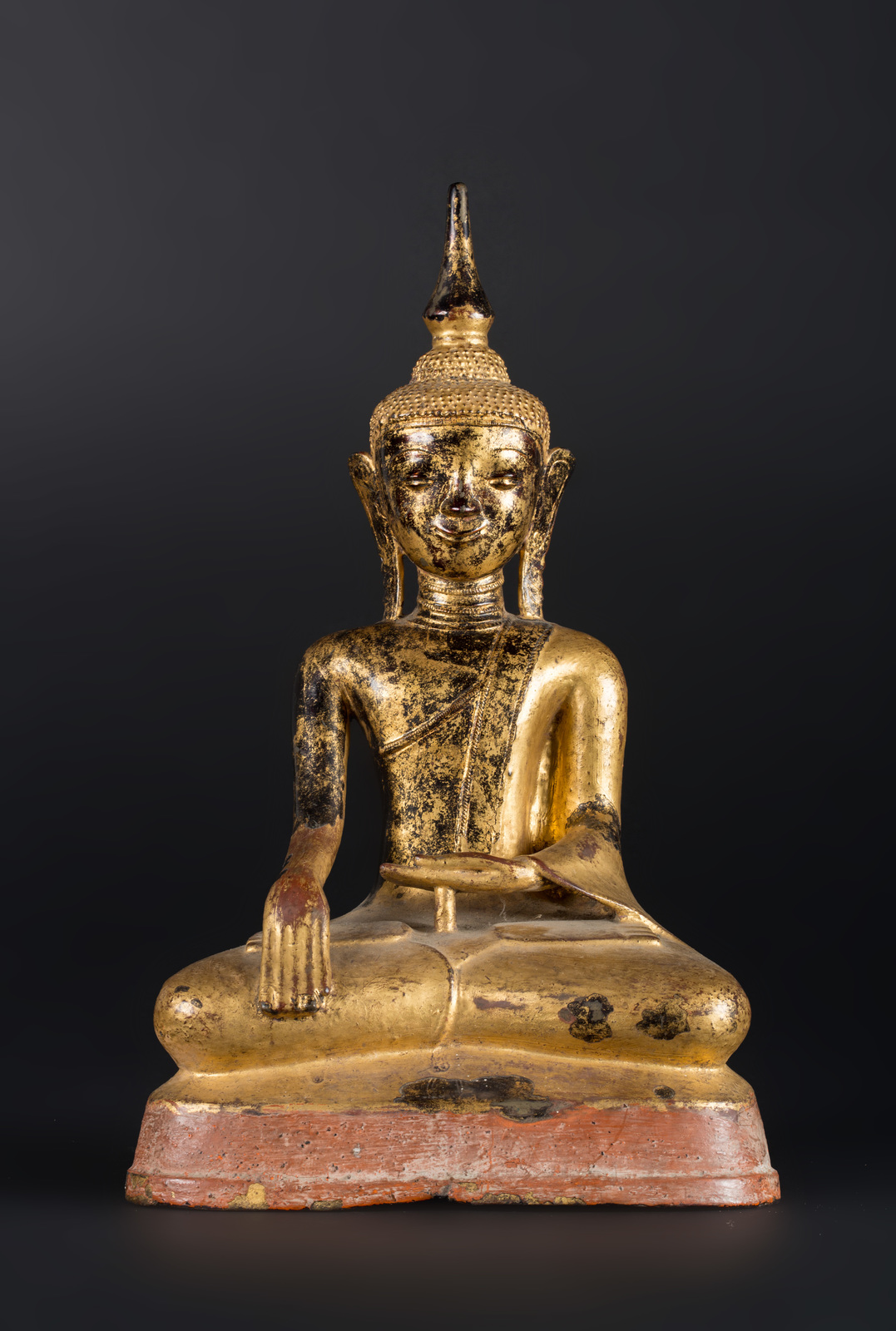 Birmania, XVII secolo . -. Cm 27,00 x 45,00. Il Buddha storico è qui raffigurato nella sua posizione canonica, seduto in padmasana. Cospicue tracce di lacca oro, rossa e nera.