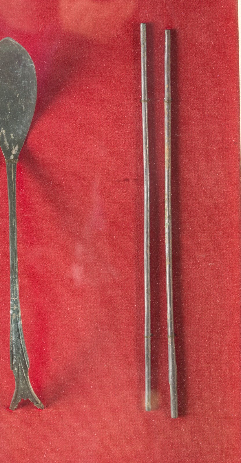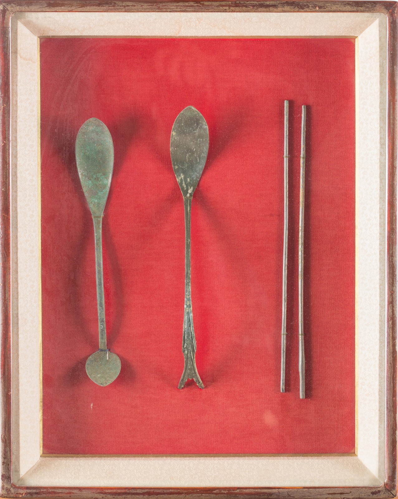 Arte Sud-Est Asiatico Coppia di cucchiai e bacchette in bronzo Corea, dinastia Silla, VIII - IX secolo. -. Cm 26,50. Entro teca in legno e vetro.