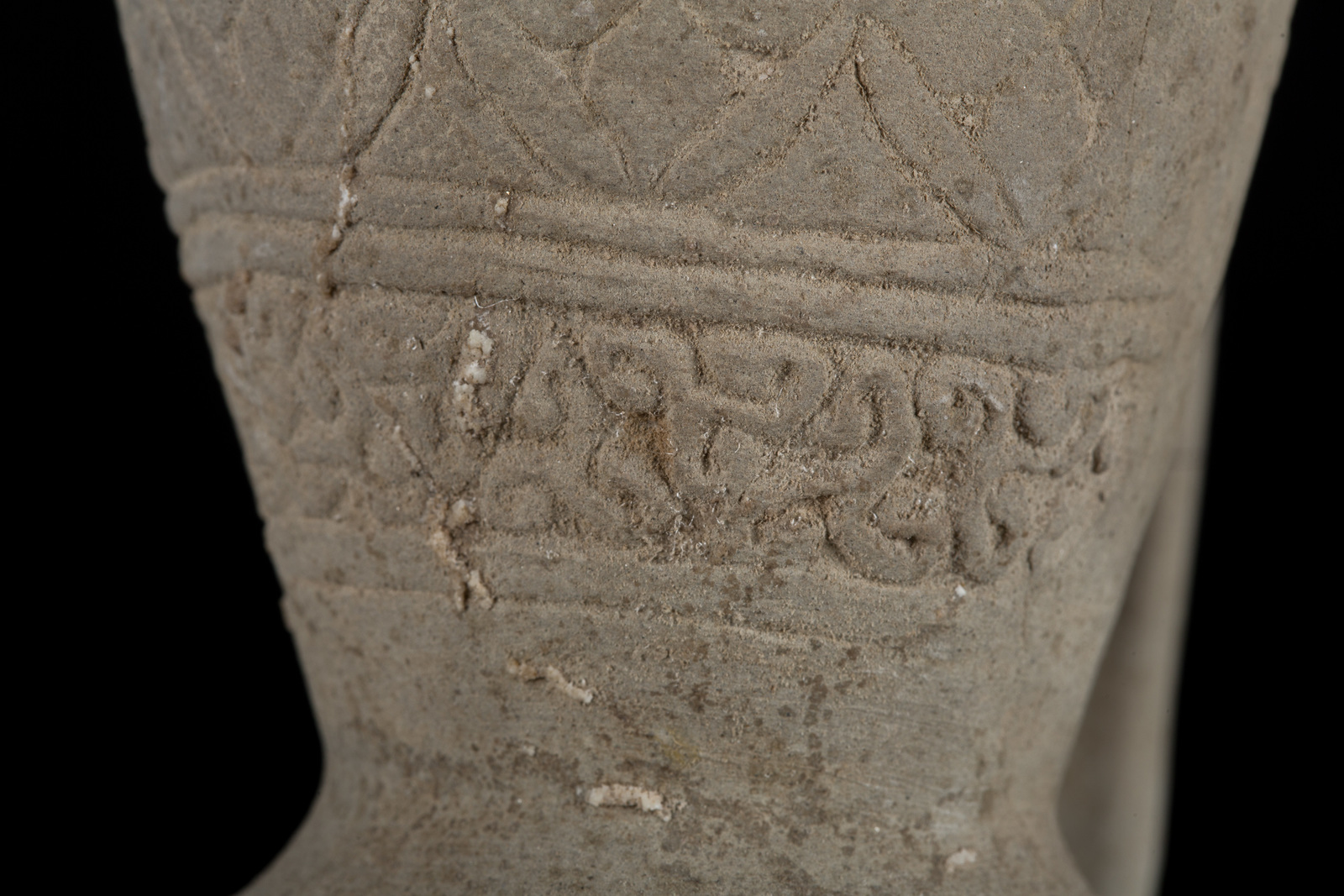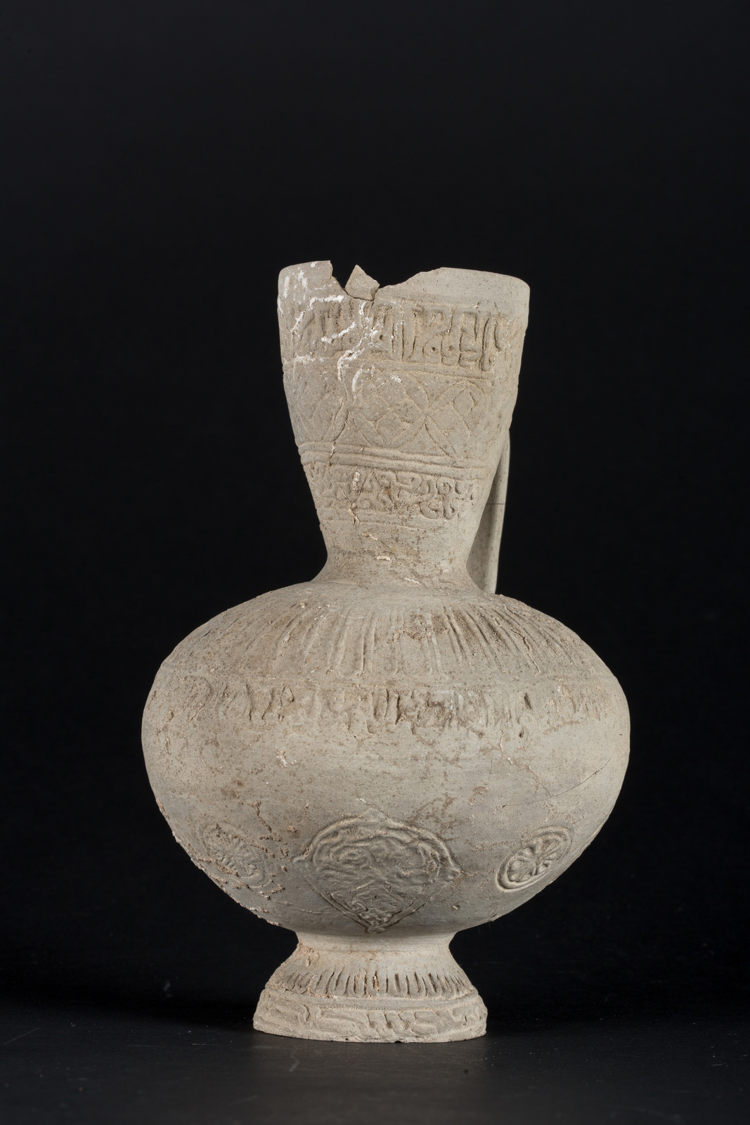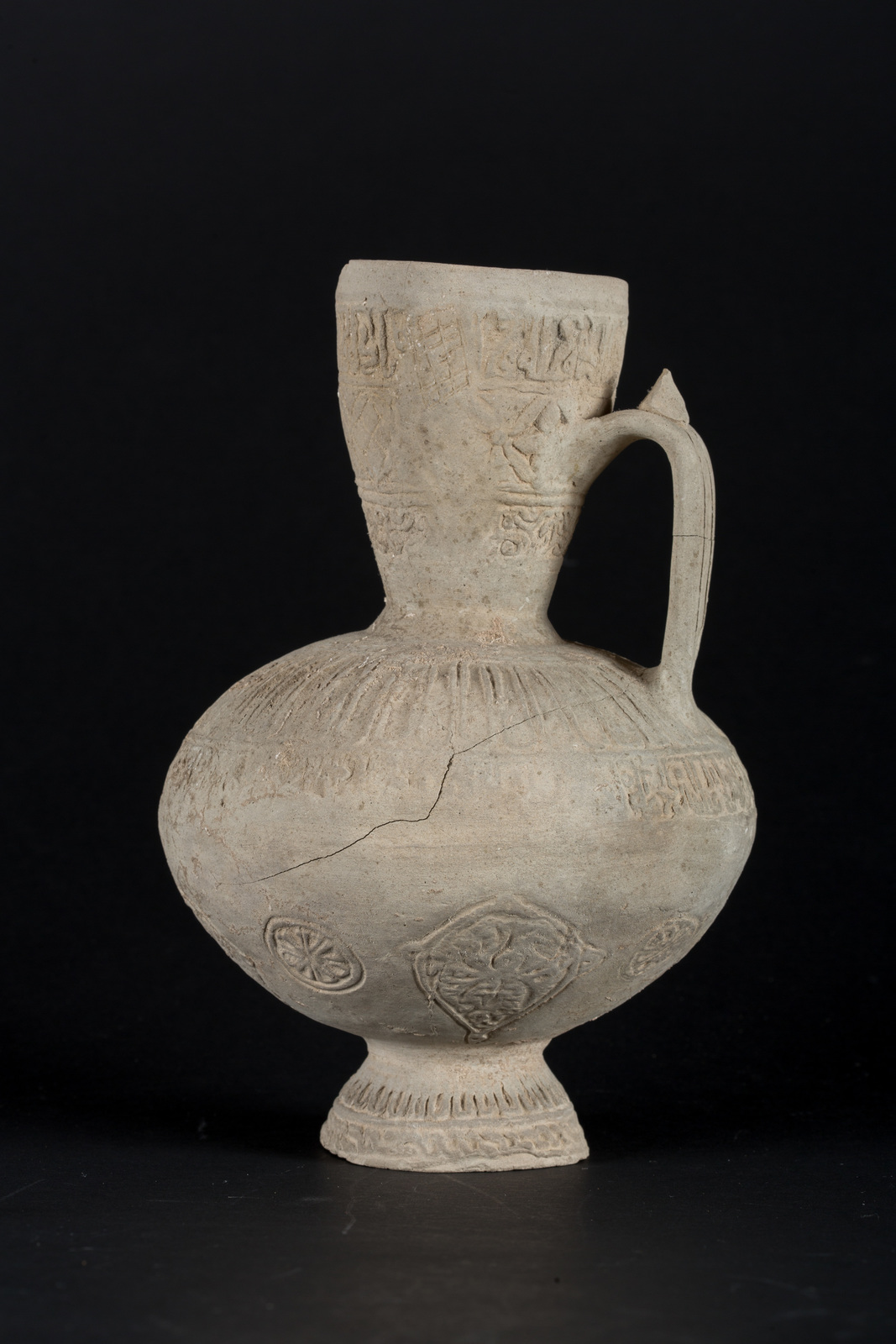 Arte Islamica A Seljuk unglazed molded pottery ewer decorated with floral motif and epigraphy