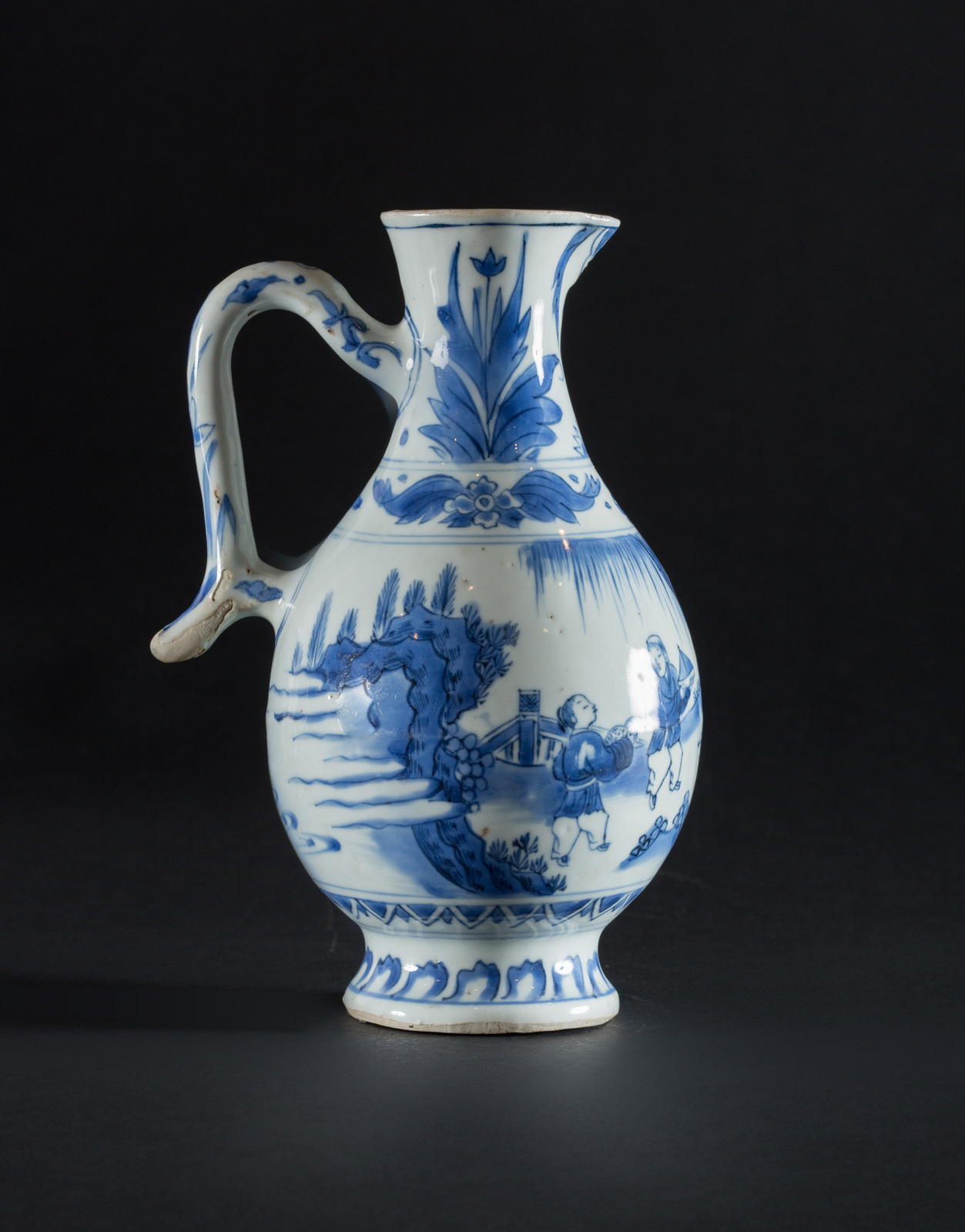 Iran, dinastia Safavide, XVII secolo . -. Cm 11,50 x 22,00. Poggiante su disco decorato con petali, il corpo dipinto con scene di personaggi e bambini in esterno, il collo e l'ansa decorati a motivo floreale. Ceramiche di questa tipologia imitano le porcellane cinesi, considerate beni di lusso.