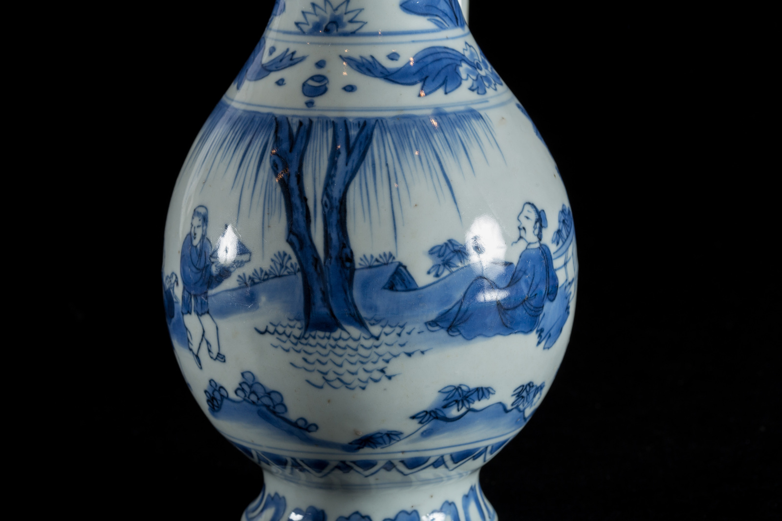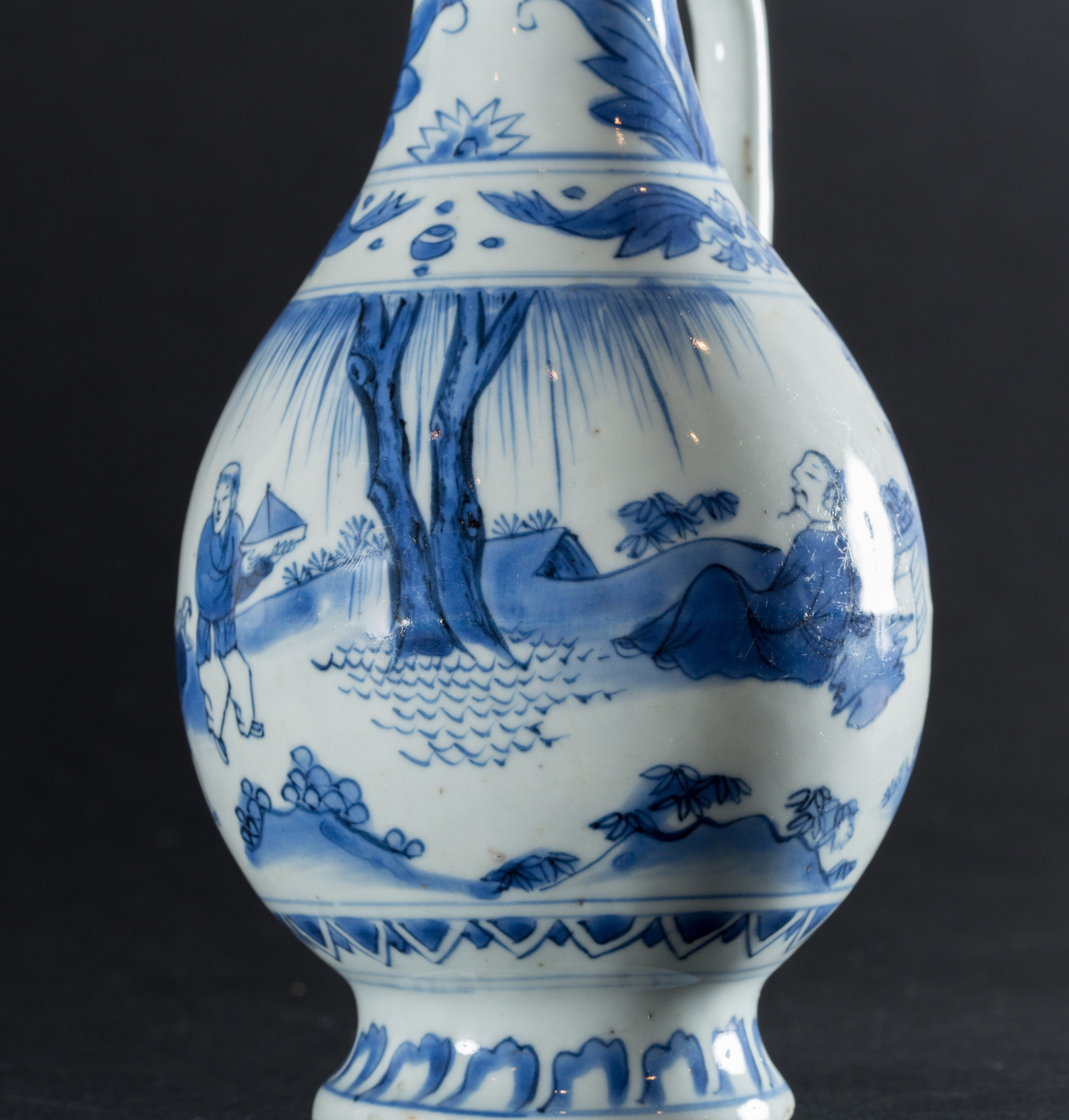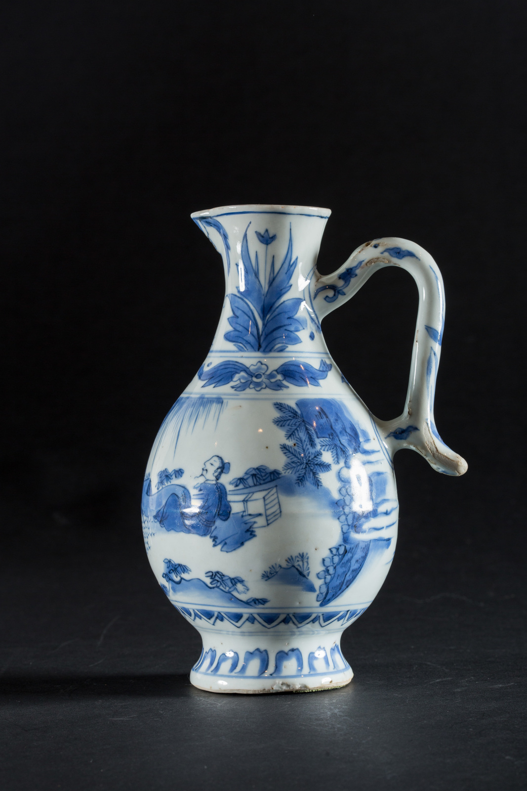 Arte Islamica A blue and white ceramic ewer painted with with floral motif and characters in landscape