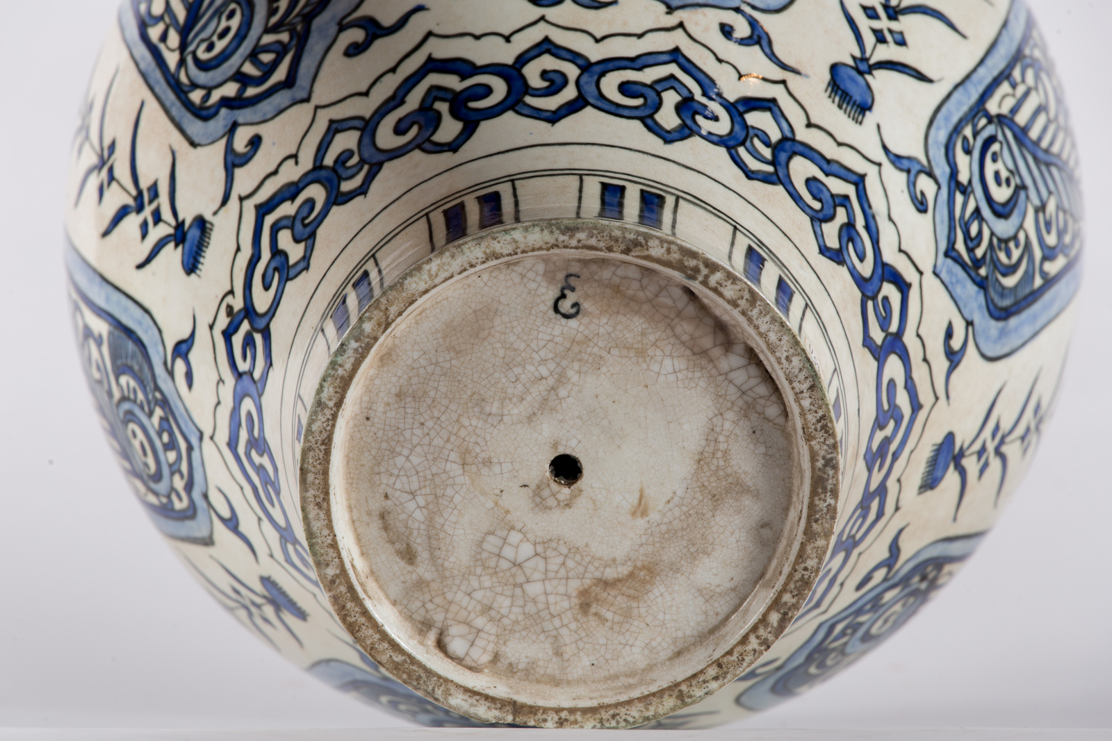Arte Islamica Vaso in ceramica in stile safavide marcato Samson Francia, XIX secolo . -. Cm 29,50 x 37,00. Grande vaso poggiante su stretta base circolare, corpo ad ampolla e collo dritto con bordo estroflesso. La decorazione dipinta ricalca modelli safavidi del XVII secolo, ma la rigidità del disegno ed il marchio sulla base confermano che si tratti di una copia europea ad opera dell'azienda Samson. La Samson ceramics aprì a Parigi nel 1845 con l'intento di produrre opere simili a quelle conservate in musei e collezioni private. Oltre alle copie delle grandi manifatture europee, la Samson si specializzò nella riproduzione di porcellane cinesi e ceramiche islamiche ed Ispano moresche, rifuggendo l'accusa di frode apponendo i propri marchi di fabbrica.