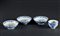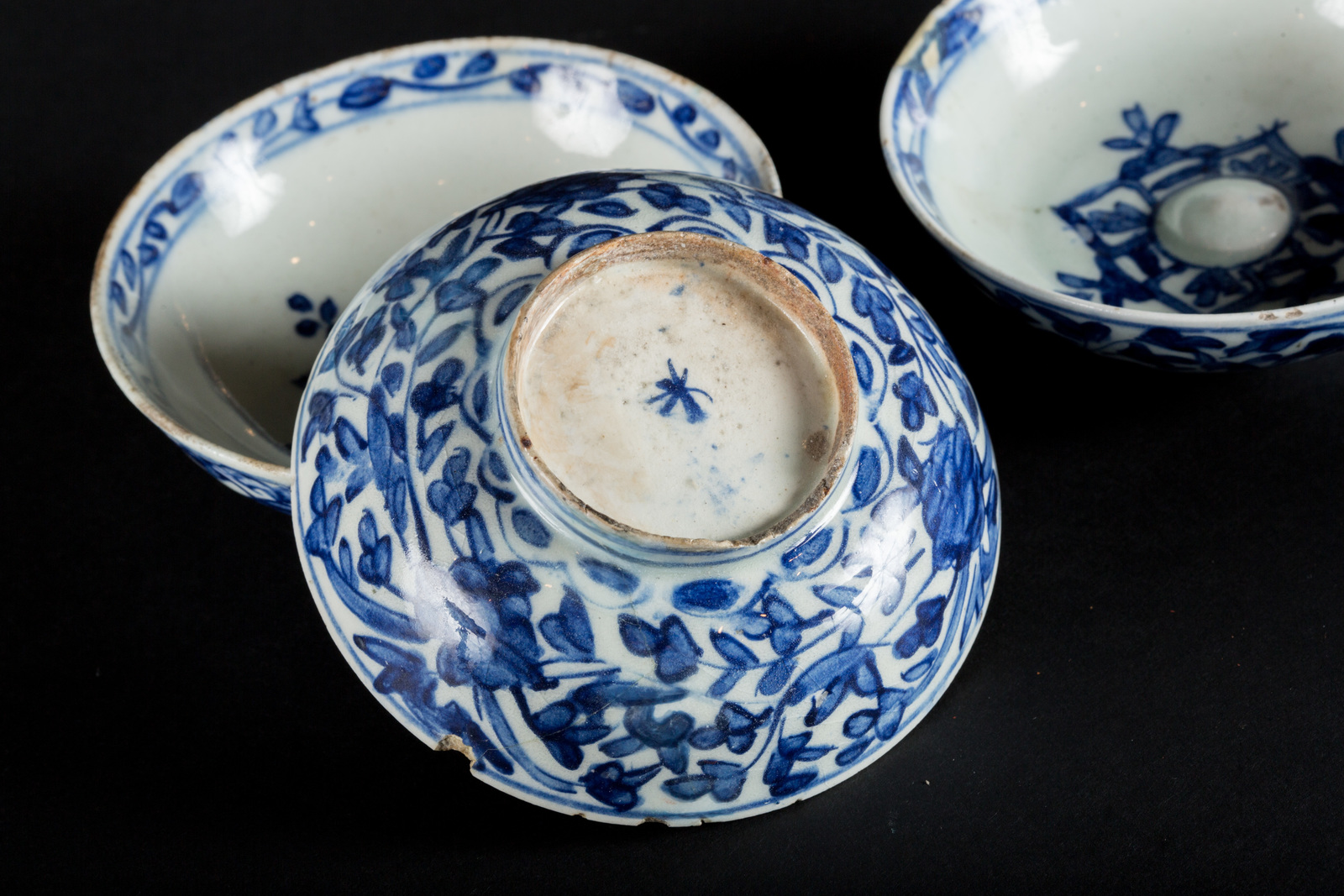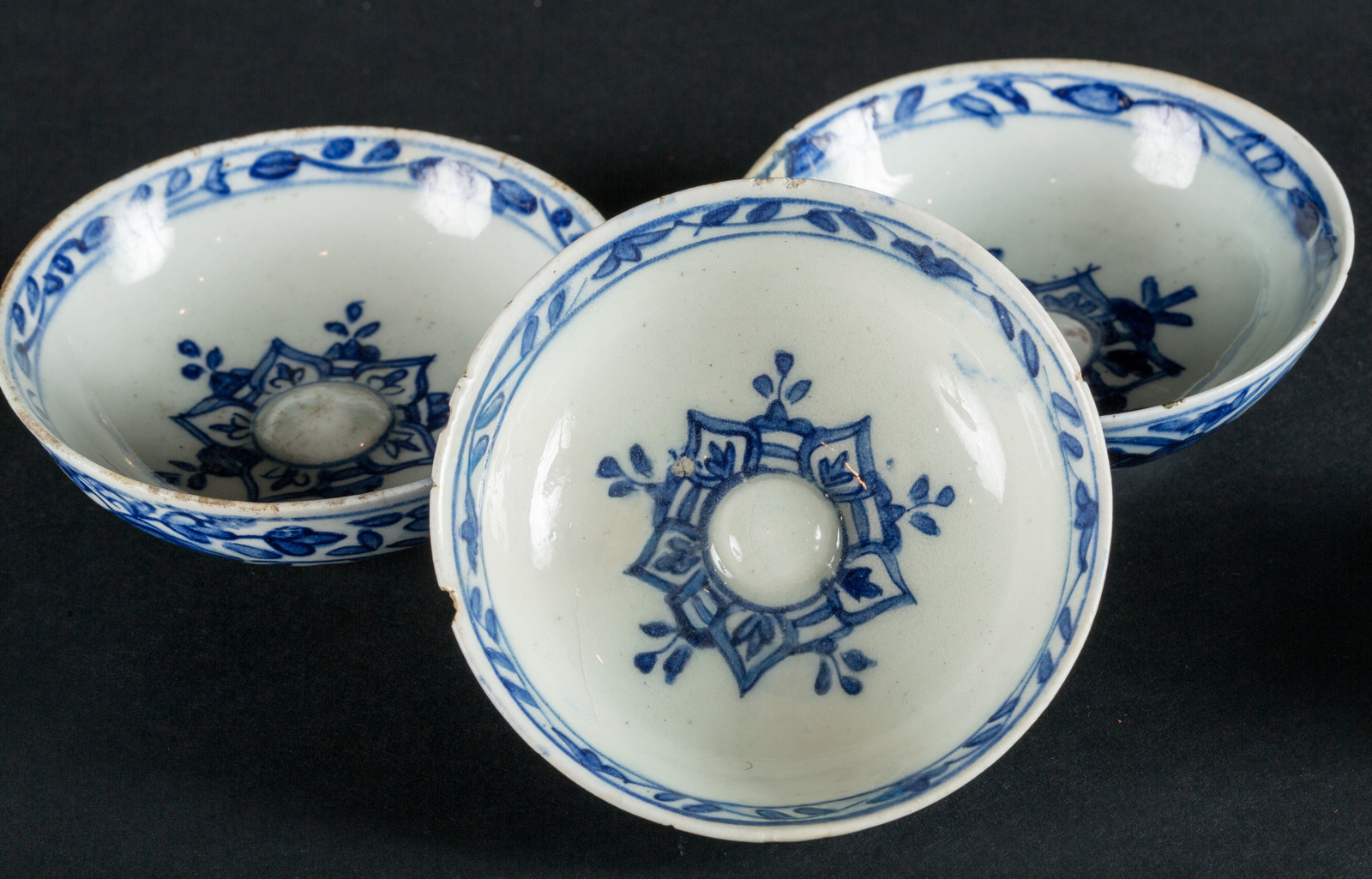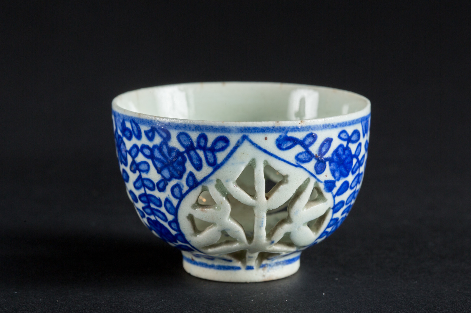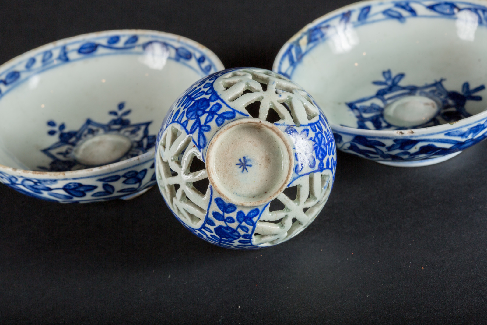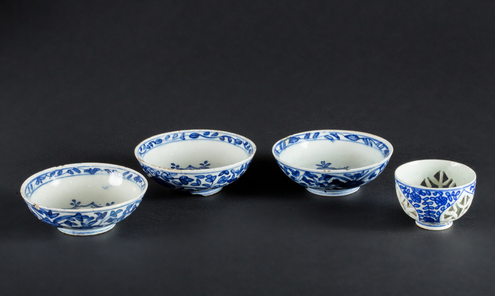 Turchia, Kutahya, XVIII secolo . -. Cm 10,00 x 7,50. Tre piattini in fritta dipinta con motivi floreali in blu sottocoperta ed una sola coppetta, dello stesso servizio, caratterizzata da un simile decoro floreale e da tre riserve lavorate a traforo. Piattini e tazzina riportano lo stesso piccolo marchio dipinto sulla base.
