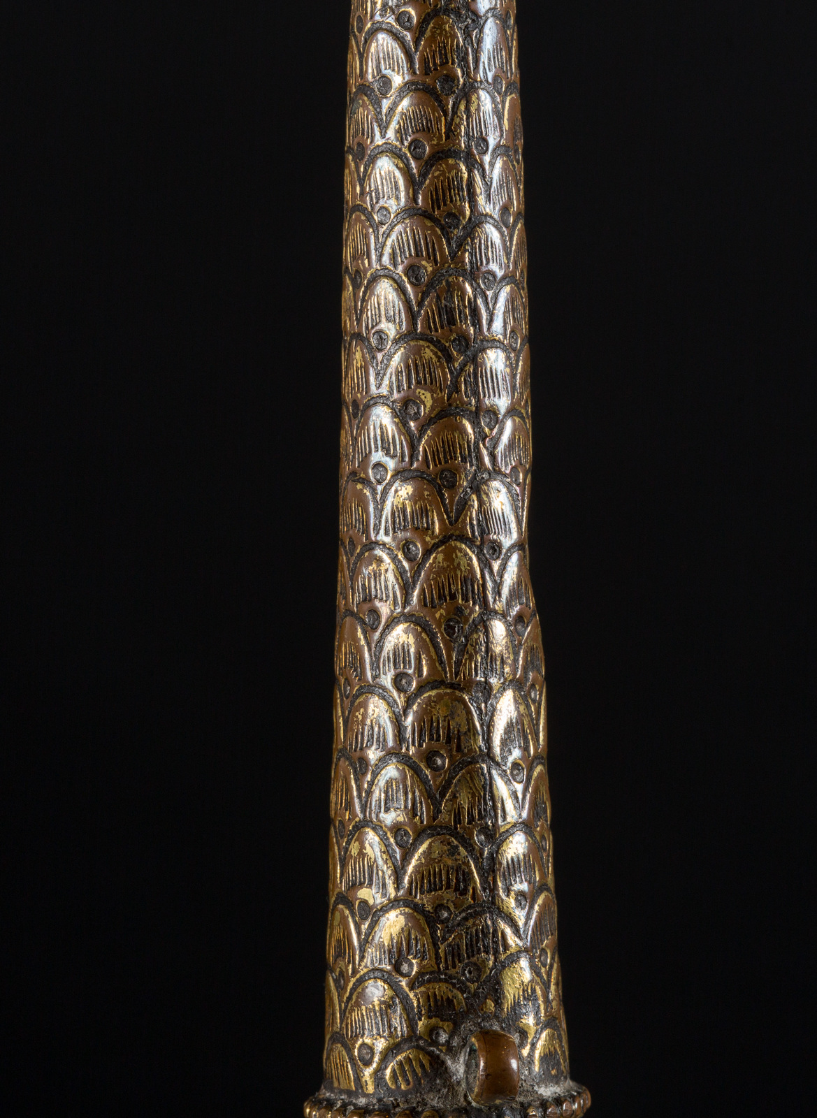 Arte Islamica Bottiglia in porcellana rosso e bianca con montaggio tombak sul collo Cina/Turchia, XVIII secolo . -. Cm 10,00 x 26,00. Bottiglia del periodo Kangxi, poggiante su disco, il corpo globulare decorato con rami di foglie in rosso sovracoperta e fiori in rosso sottocoperta. Il collo mostra montaggio in rame dorato (tombak) cesellato con motivo a scaglie di pesce.