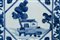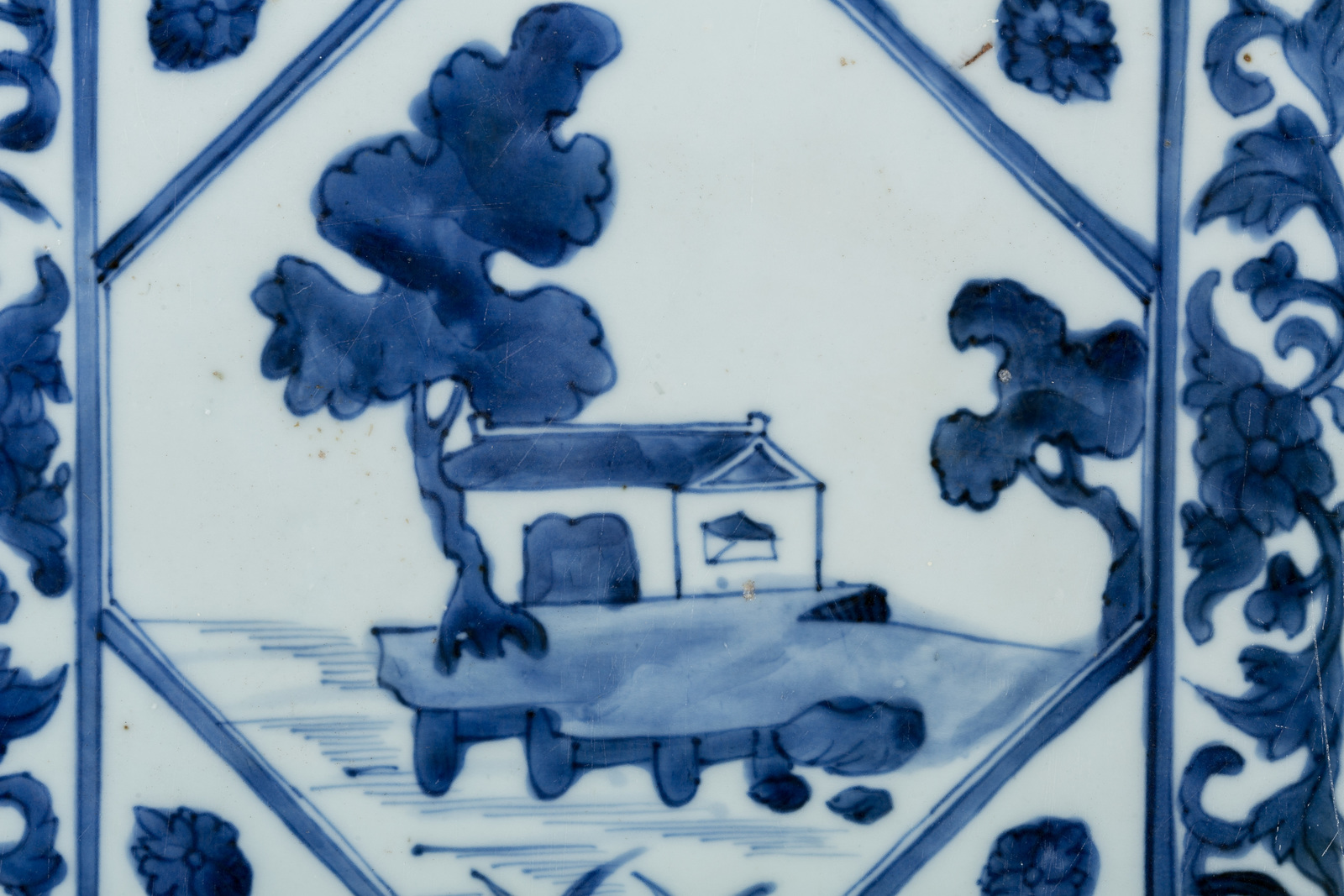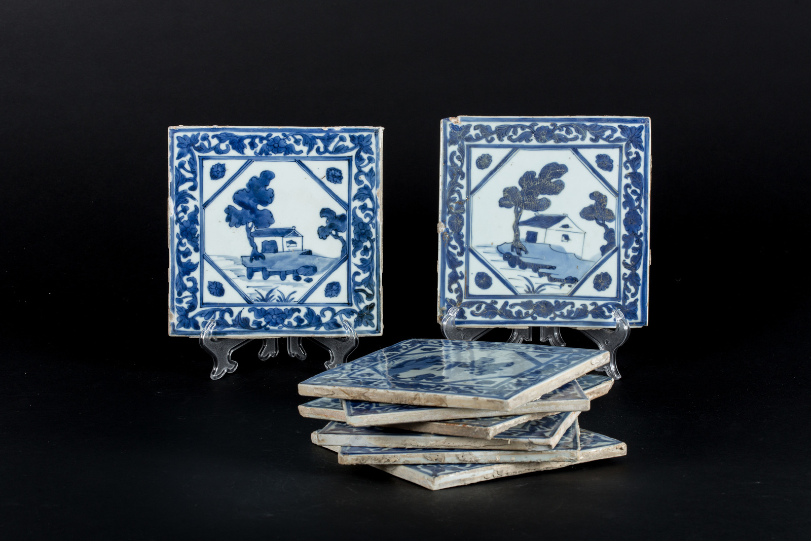 China, late 17th, early 18th century . . Cm 20,50 x 20,50. Set of eight square shaped tiles, the front is in blue underglaze with touches of gold, beneath a transparent glaze, picturing a small house beneath a tree, in the vicinity of a lake, encased in a rhomboid frame, and edges with twining floral ornamentation.