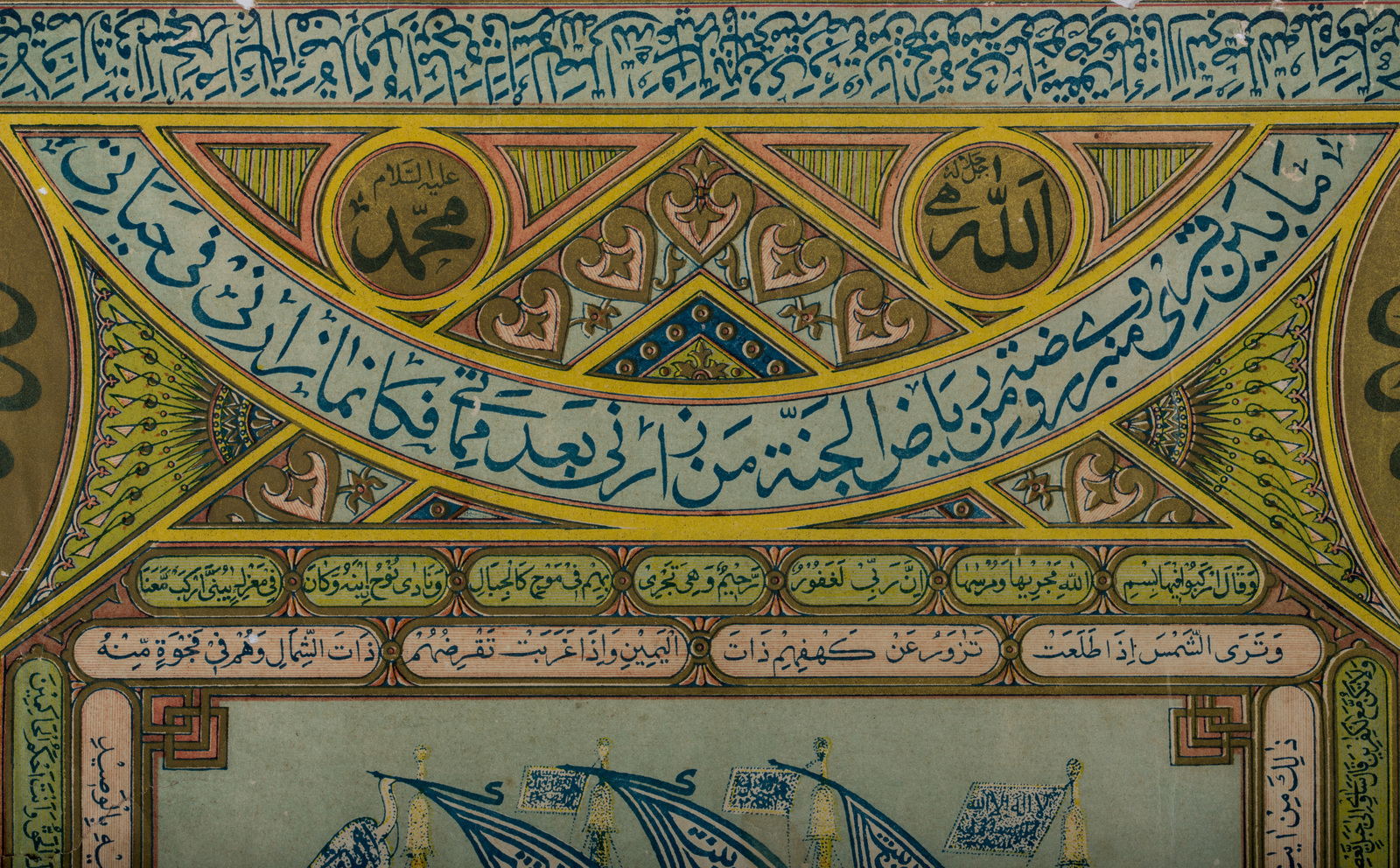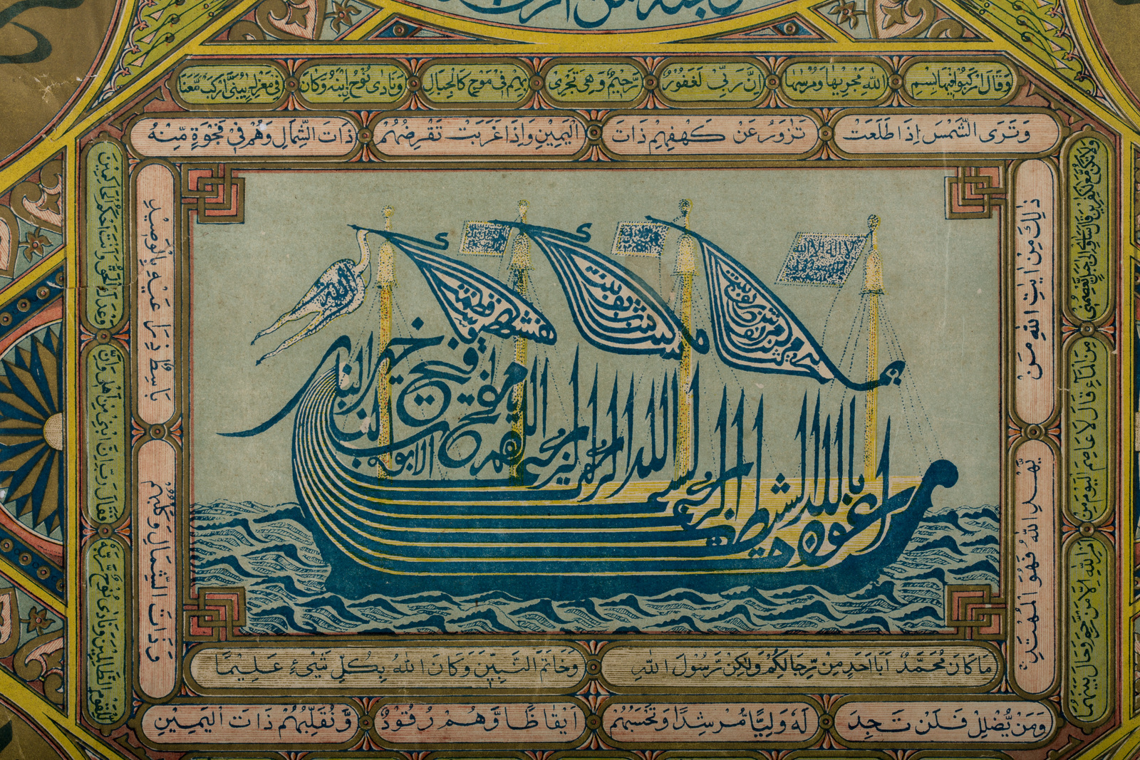 L'opera pesenta similitudini con un disegno inchiostro e oro su carta nominato appunto Calligraphic Galleon, attribuito al calligrafo Abd al-Qadir Hisari e datato 1180 (1766-67), conservato al Metropolitan Museum di New York Acc. No. 2003.241, mentre i pannelli calligrafici circolari, contenenti i nomi degli Imam Sciiti e Sunniti, ricordano quelli dipinti per Aghia Sofia dal famoso calligrafo Kadıasker Mustafa İzzet Efendi alla metà del XIX secolo.