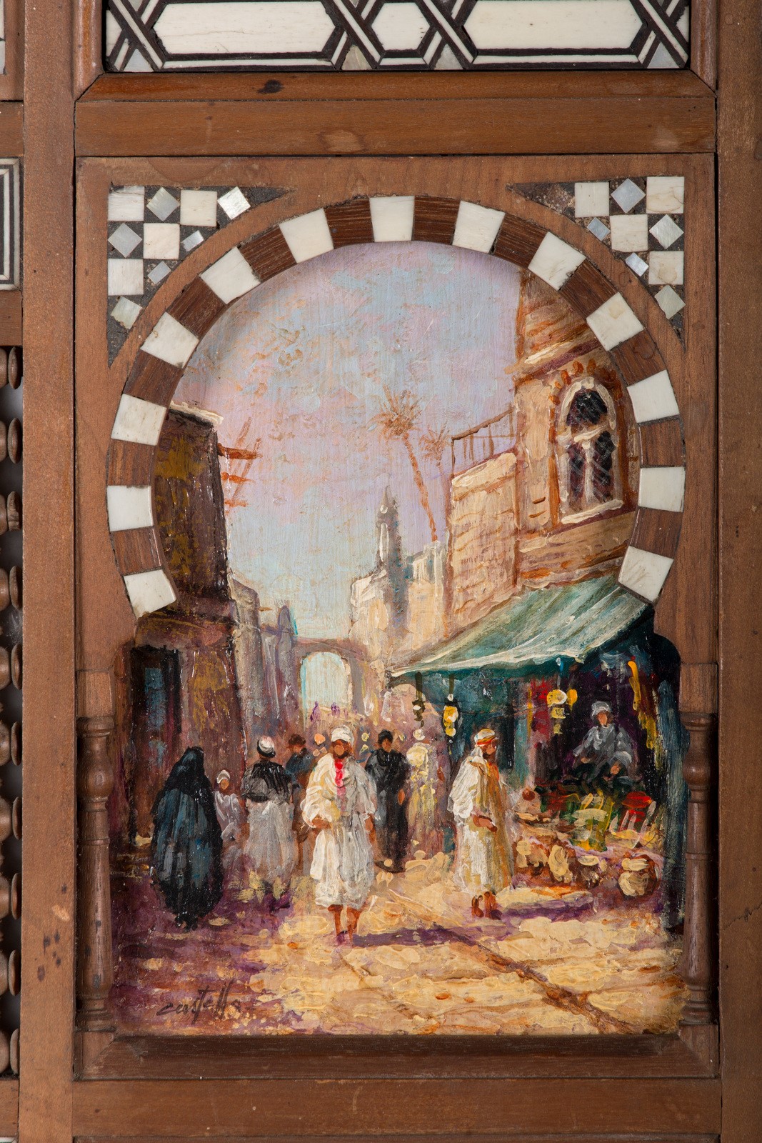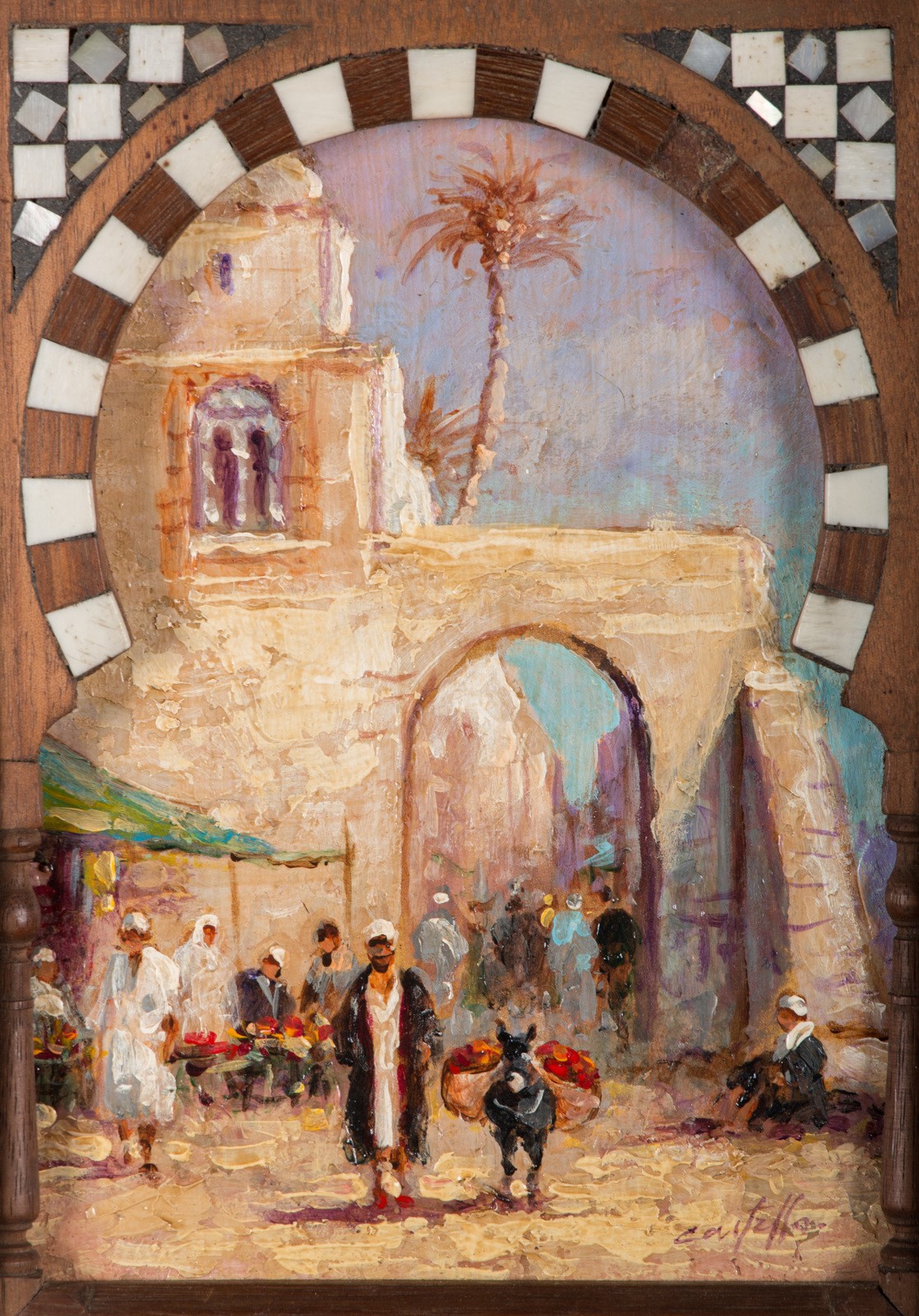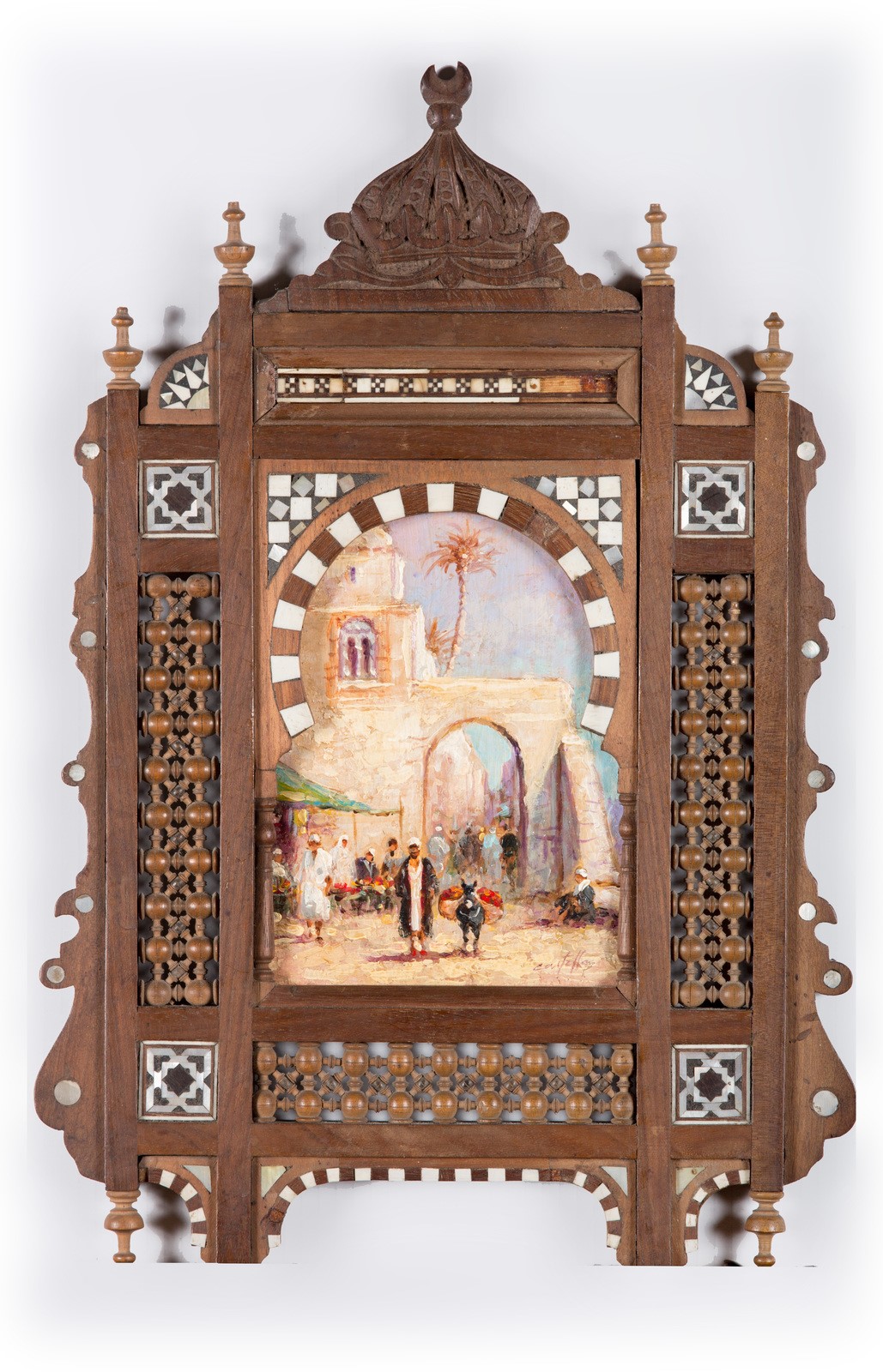 Arte Islamica Coppia di dipinti orientalisti entro cornice architettonica in legno