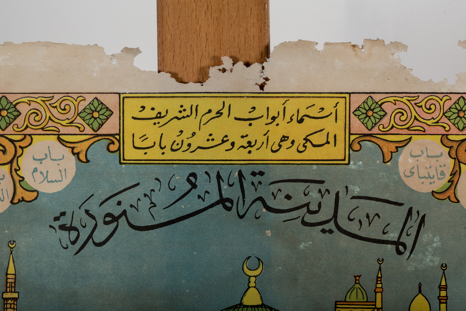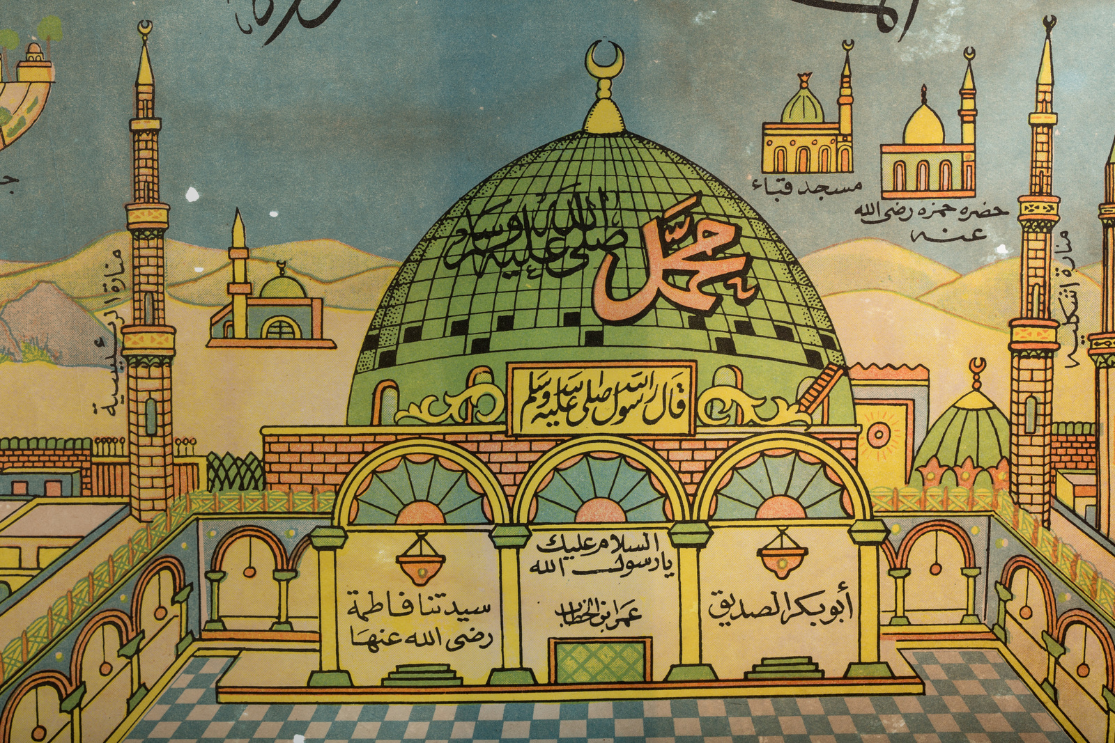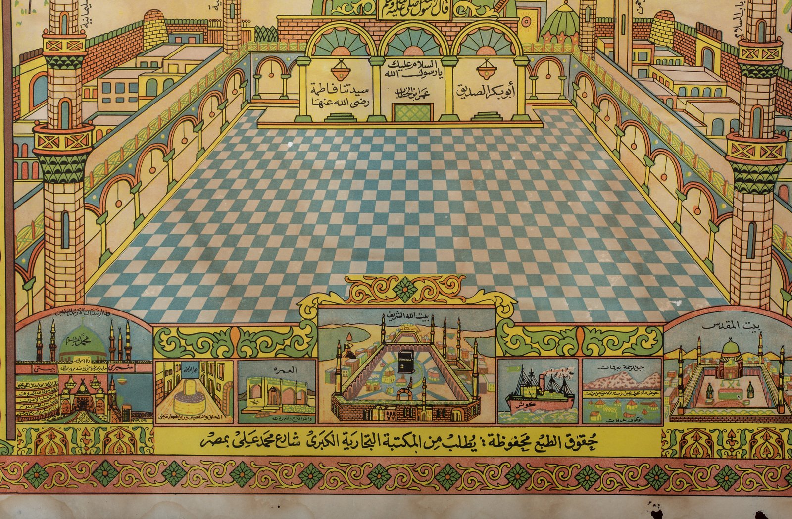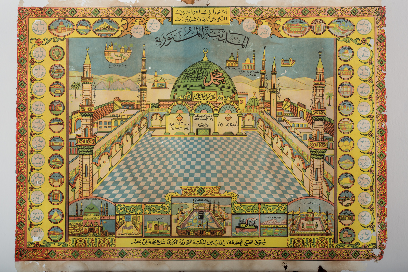 ARTE ISLAMICA Stampa su carta raffigurante Medina Turchia, fine XIX - XX secolo . -. Cm 63,00 x 47,50. Raffigurazione, forse per pellegrini, con la moschea di Medina e, più piccole, immagini di altri luoghi sacri dell'Islam tra cui La Mecca e Gerusalemme. Le iscrizioni indicano i nomi delle porte della moschea di Medina ed, in fondo, un'iscrizione relativa al copyright di un grande ufficio commerciale.