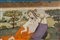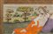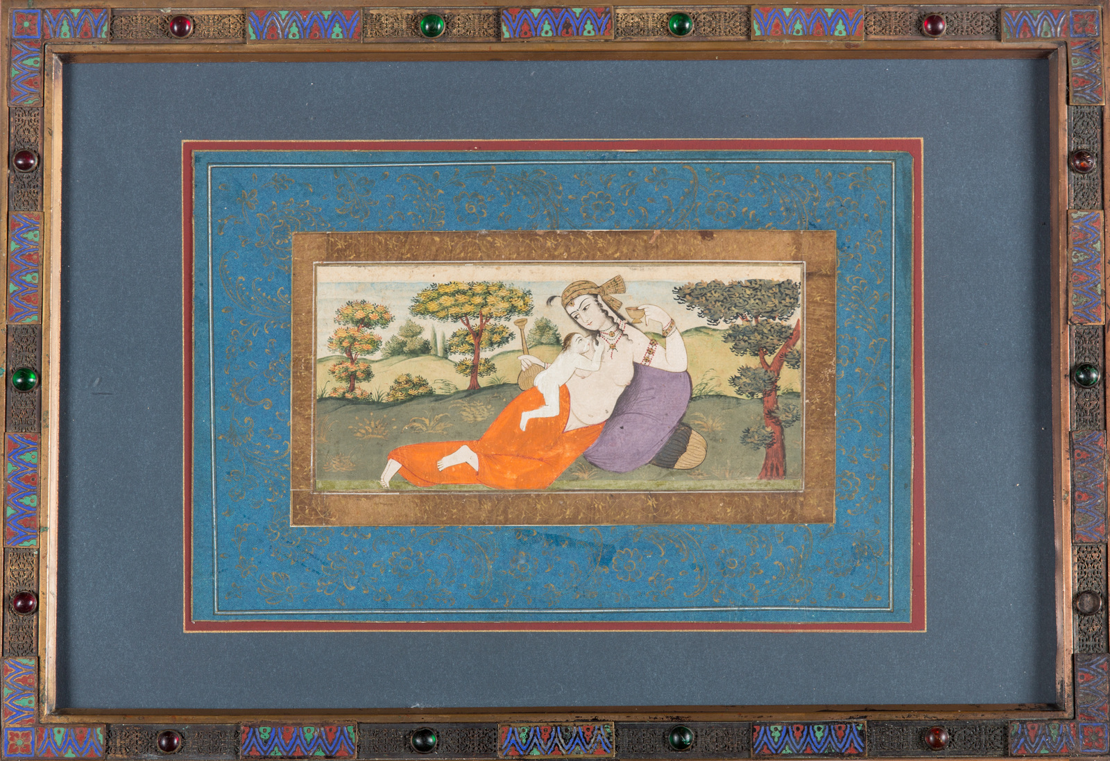 Pigmenti naturali e oro su carta . -. Cm 21,00 x 31,50. Raffinato dipinto raffigurante una donna a petto scoperto, adagiata sul terreno, appoggiata ad un cuscino e con un bambino in grembo. La donna ha coperto le gambe con un drappo arancione e mostra una bottiglia di vino nella sua mano destra ed una coppetta per berlo nella sinistra. Intorno ai due protagonisti alberi, prati e colline di evidente stampo europeo.