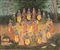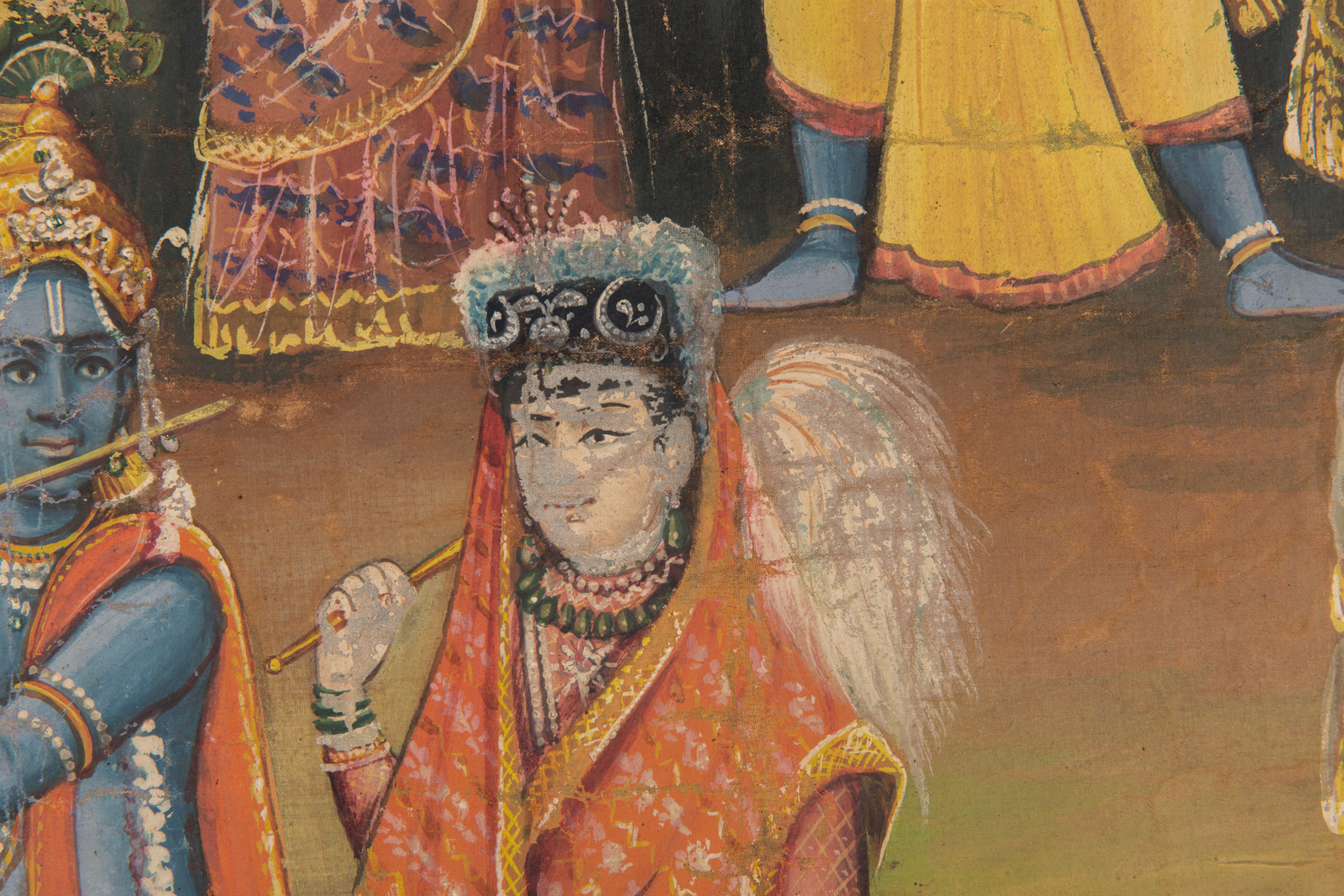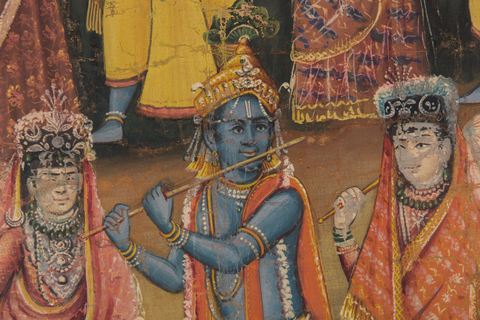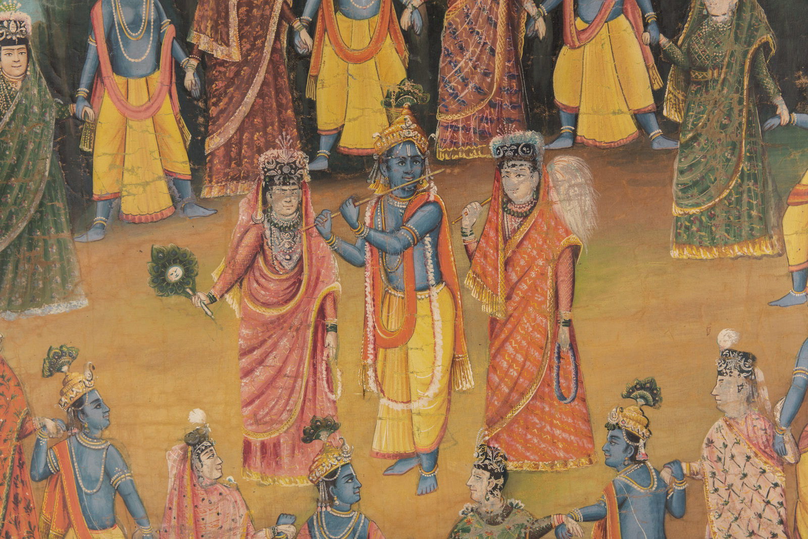 Nepal, late 19th century . . Cm 121,50 x 104,00. Rare and peculiar painting on canvas, depicting the dance of Krishna with the gopi (cowhands devotees), and with the female figures all having the face, the semblance and the jewels of Queen Victoria (reigning 1837-1901). Such peculiarity helps in dating the painting as subsequent to the visit of the queen to India, and the following invite to the court in London extended to the king of Nepal, which took place in 1850.