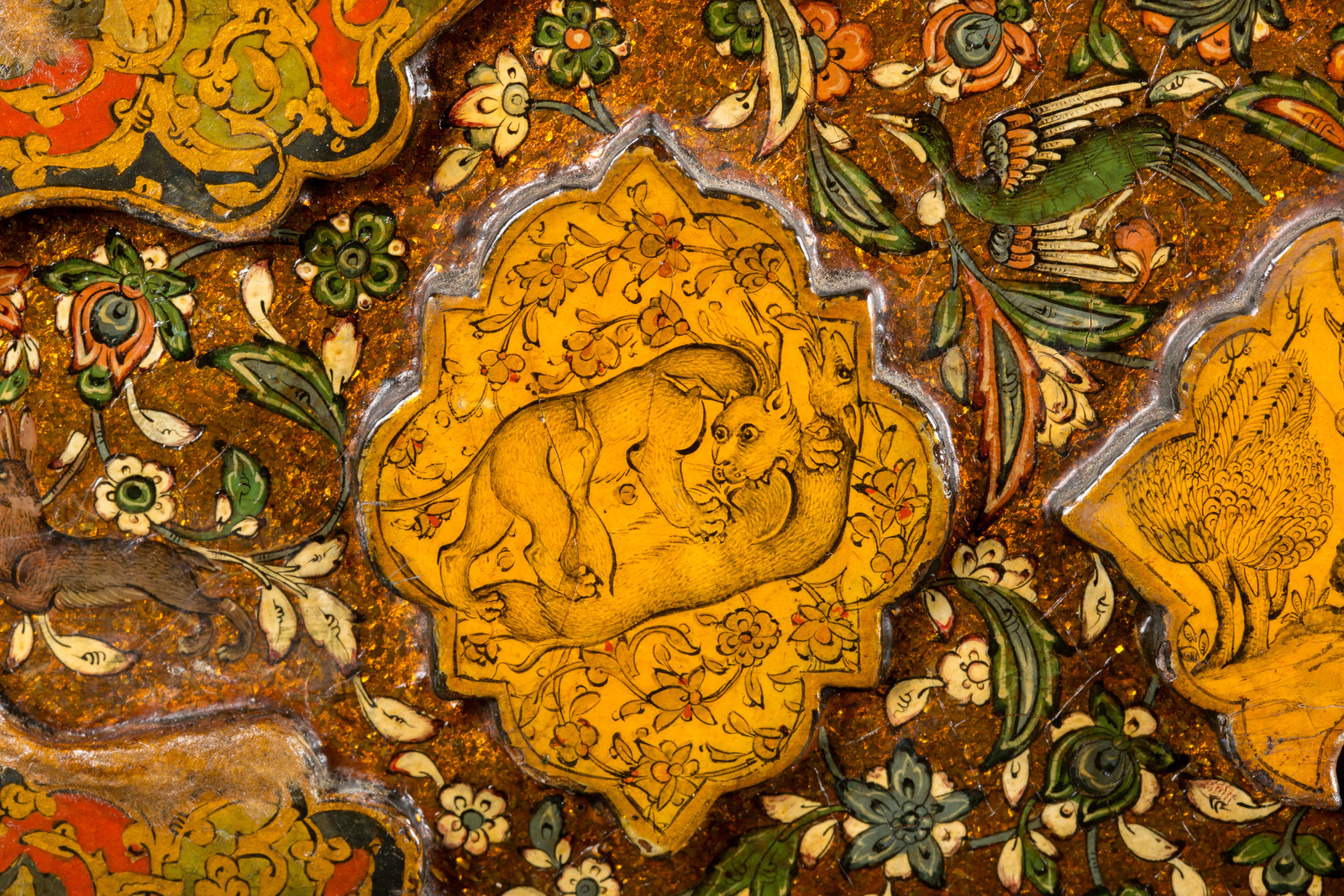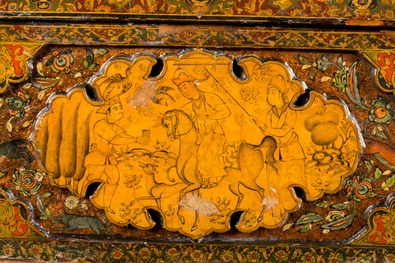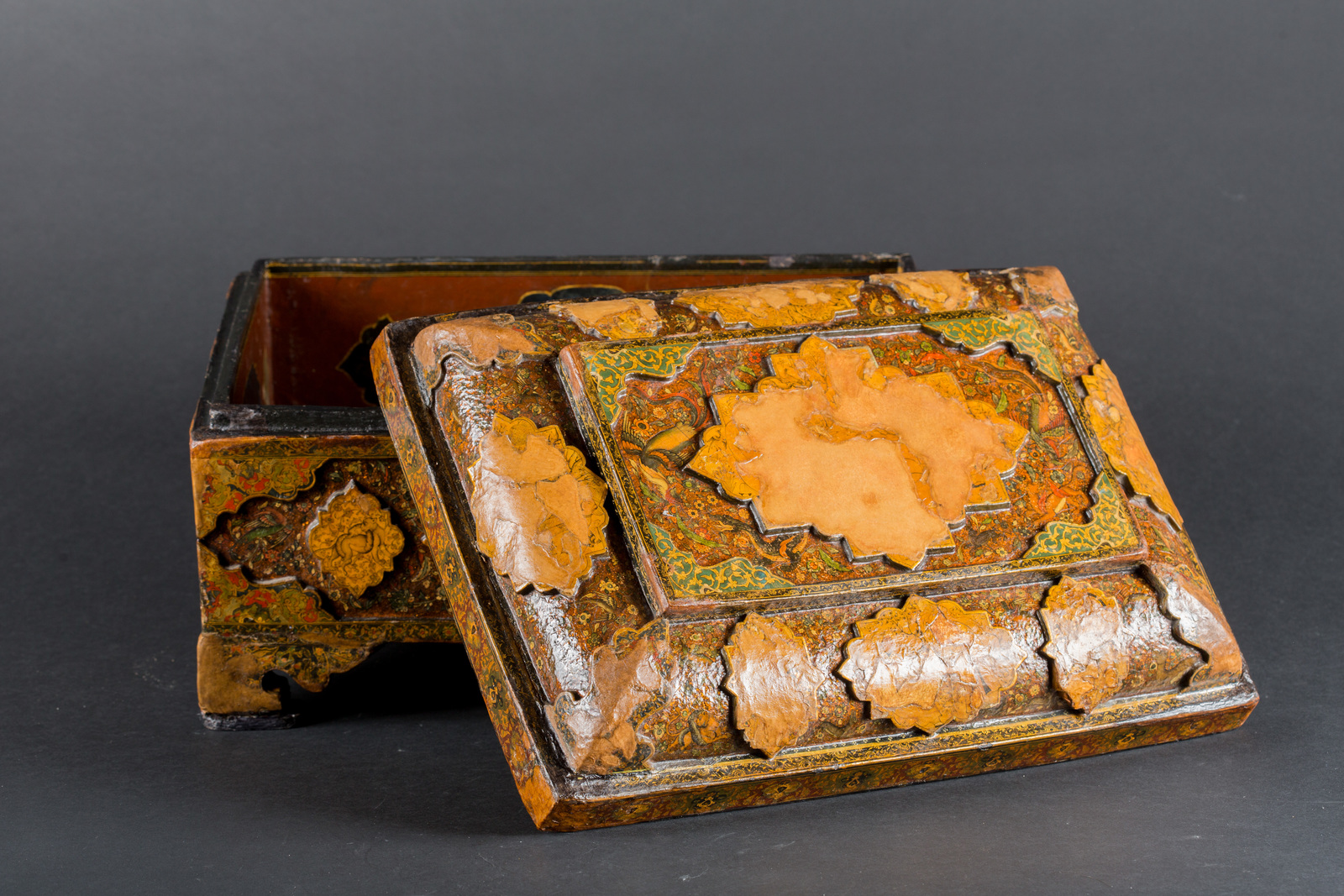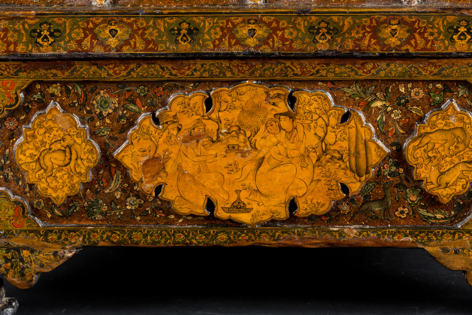 Ink and natural pigments highlighted with gold. . Cm 40,50 x 26,00 x 30,00. Exquisite rectangular box with rounded top and corner feet. The surface is richly ornate with high-relief crème colored lobed cartouches, on a background painted with flowers, birds and animals on a bronze colored iridescent base. The bigger cartouches are miniated with scenes in Safavide style, depicting rural scenes with couples drinking wine or the game of polo. The smaller cartouches are instead decorated with animals and flowers. The edges and the corners are filled with multicolored arabesques.