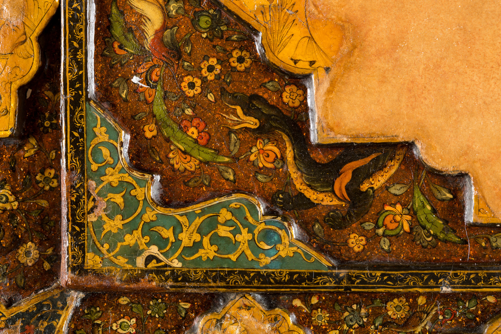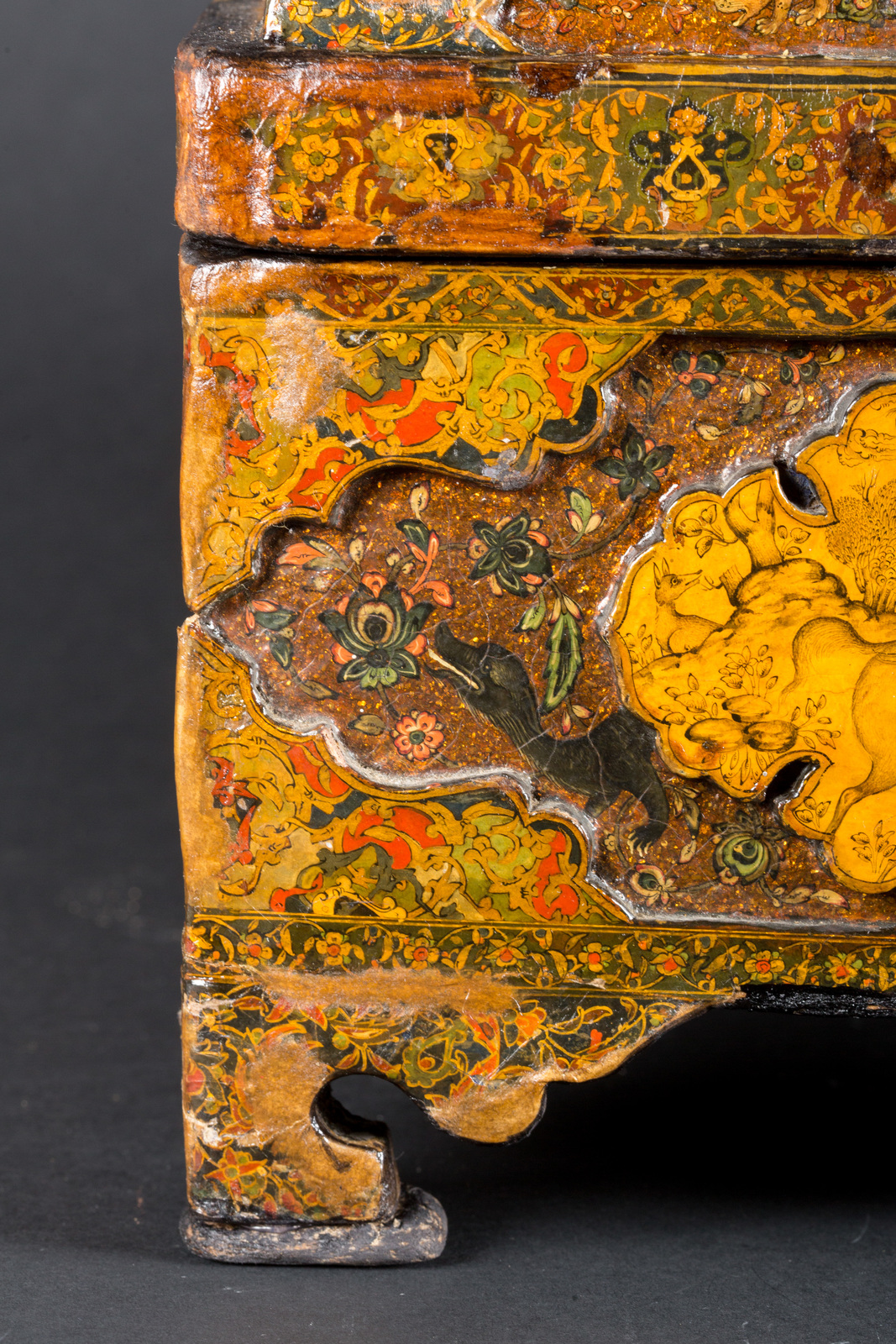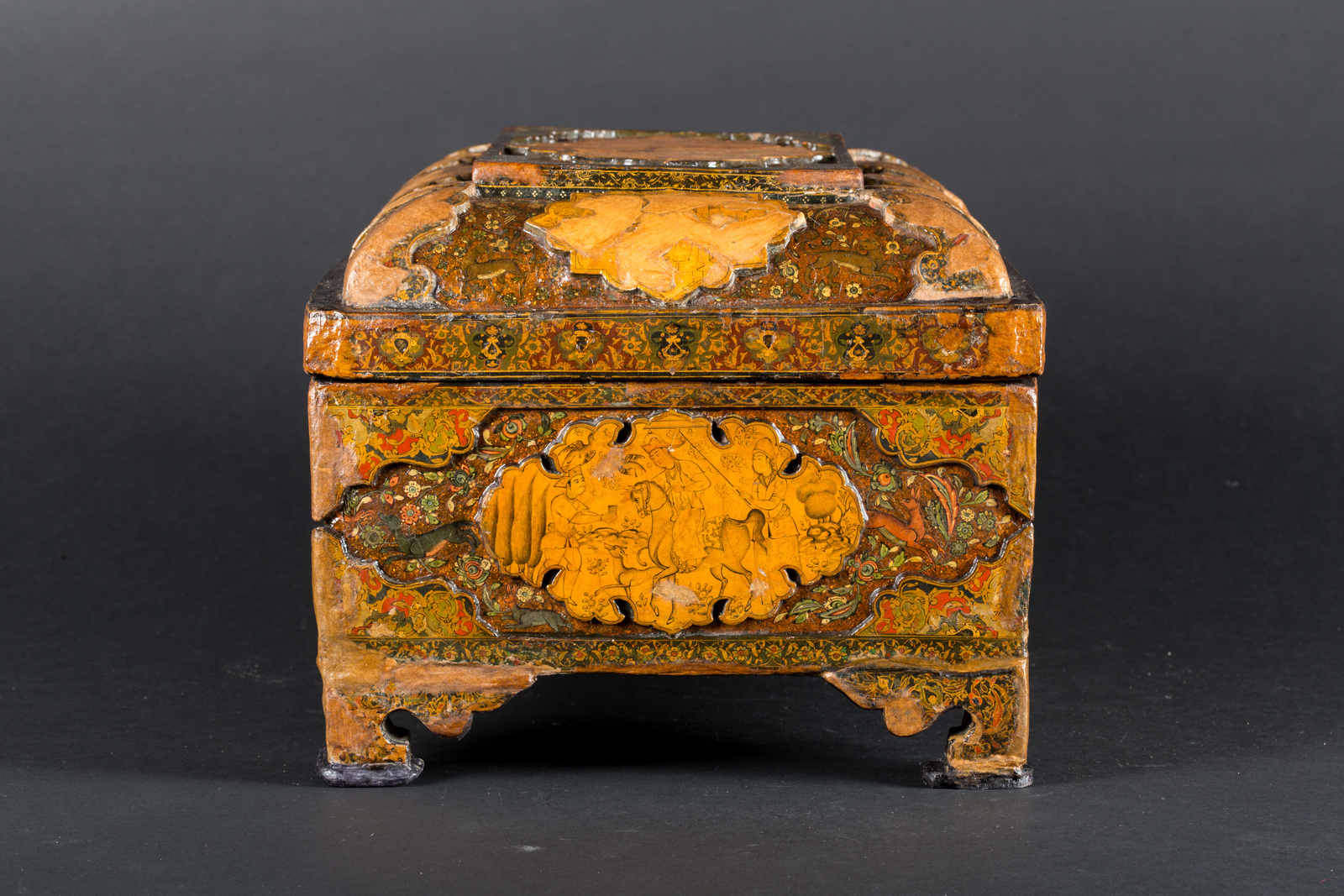 Iran, tardo XVII- XVIII secolo . -. Cm 40,50 x 26,00 x 30,00. Bellissima scatola rettangolare con coperchio bombato e piedini angolari. La superficie è riccamente decorata con cartucce lobate color crema in rilievo su uno sfondo minuziosamente dipinto con fiori, uccelli ed animali su base cangiante color bronzo. Le cartucce più grandi sono miniate con scene in stile tipicamente safavide caratterizzate da raffigurazioni di passatempi campestri con coppie che bevono vino e il gioco del polo, mentre le cartucce più piccole sono dipinte con animali e fiori. I bordi e gli angoli sono fittamente riempiti di arabeschi variopinti.