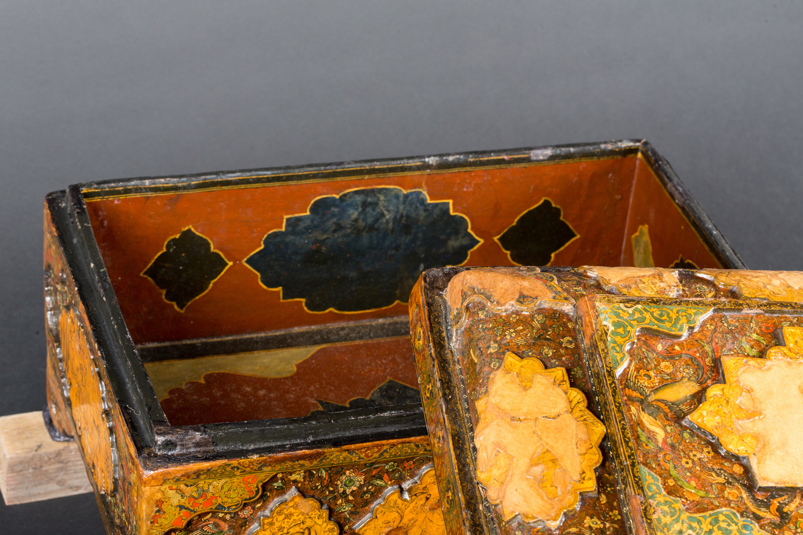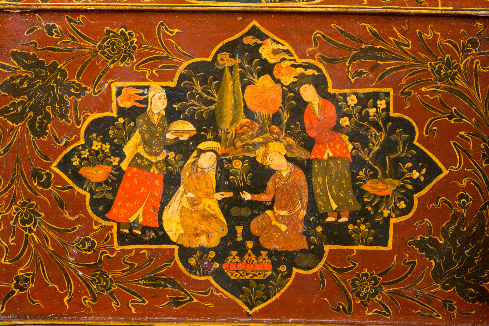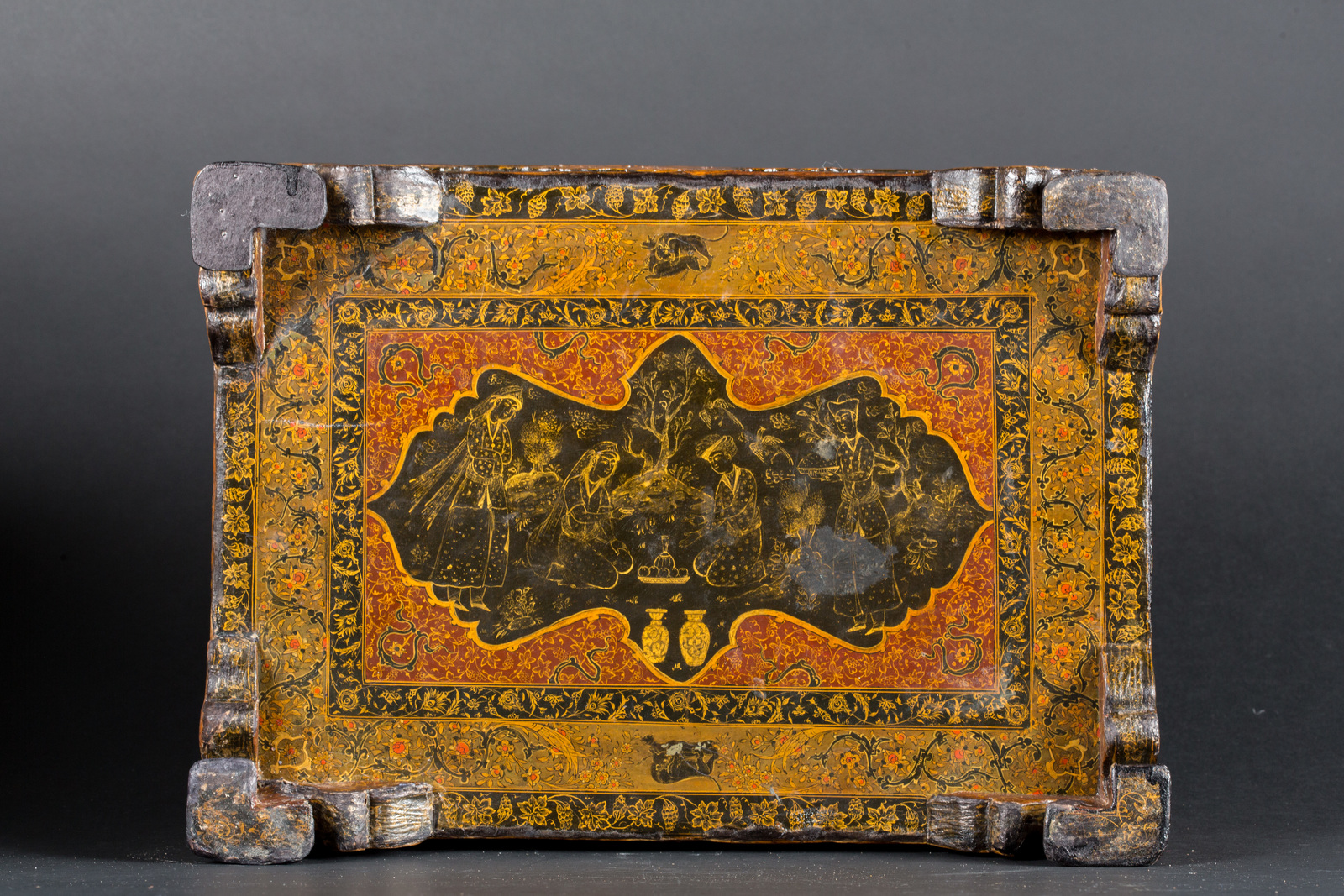 The inside of the lid is finely painted with floral motifs on a red background, while five cartouches with scenes depicting couples are on the exterior side; the base is decorated with similar motifs, though in golden paint on black.