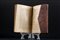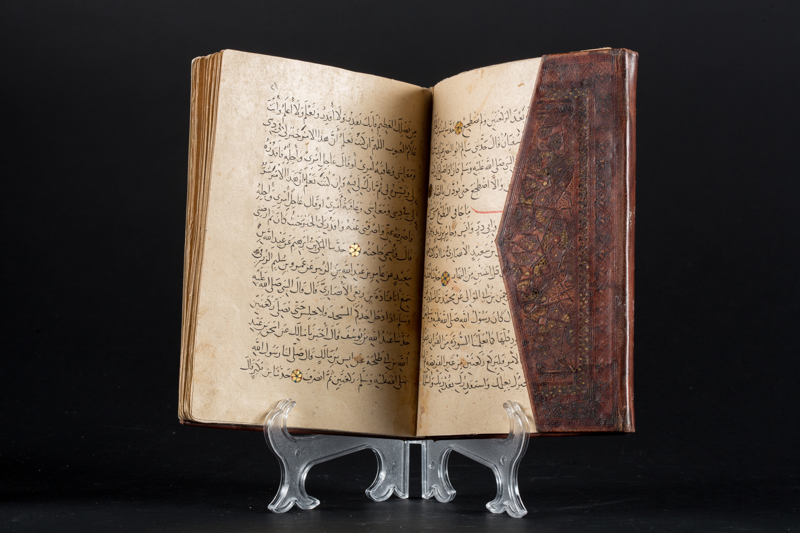 Bellissima rilegatura Mamelucca in pelle con aletta, intagliata a motivo geometrico e dorata sull'esterno, mentre l'interno presenta simili motivi geometrici ed iscrizioni appena visibili che recitano: Muhammad rasul Allah (Maometto è il messaggero di Allah).