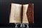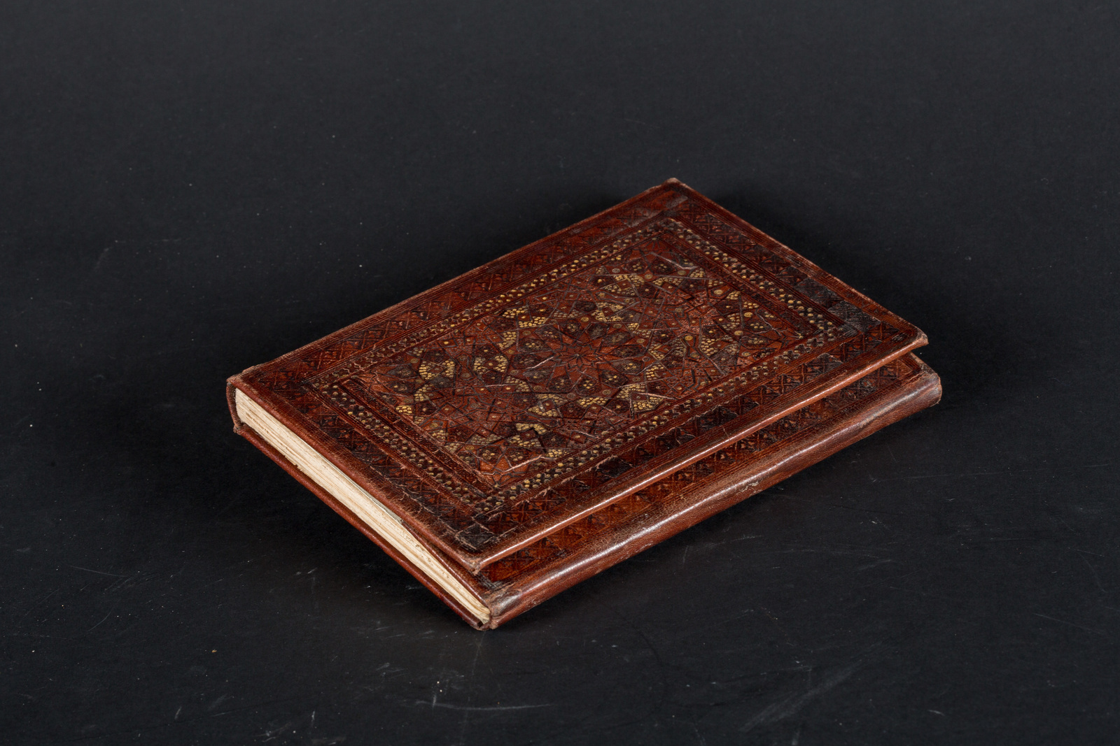 Beautiful Mamluk leather binding with flap, carved with a geometrical pattern and gilded on the exterior side, while the interior bears similar geometrical patterns, and barely visible inscriptions: Muhammad rasul Allah (Muhammad is Allah’s messenger).
