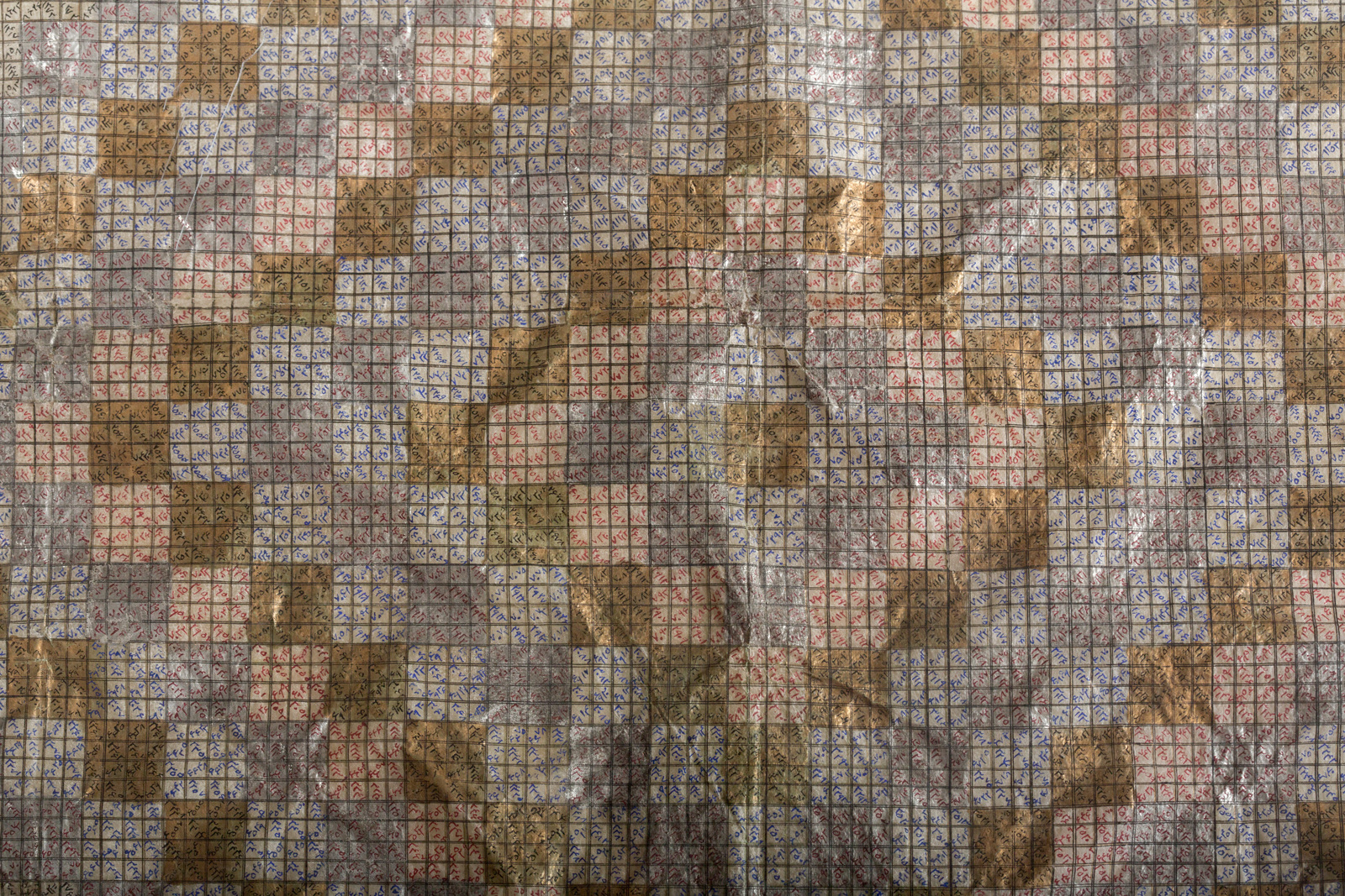 Iran, Qajar dynasty, dated 1320 (1902 AD). . Cm 55,00 x 60,00. Of rectangular shape, with concentric frames and a rhomboid central part, with golden, silver and empty squares in the background. Dense writing with minute characters in black , green, red, and blue ink, with formulae, number of the abjad and some Hebraic symbols. In the upper part, in central position, is a lobed cartouche, with Persian writing, stating that Amir Ahmad Borhan Sultan commissioned the work for the health of the body. Dated 1320 (1902 AD).