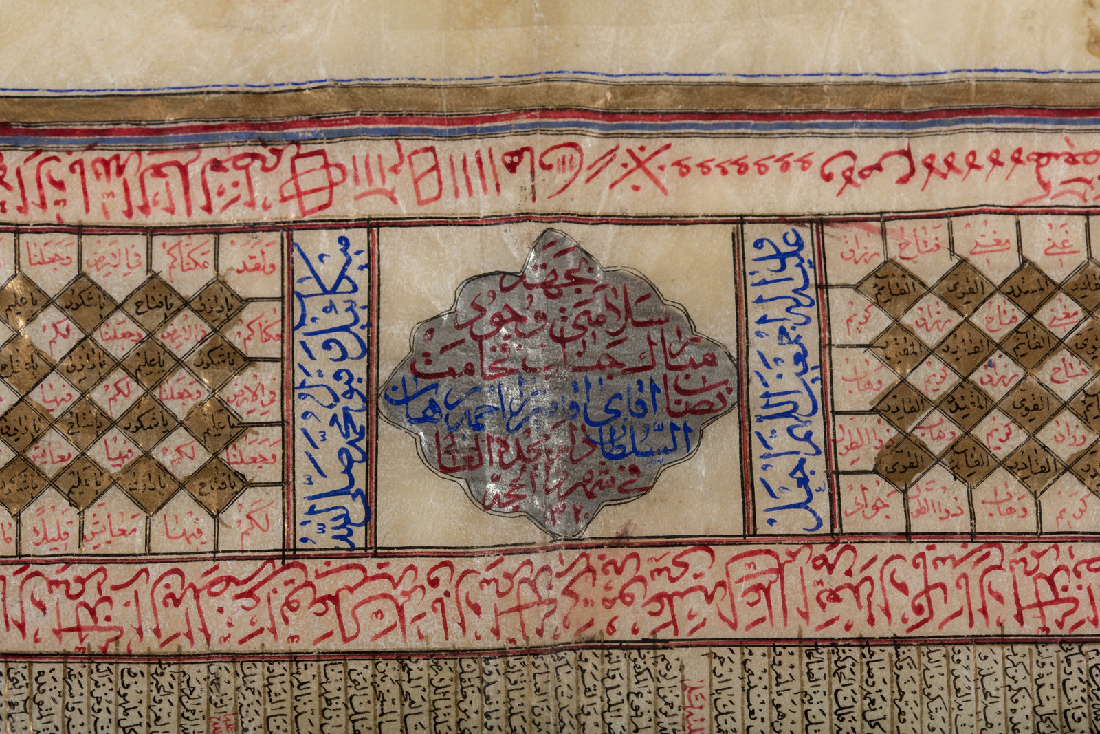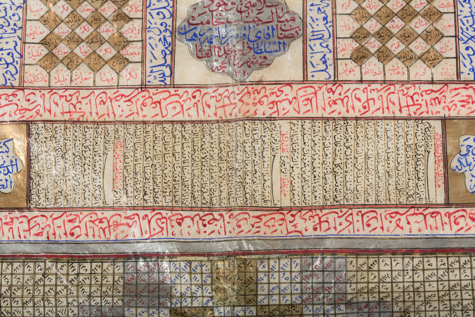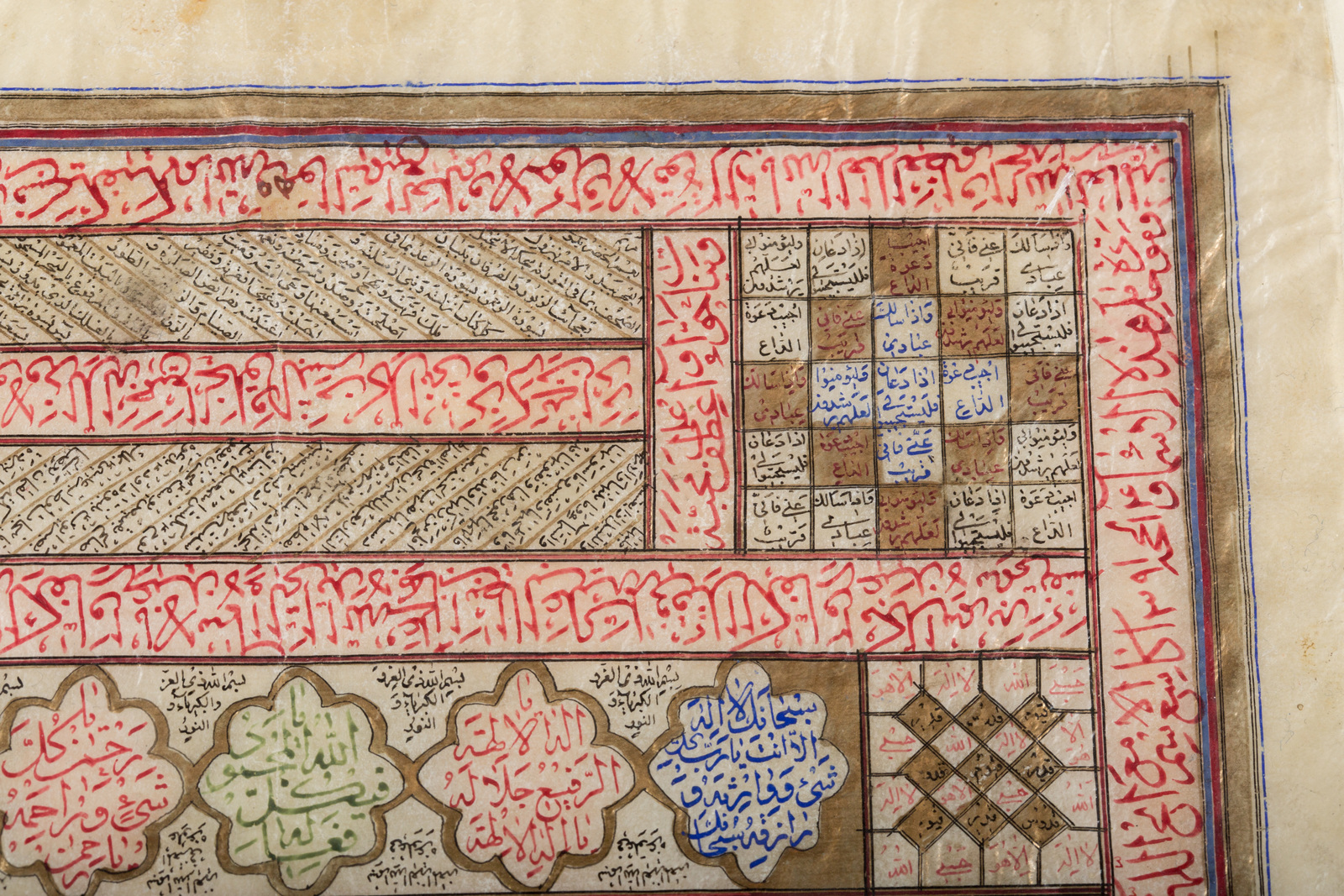 Iran, dinastia Qajar, datato 1320 (1902 AD). -. Cm 55,00 x 60,00. Di forma rettangolare, con cornici concentriche che portano verso il centro romboidale tassellato con quadretti dorati, argentati e risparmiati sul fondo. Tutto fittamente iscritto in piccolissimi caratteri con inchiostro nero, rosso, verde e blu con formule, numeri dell'abjad e qualche simbolo ebraico. In alto, in posizione centrale, un cartiglio lobato, scritto in persiano, che recita che Amir Ahmad Borhan Sultan abbia commissionato l'opera per la salute del corpo, datato 1320 (1902 AD).