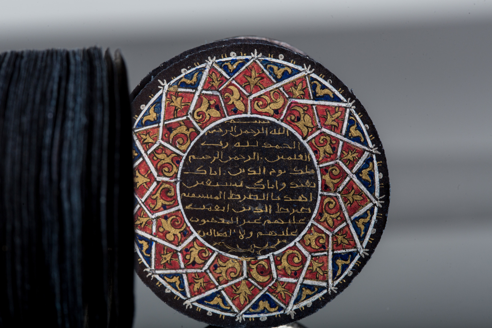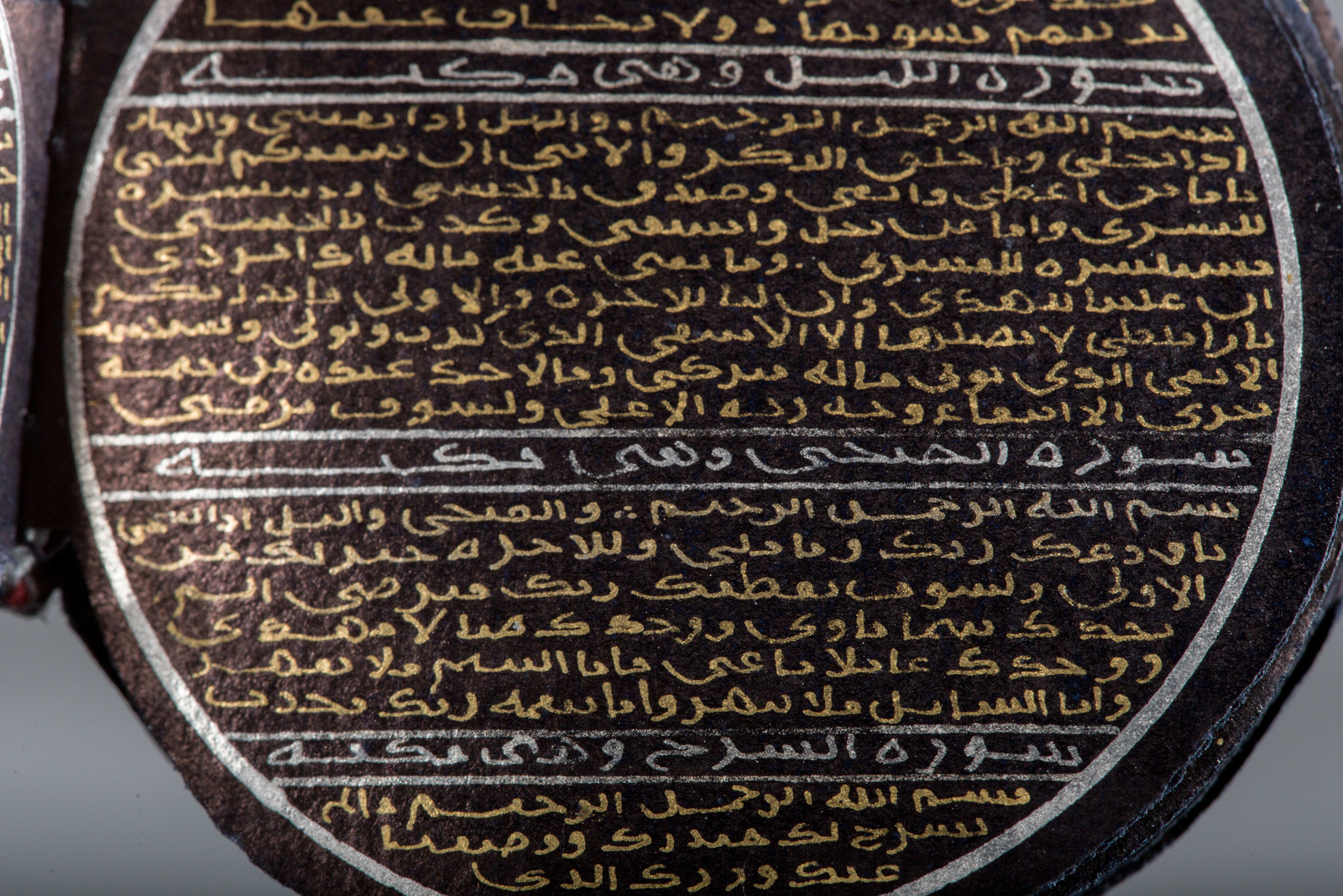 Arte Islamica Piccolo Corano tascabile circolare con rilegatura in pelle...