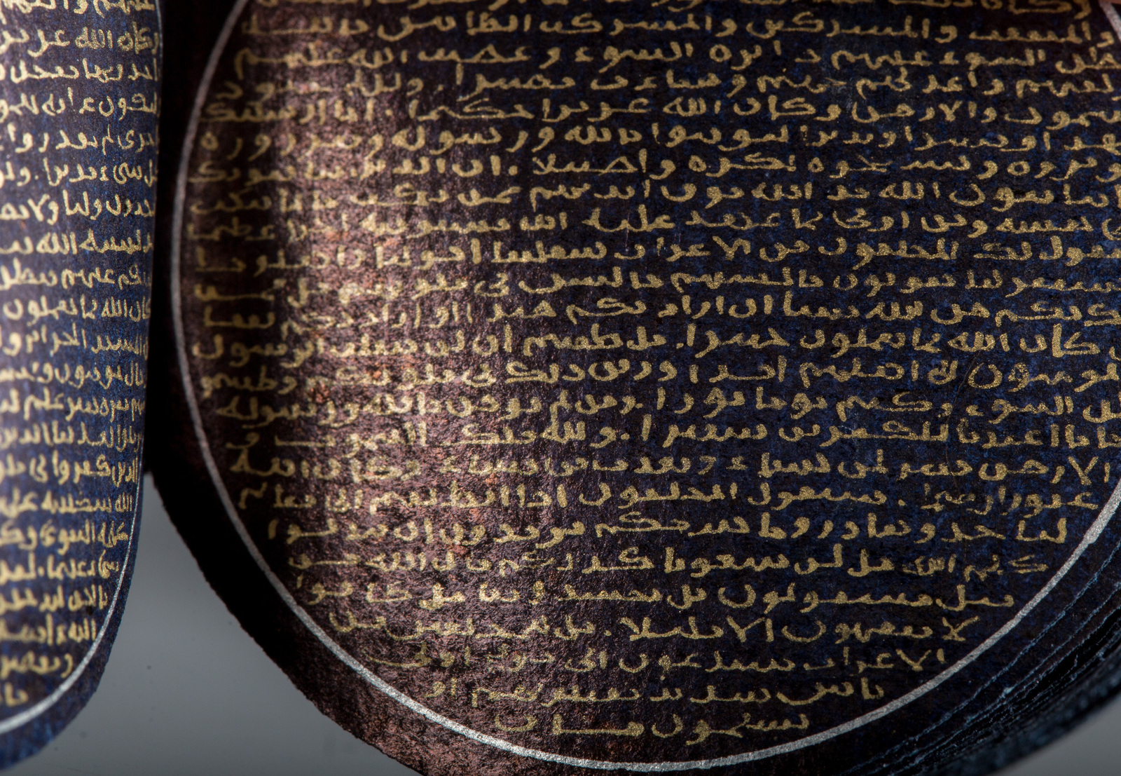 Arte Islamica Piccolo Corano tascabile circolare con rilegatura in pelle dorata copiato da Ahmad Hamdi Almarrruf Be Emam Jame Sultan Salim Khan