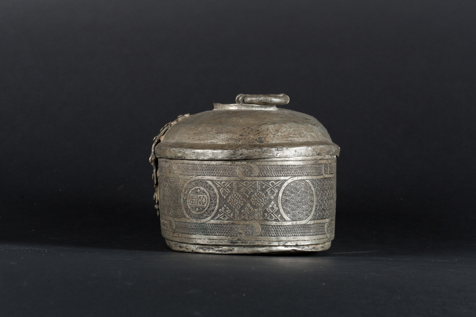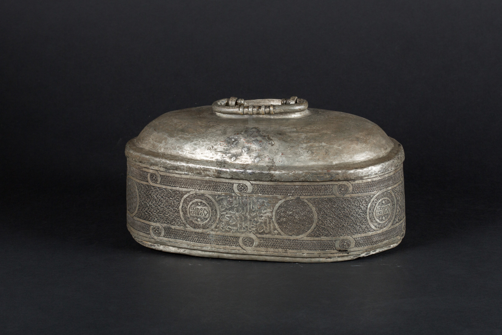 Domini Mamelucchi, XV secolo . -. Cm 30,00 x 18,00 x 20,00. Di forma ovale, il coperchio a cupola incernierato sul corpo dell'oggetto inciso con due sottili fasce contenenti motivi a catena intervallati da rosette ed una più ampia fascia centrale recante iscrizione di carattere religioso in posizione centrale, seguita da medaglioni circolari riempiti da motivi astratti geometrici alludenti all'infinito e medaglioni contenenti lo stemma dei segretari (il portapenne) su sfondo di tralci intrecciati.