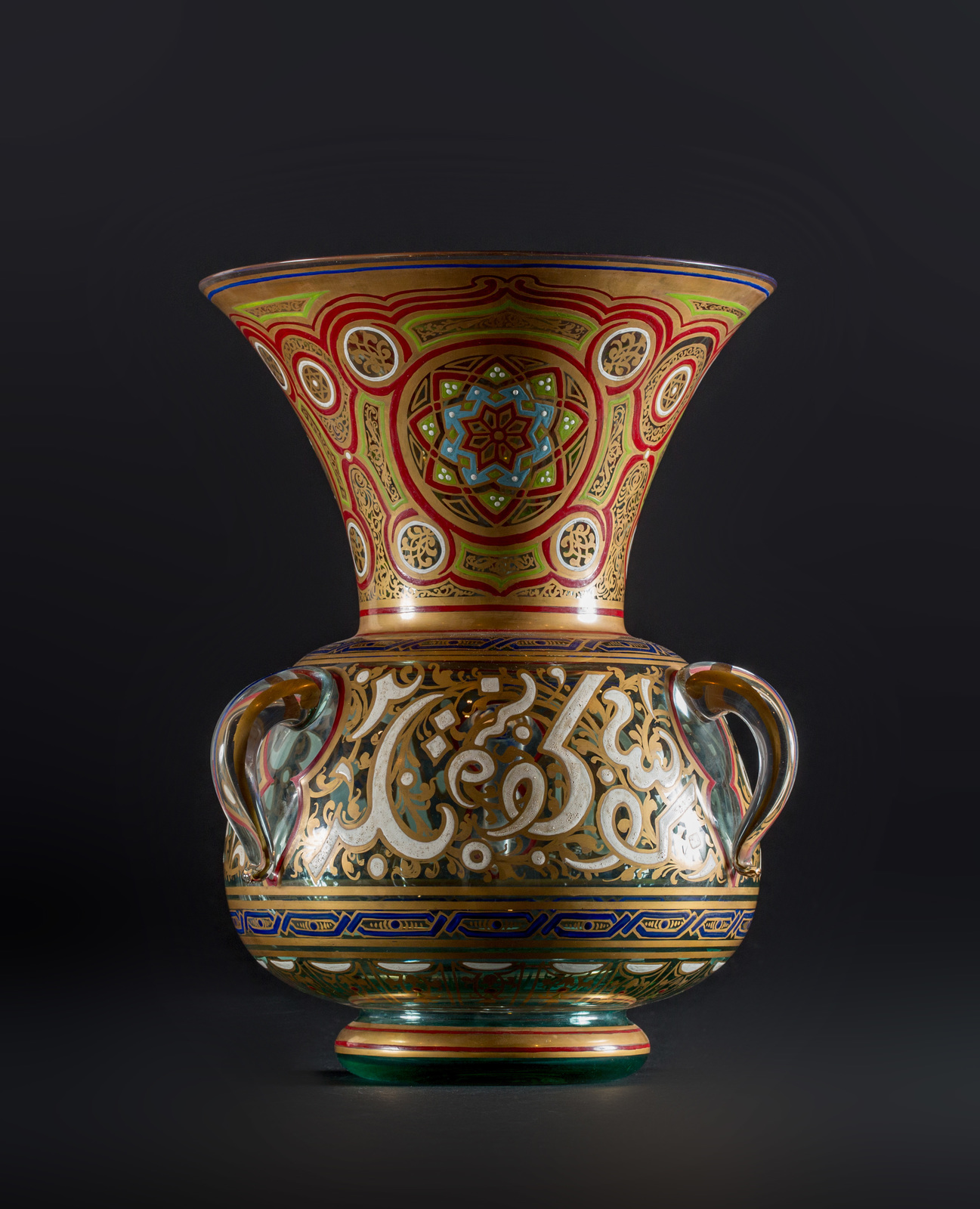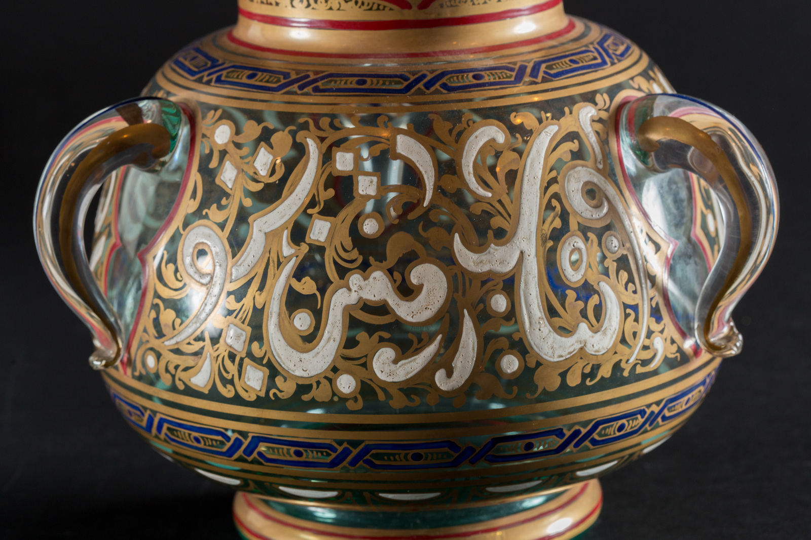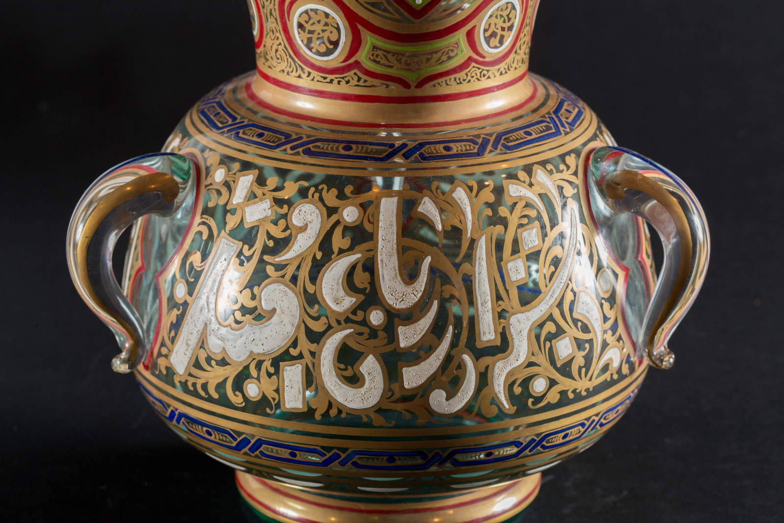 Arte Islamica A Mamluk style enameled glass mosque lamp Possibly France, late 19th early . . Cm 25,00 x 31,00. Of typical shape with rounded body on circular foot rising to a flaring conical mouth, three simple loop handles around the body, the body with Arabic calligraphy over gilt arabesque background, the neck painted with golden palmettes and red ribs, the base with panels containing the same floral design.