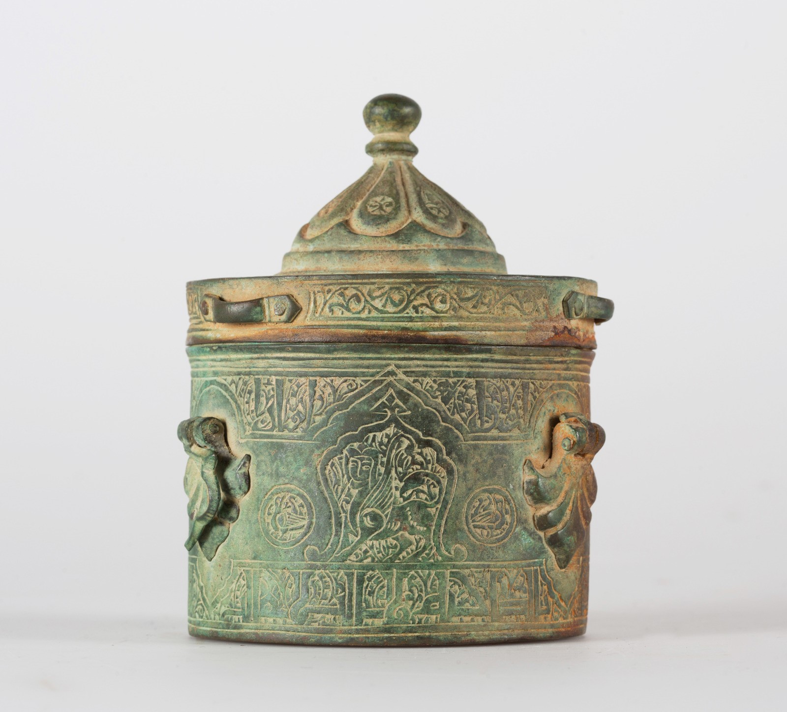Iran Orientale, Khorasan, XII - XIII secolo . -. Cm 9,50 x 14,00. Calamaio dalla forma architettonica, con il coperchio terminante con una cupola ad otto petali ed una lunga iscrizione, interrotta da tre rondelle, lungo il bordo. I margini del corpo dell'oggetto mostrano simile decorazione epigrafica su sfondo di ruote dentate, mentre la parte centrale reca riserve lobate contenenti delle sfingi affiancate da piccole rondelle con uccelli. Sulla base cartigli con spirali floreali e riserva centrale con tre quadrupedi su sfondo vegetale. Tre ganci da sospensione, uno mancante dell'anello.