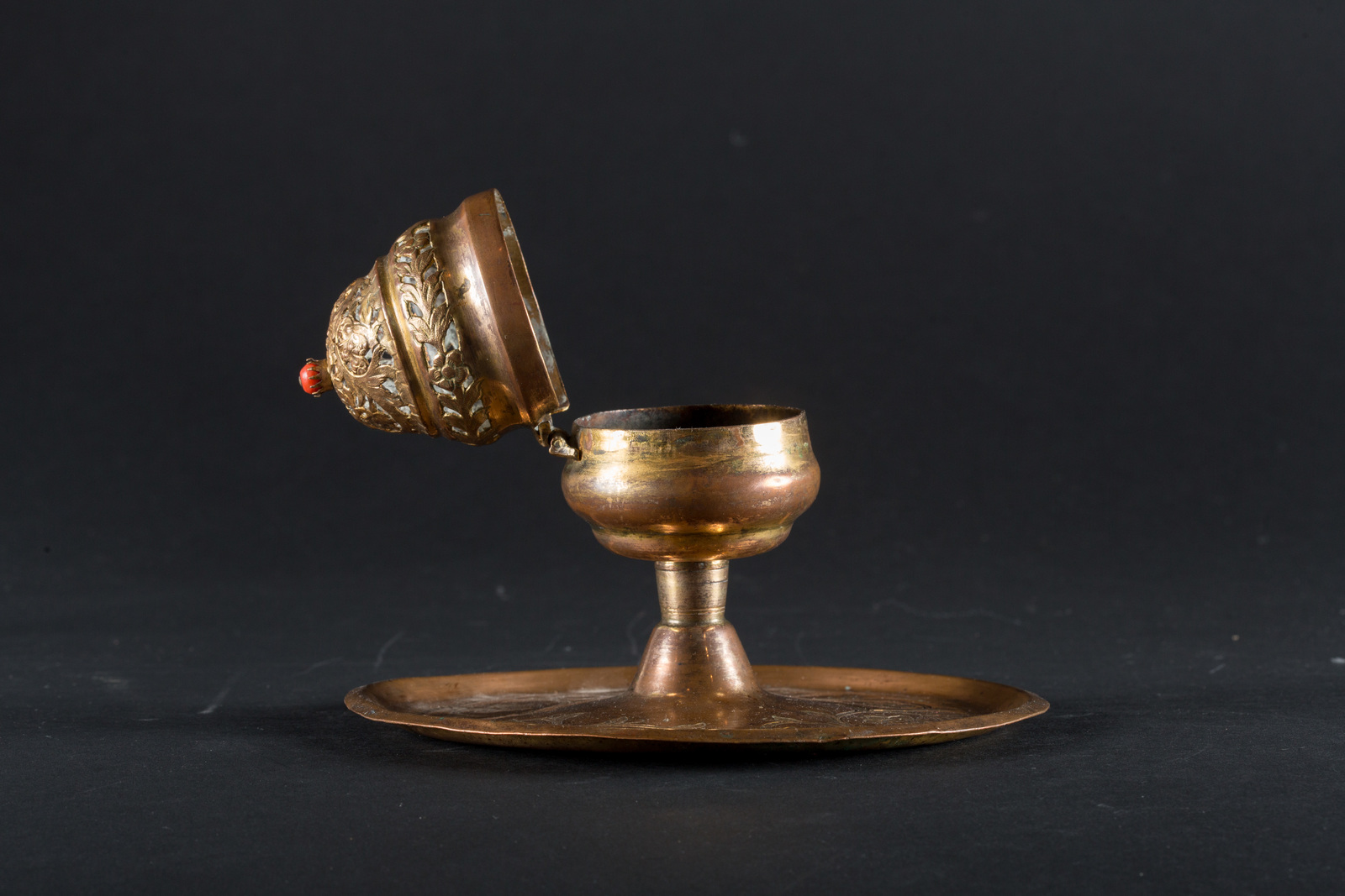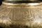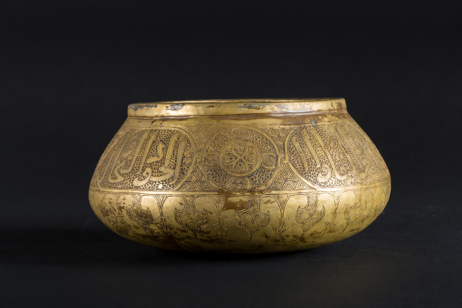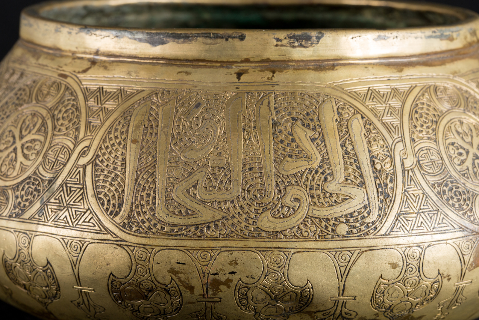 Iran, XIV secolo . -. Cm 24,50 x 12,50. Di forma circolare, decorata con riserve calligrafiche e rosoni alternati su sfondo di ruote dentate su fondale geometrico. Sotto questa banda decorativa incisioni di palmette di diverse dimensioni pendenti verso la base.