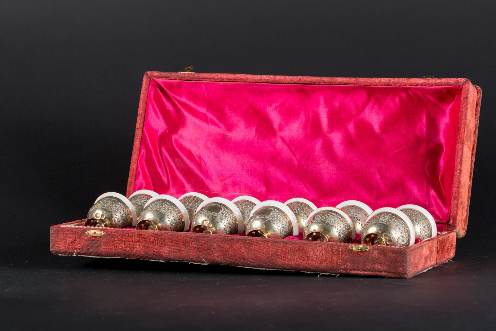 Arte Islamica Twelve zarfs in European porcelain and Ottoman silver setting with Sultan Abdulhamid II (r. 1876 - 1909) tughra in a velvet covered box Ottoman Turkey, late 19th century . . Cm 6,00 x 5,50.