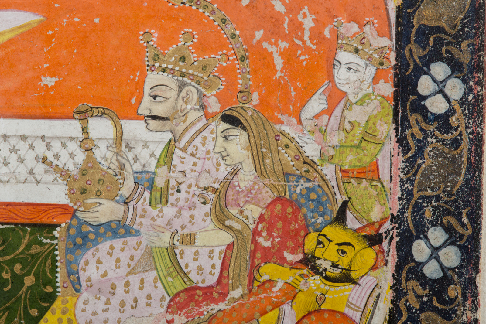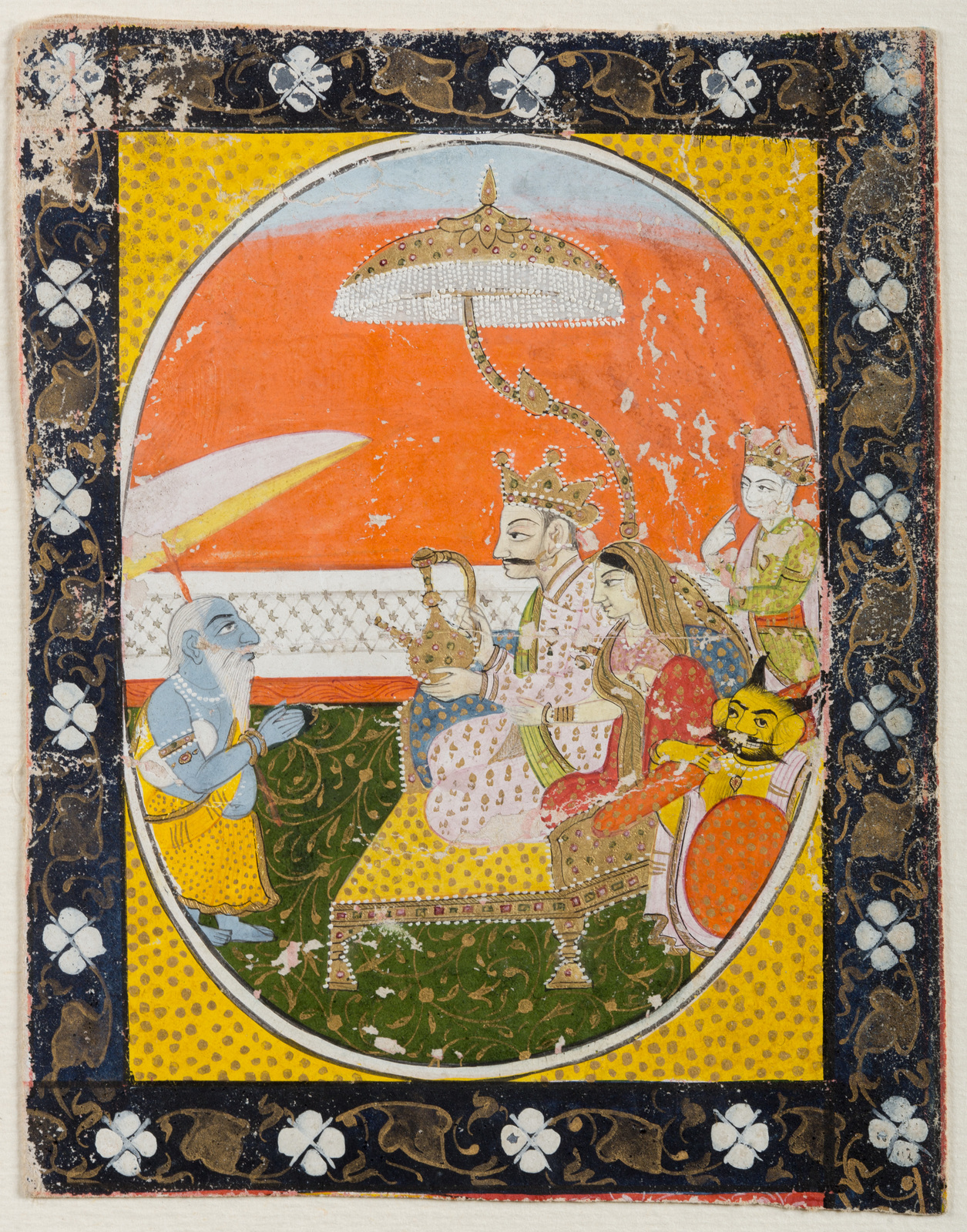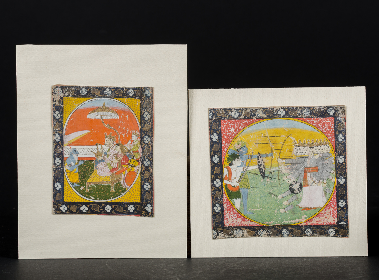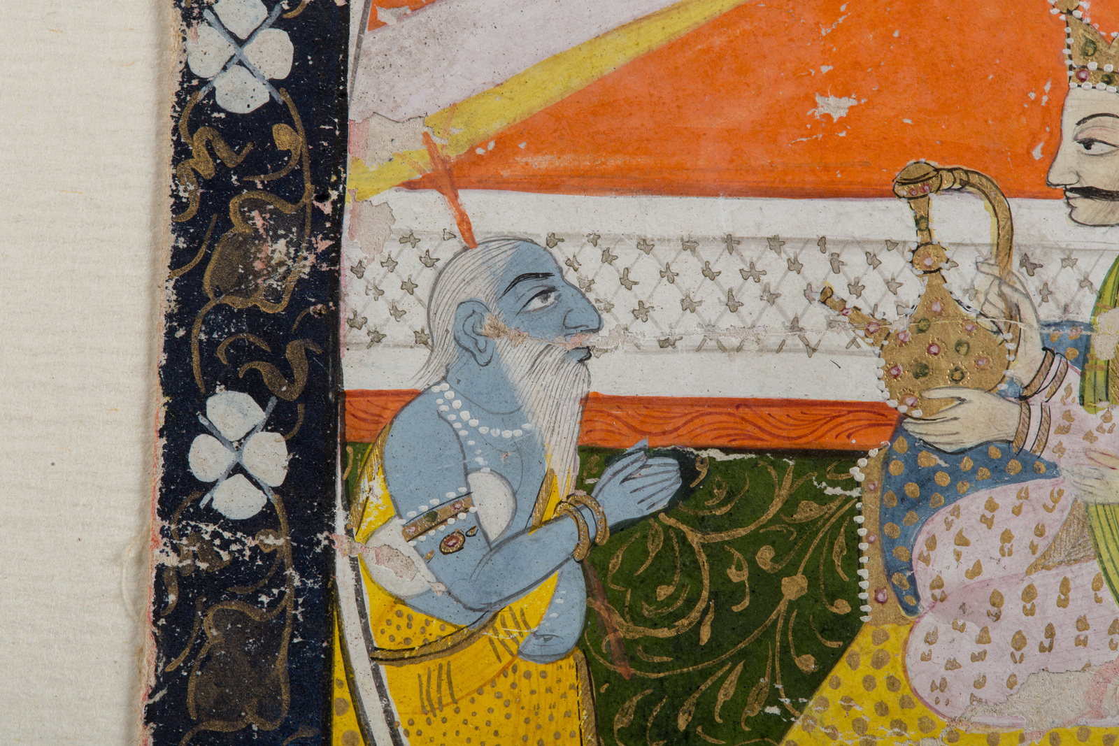 India, Kangra, XIX secolo . -. Cm 14,00 x 17,50. L'una raffigurante Vamana, il nano, avatar di Vishnu, che si presenta sotto le mentite spoglie del brahmino nano al re Bali chiedendogli la terra per insediarsi. Per convincere il re, il brahmino gli garantisce che avrebbe ricevuto tanta terra quanta riusciva a coprirne con tre passi, ma trattandosi in realtà di Vishnu, i suoi tre passi coprirono i tre mondi.
