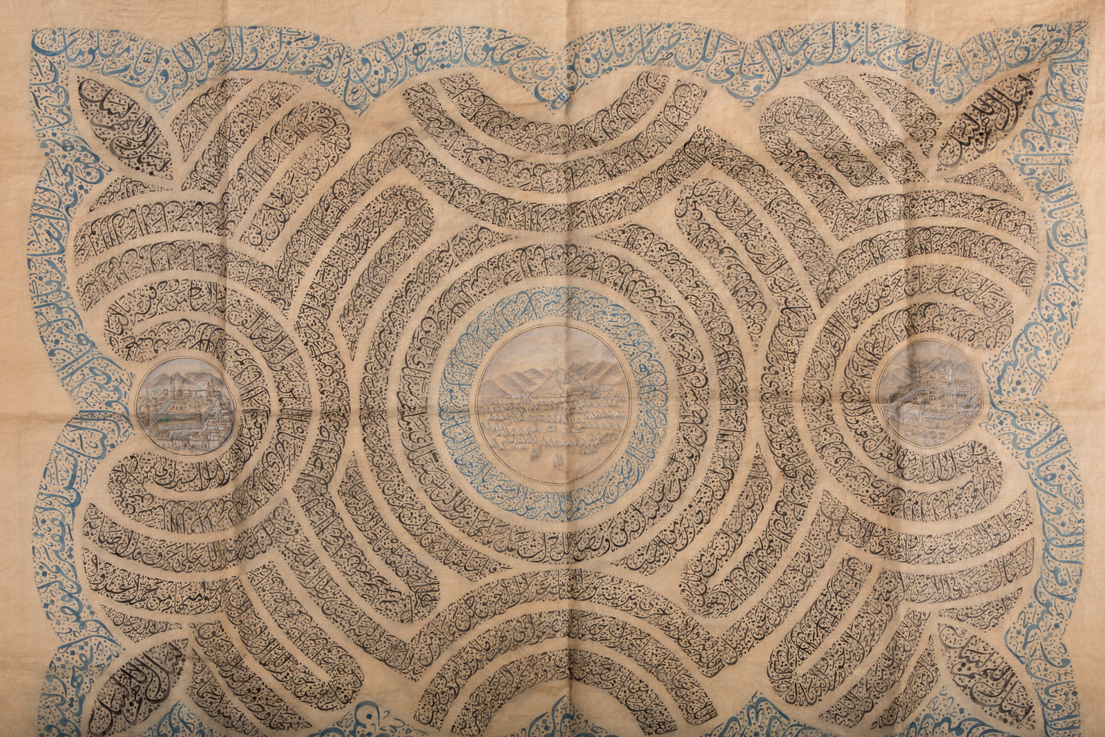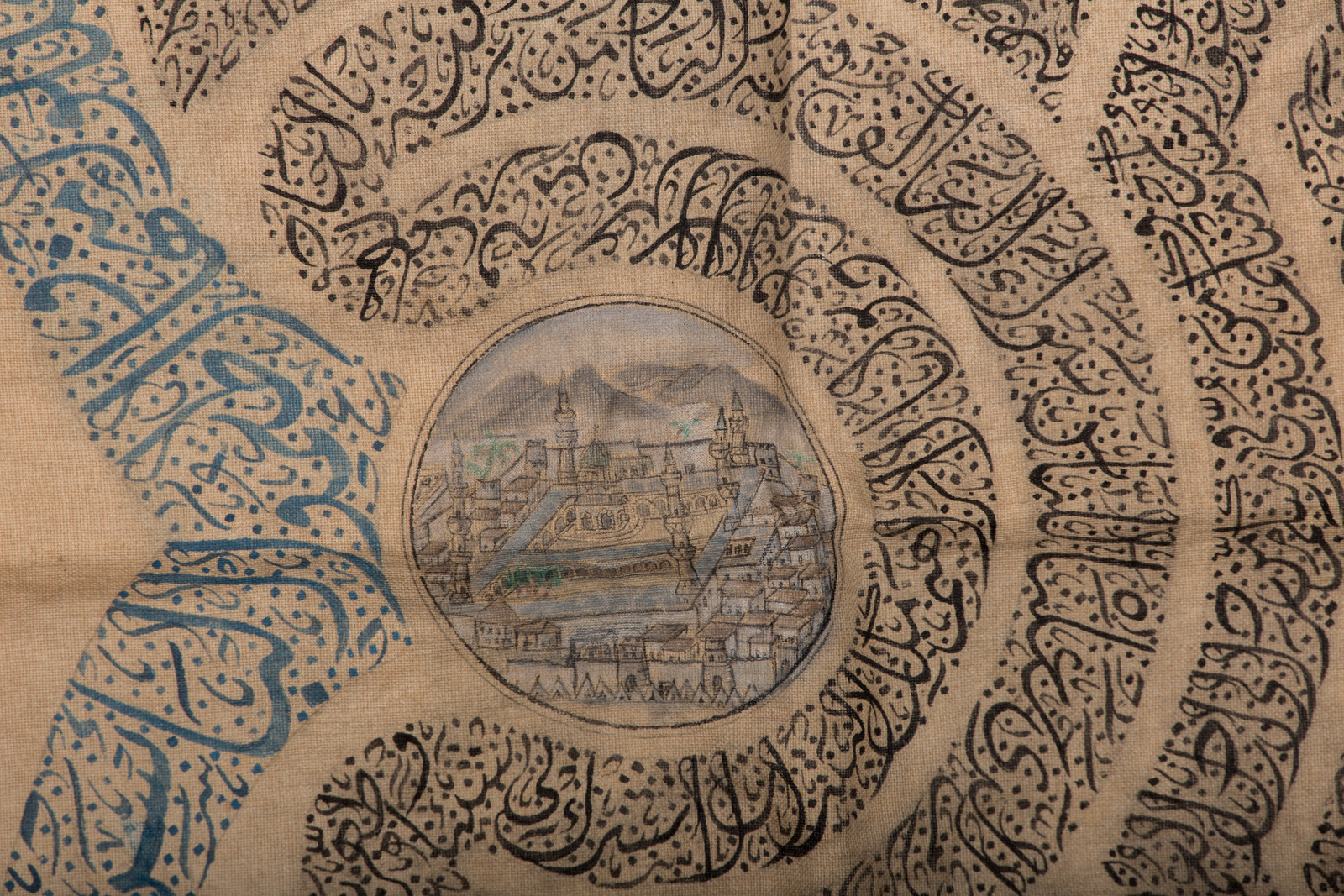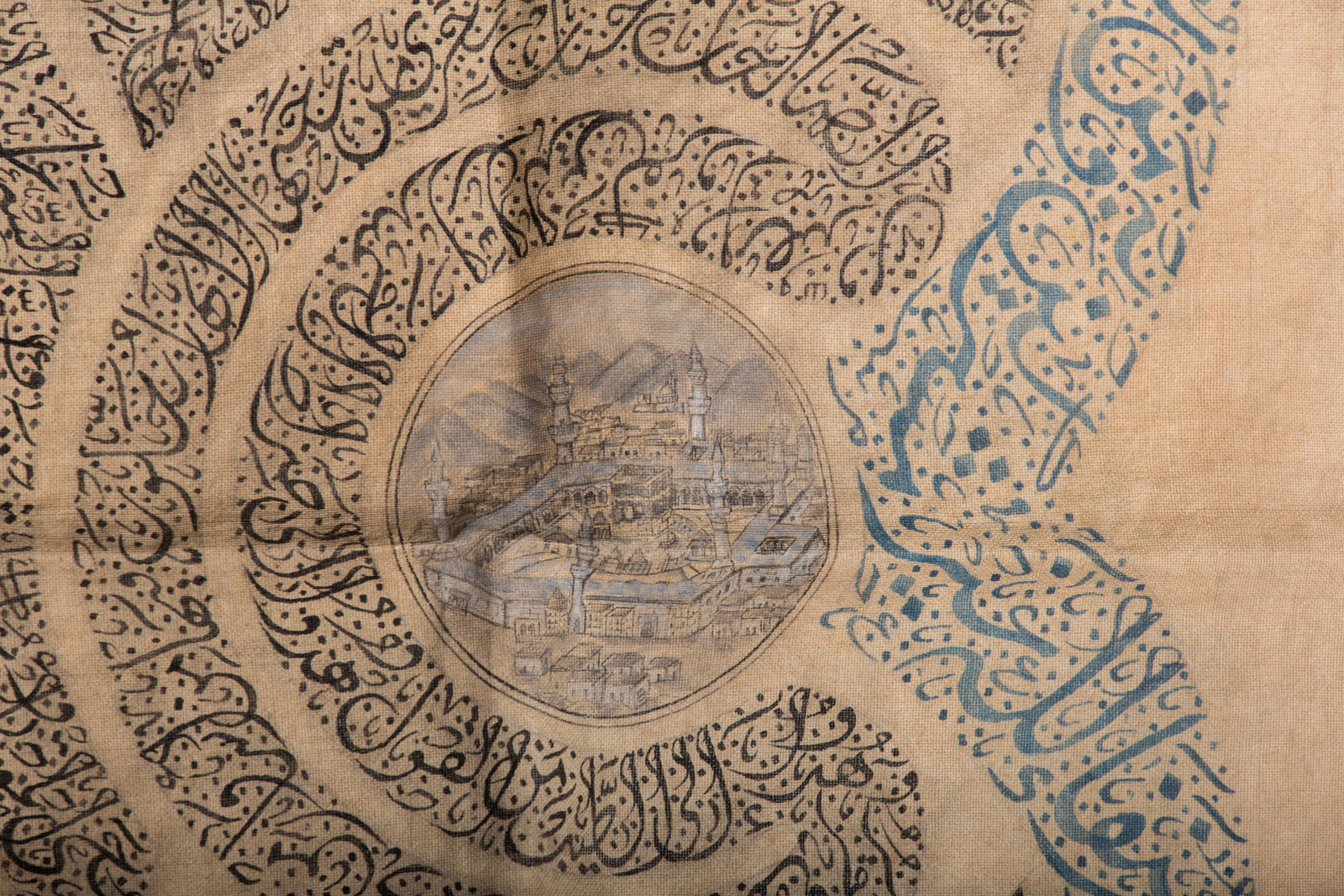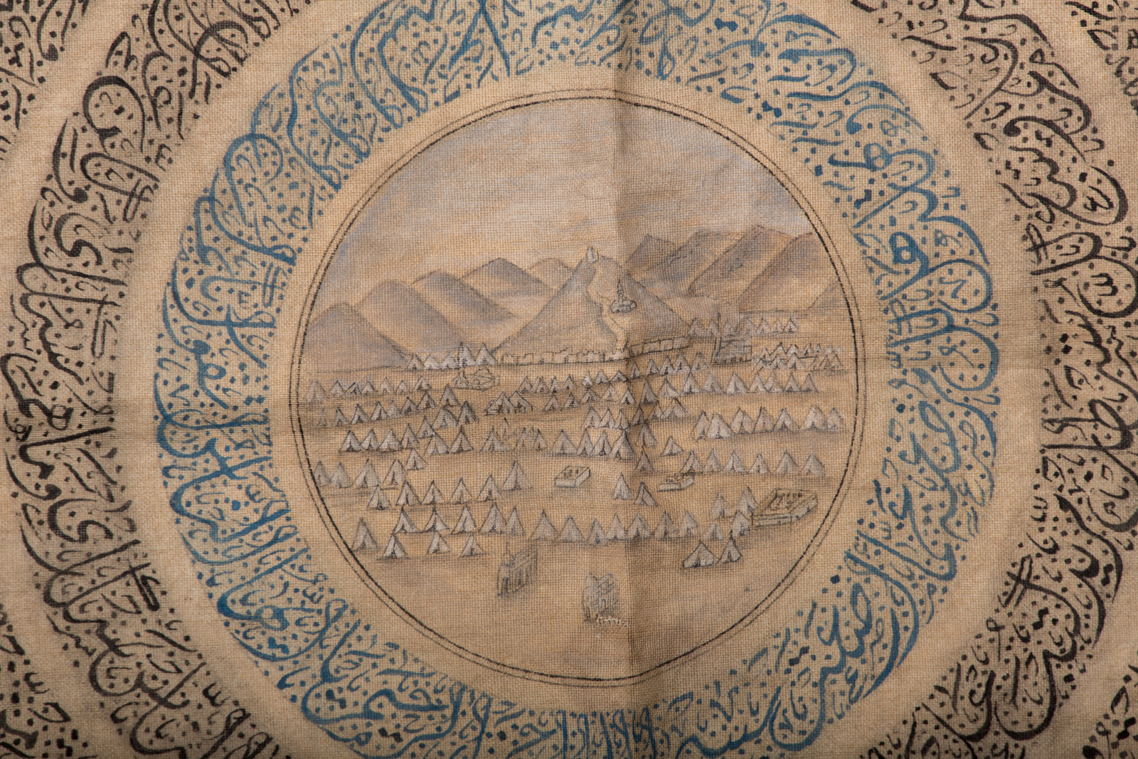 Turchia, tardo XIX - XX secolo . -. Cm 80,00 x 60,00. In cotone, con asole sul retro per poter essere appeso, dipinto con vortici di iscrizioni tratte dal Corano scritte con inchiostro nero. Il bordo esterno presenta profili lobati ed iscrizioni più ampie in inchiostro blu, nella zona mediana tre medaglioni dipinti con immagini di La Mecca, Medina e della Grotta di Hara. Nei quattro angoli cartucce a forma di foglia contenenti il Talbiyah, ovvero una delle preghiere più comuni durante il pellegrinaggio rituale.
